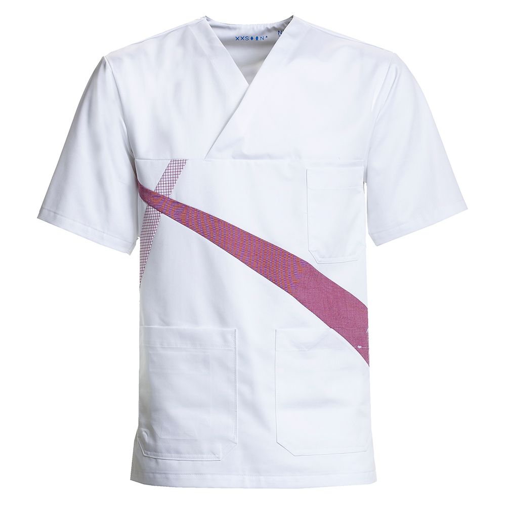 Den unisex busserongen fra Nybo Workwear A/S er en ideell løsning for både herrer og damer som jobber i helsesektoren. Denne hvit-bordeaux busserongen kombinerer stil og funksjonalitet og gir et smart utseende med sine to tverrgående linjer. Den er utstyrt med to romslige hoftelommer; i den venstre lommen er det en praktisk nøkkelstropp, mens den høyre lommen har en dobbeltlomme for ekstra lagring. Brystlommen på venstre side er perfekt for penner, navneskilt og lignende, og stroppen i nakken gjør det enkelt å henge opp busserongen etter bruk.