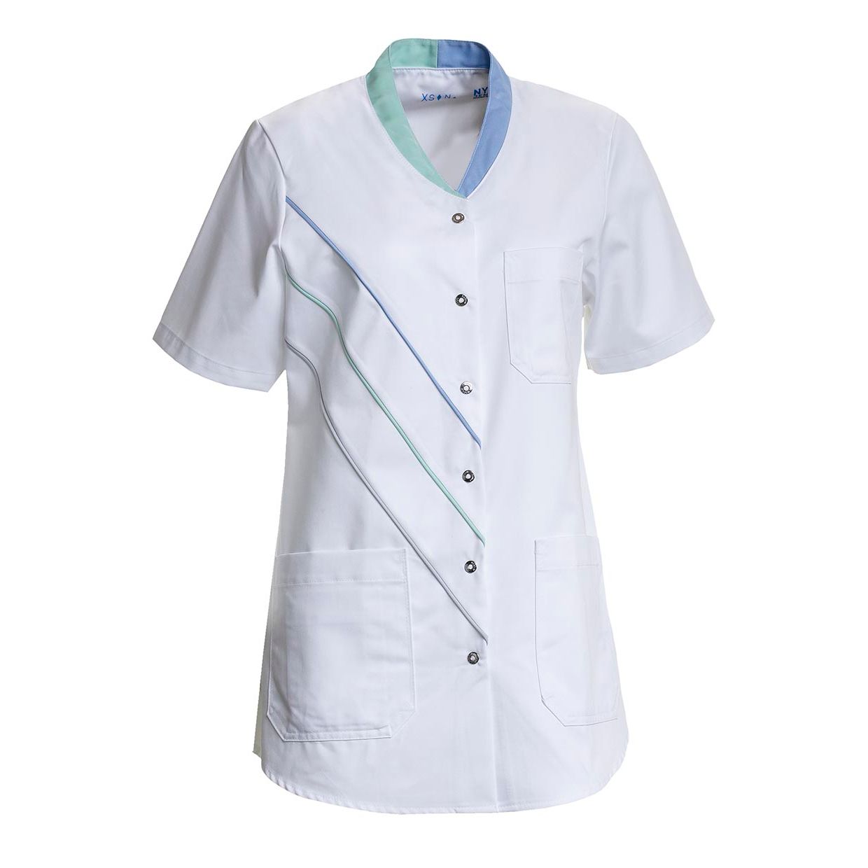 Nybo Workwear A/S presenterer en elegant og funksjonell dametunika, perfekt for profesjonelle i helsevesenet. Tunikaen, som fås i fargene hvit/lysegrønn/lyseblå samt hvit/oransje/rød og hvit/rød/grå, er laget i en kvalitetsmateriale-blanding av 50% polyester og 50% bomull med en vekt på 215 g/m².