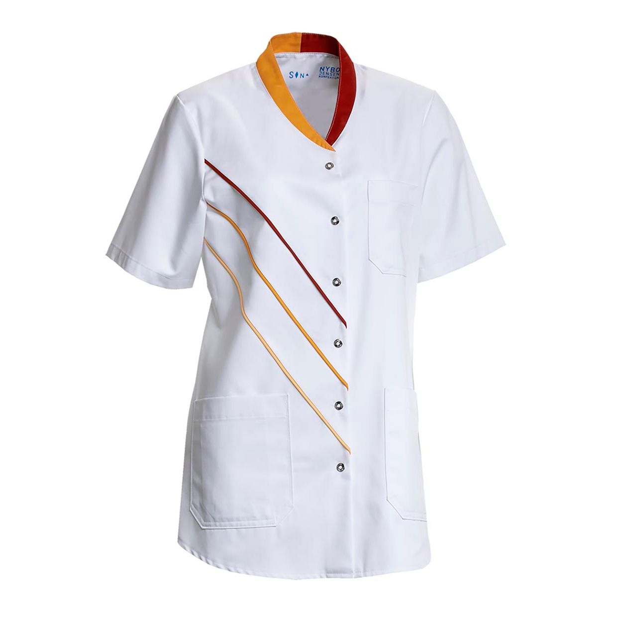 Opplev en optimal kombinasjon av funksjonalitet og stil med Nybo Hvit/Oransje/Rød Dame Feel Free Tunika fra Nybo Workwear A/S. Denne dametunikaen er designet med praktiske detaljer for å gjøre arbeidsdagen din lettere. De to hofteommene, hvor den venstre er utstyrt med en praktisk nøkkelstropp og den høyre med en praktisk dobbel lomme, gir deg enkel tilgang til dine viktigste verktøy. Den venstre brystlommen er perfekt for oppbevaring av kulepenner, navneskilt og lignende nødvendigheter. Lukkemekanismen med trykknapper og flex fix-knapper er spesielt utviklet for å tåle industriell vask, noe som gjør tunikaen svært holdbar og praktisk.