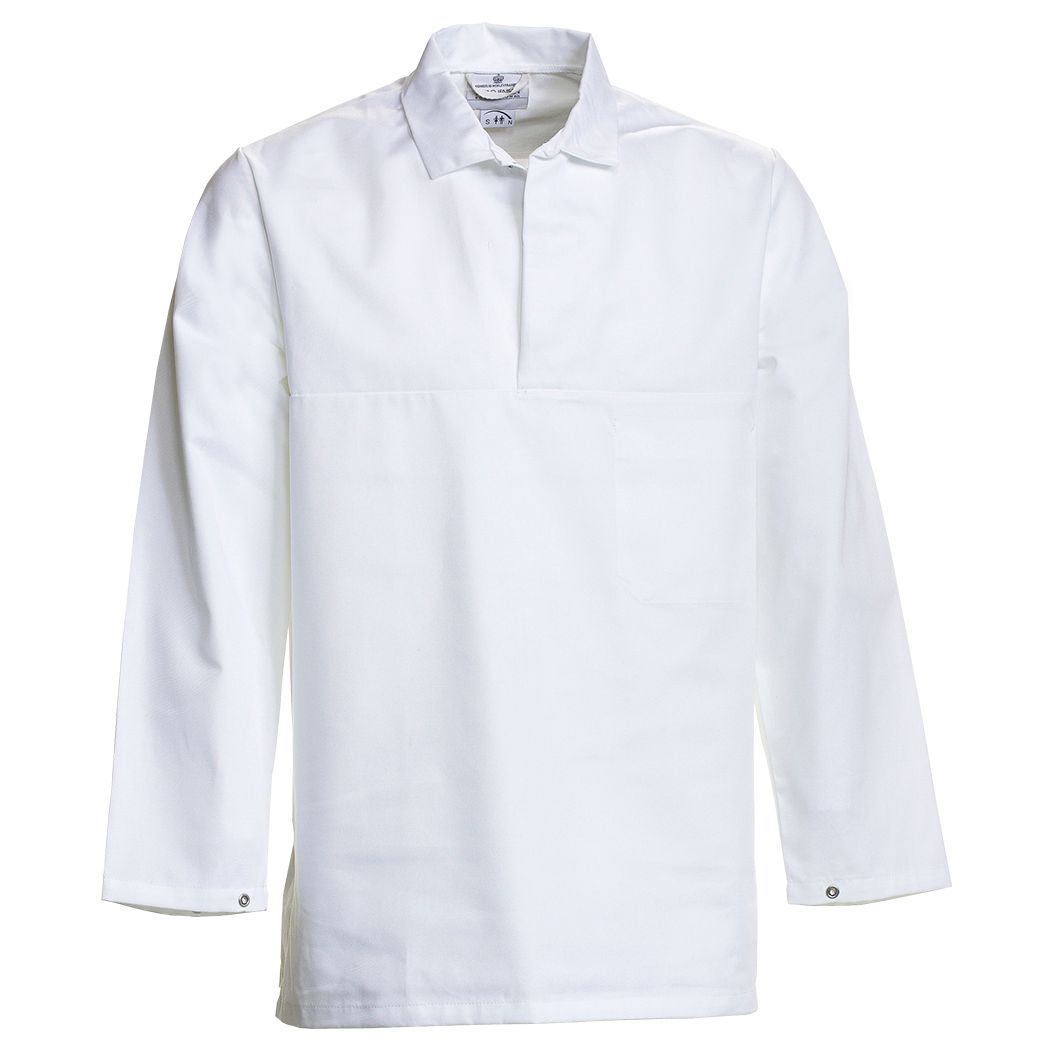 Nybo Hvit Unisex HACCP Busseronne er et praktisk og holdbart klesplagg, som er designet for de høye kravene i næringsmiddelindustrien. Denne unisex-busseronne har en klassisk krage og er utstyrt med en innvendig brystlomme på venstre side for å oppfylle sikkerhetsstandardene. Ermeåpningene kan enkelt justeres med trykknapper, og den skjulte trykknapplukkingen i stolpen sørger for et rent og profesjonelt utseende. Den rette fasongen og den ekstra lengden på baksiden sikrer optimal dekning og komfort.
