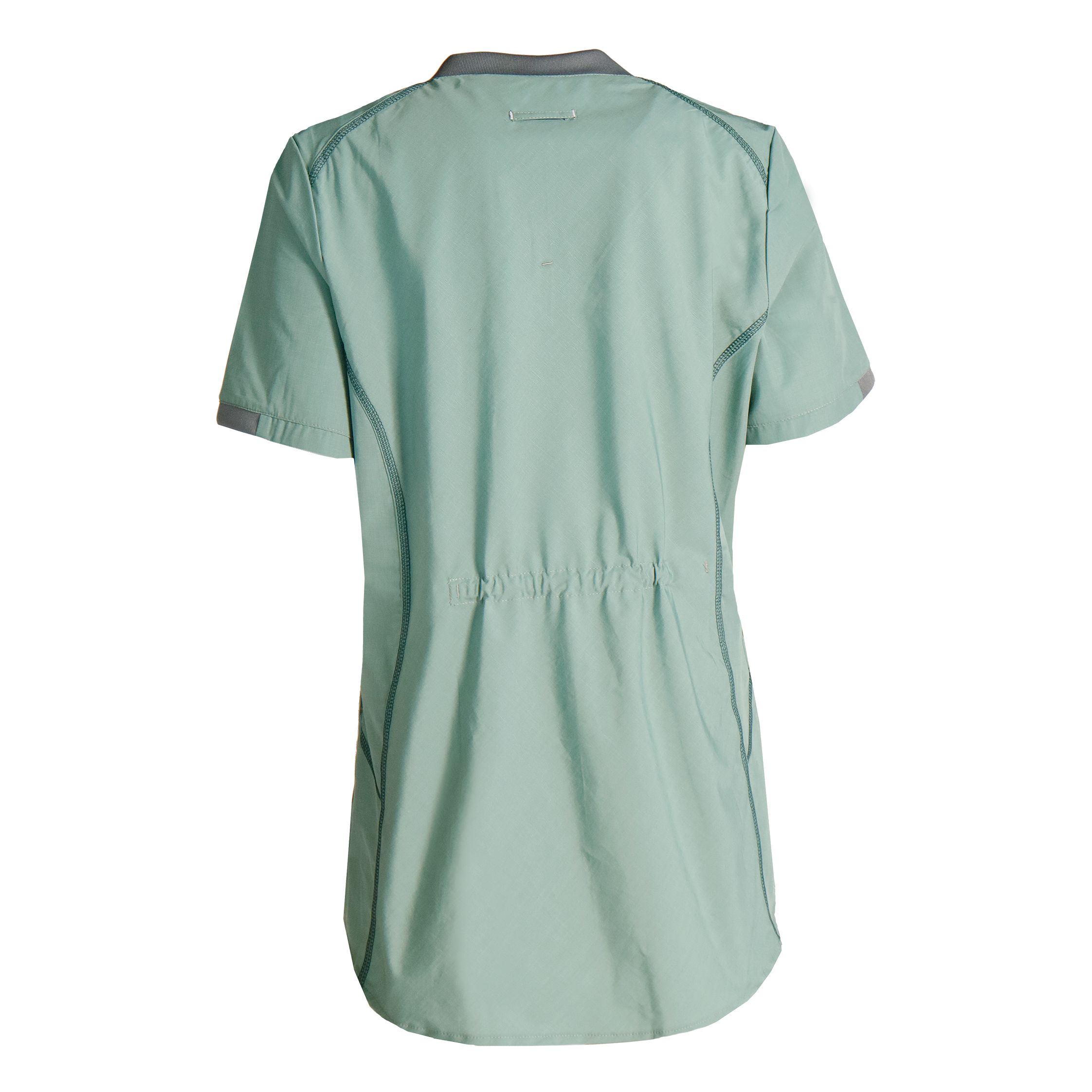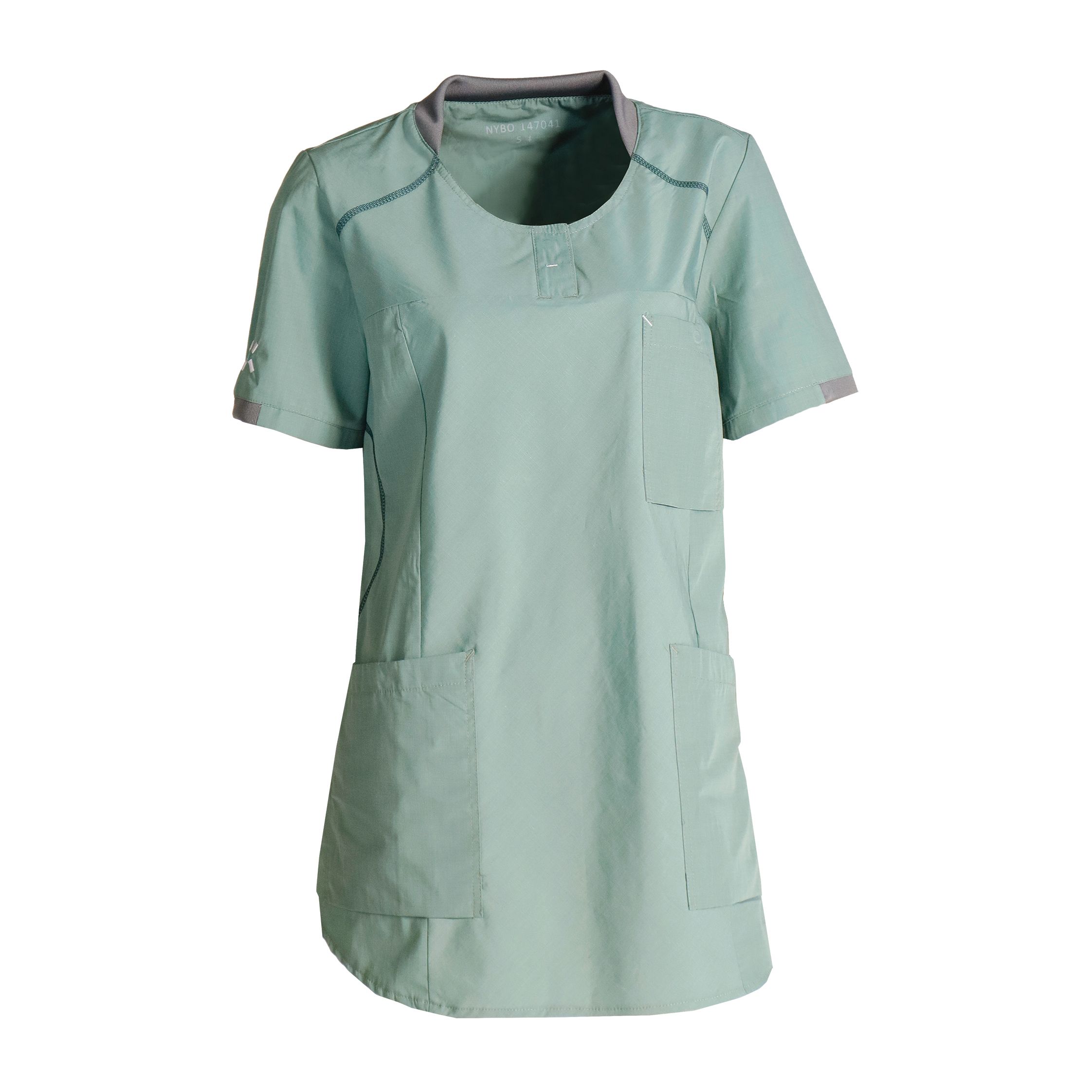 Nybo Workwear A/S presenterer denne sporty og komfortable Nybo Lysegrønn Damebusseronne, som tilbyr både stil og funksjonalitet. Den lett innsvingede busseronnen har en halsåpning med skjulte trykknapplukkinger i stolpen samt en myk ribb i nakken, som sikrer ekstra komfort. Den stretchbare kvaliteten i bryststykket og ryggen gir en utmerket fleksibilitet, mens den smarte justeringen i ryggen gir mulighet for ekstra innsnerving. Med en romslig brystlomme og hoftelommer som inkluderer nøkkelstropper og integrerte mobillommer, er alle dine eiendeler godt sikret takket være lommenes trykknapper. Busseronnen, som fås i fargene Lysegrønn, Marineblå, Lyseblå, Grå, Mørkegrønn og Bordeaux, har sidelommer for økt komfort og en tilpasset lengde som dekker godt ved bøy og løft.
