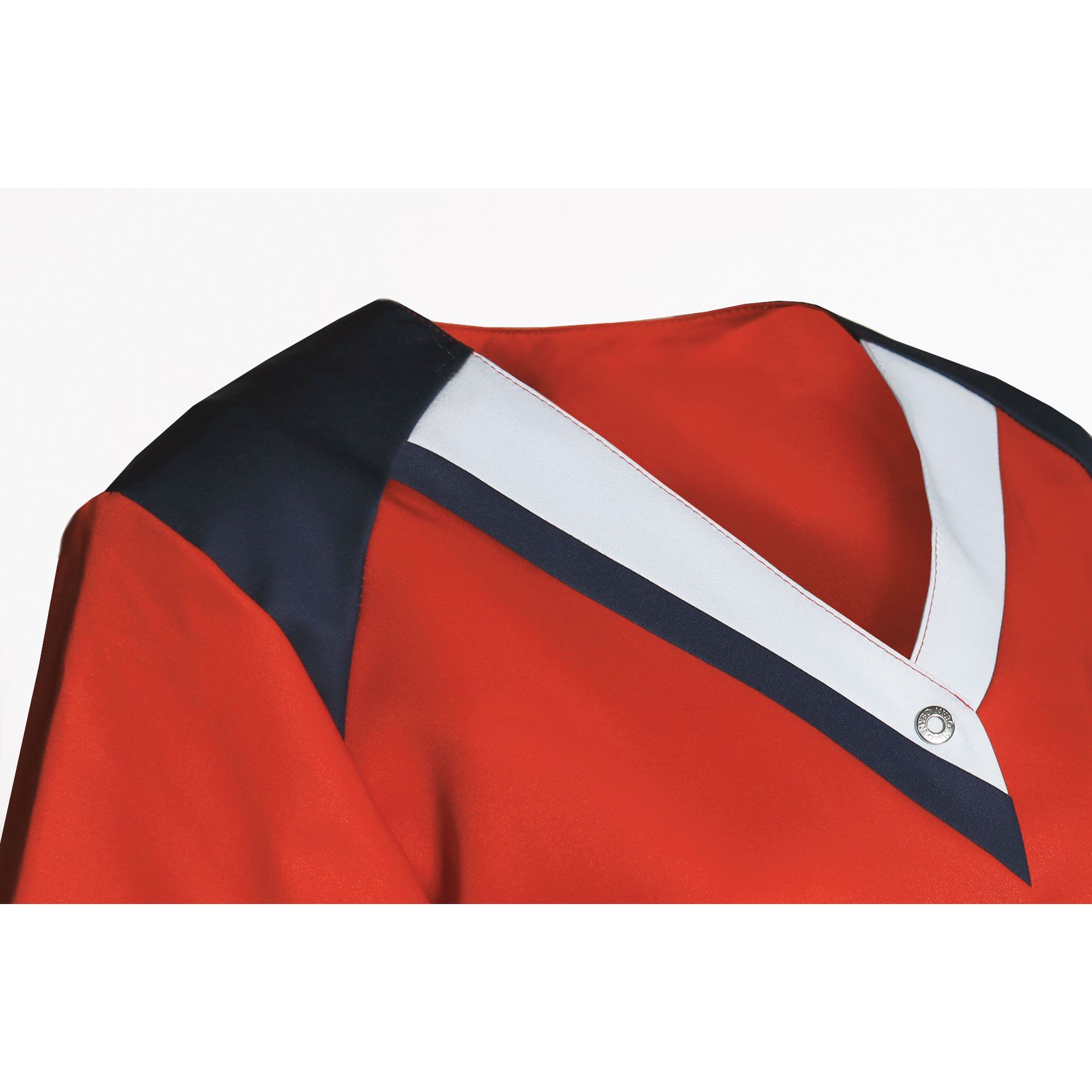 Denne vakre tunikaen fra Nybo Workwear A/S leveres i en sofistikert kombinasjon av rød, lyseblå og marineblå farger. Den innsvingte dametunikaen med lange splitter på sidene sikrer optimal bevegelsesfrihet, samtidig som den elegant dekker hoftene. De moderne ermene dekker overarmene, og den flott formede V-halsen gir et slankende utseende som fremhever hals og ansikt. Praktiske detaljer som brystlomme med stropp til penn eller ID-kort samt to dype hoftelommer med nøkkelstropper gjør denne tunikaen utrolig funksjonell. En ekstra mobil-lomme inne i høyre hoftelomme gjør det enkelt å ha telefonen lett tilgjengelig.