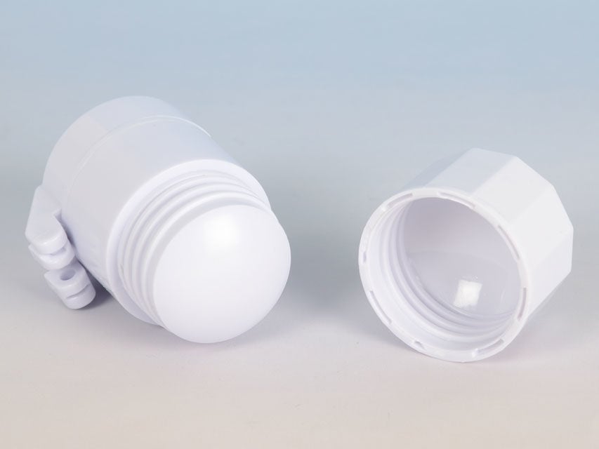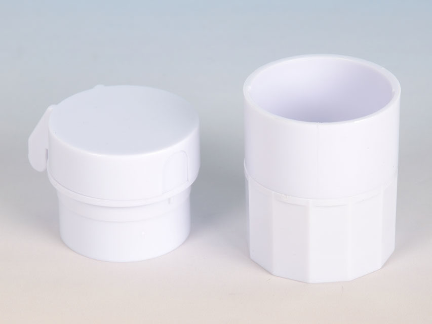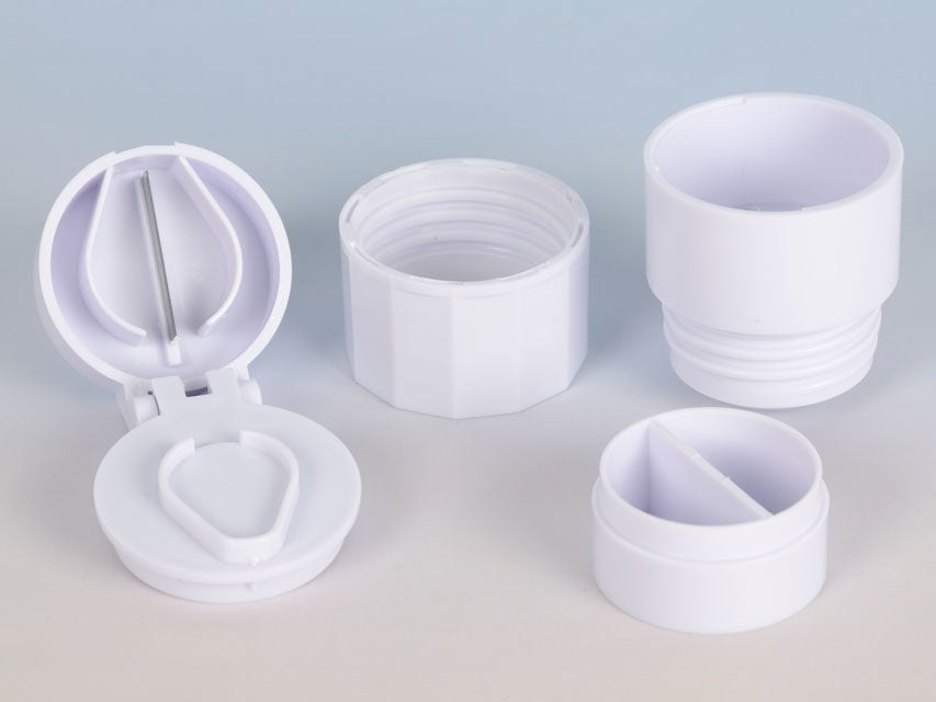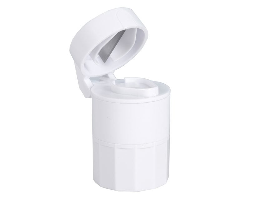 Liten rund praktisk tabletdeler i hvit plast, med kniv i toppen, og med tablettknuser i bunnen.