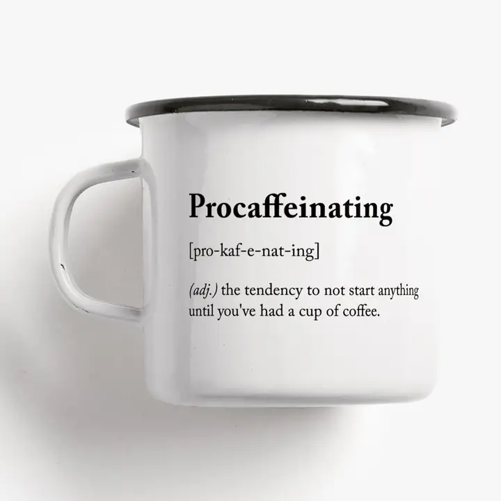 Dette hvite emaljekruset er dekorert med den humoristiske ordspillet Procaffeinating, definert som tendensen til å ikke starte noe før man har fått sin kaffe. Et åpenbart valg for deg som ikke kan komme i gang med dagen uten den første koppen – og som gjerne vil tilføre et smil til morgenstunden.