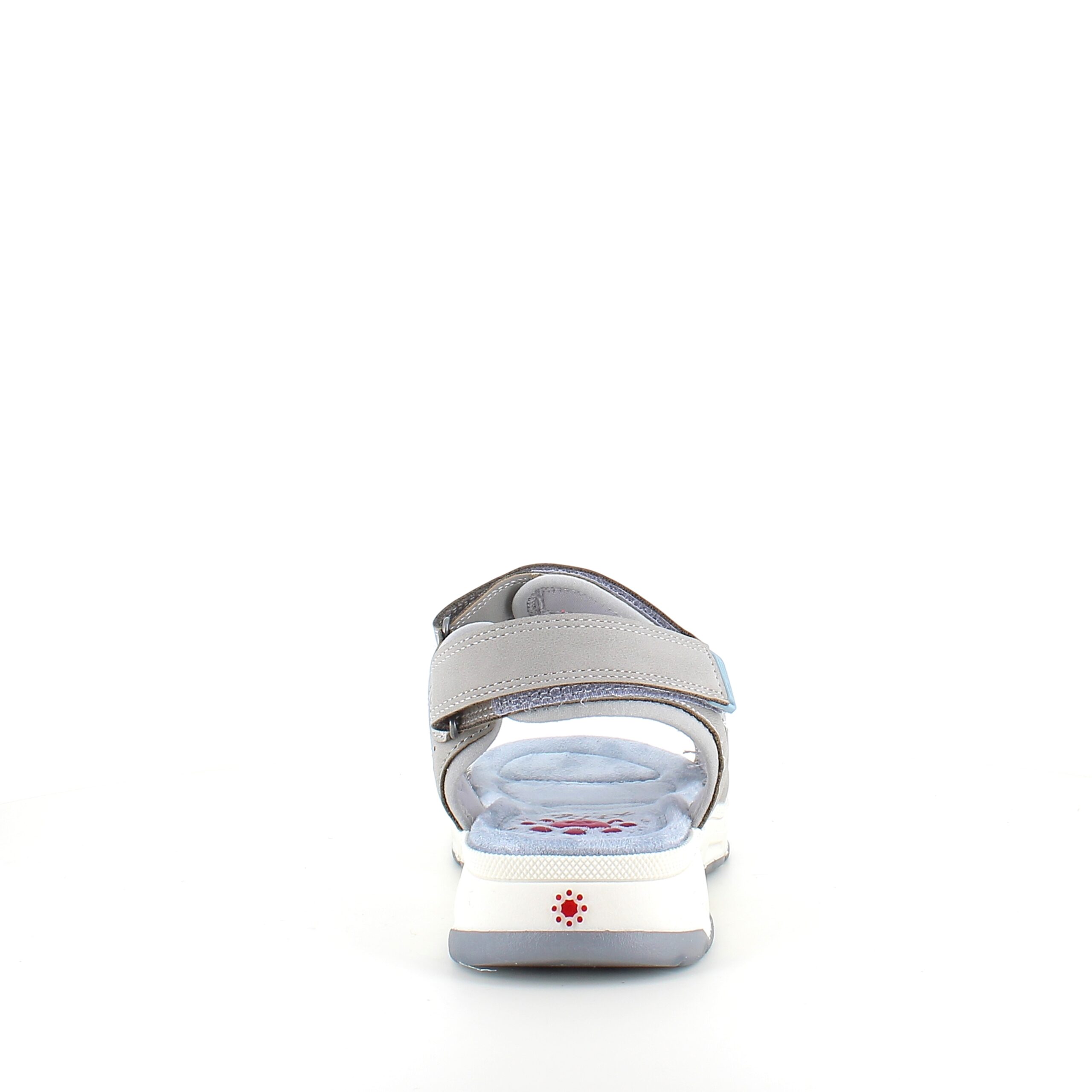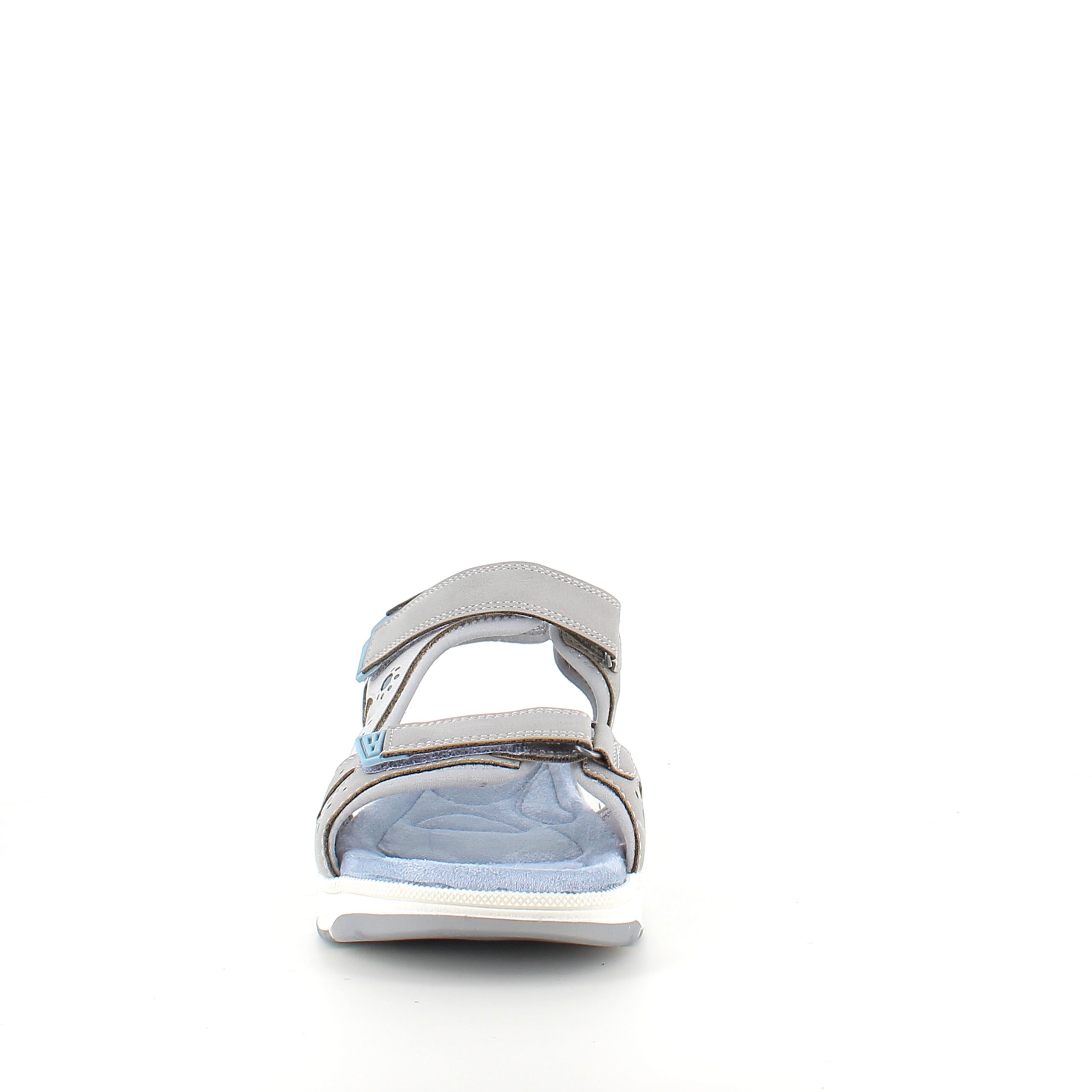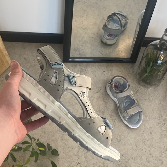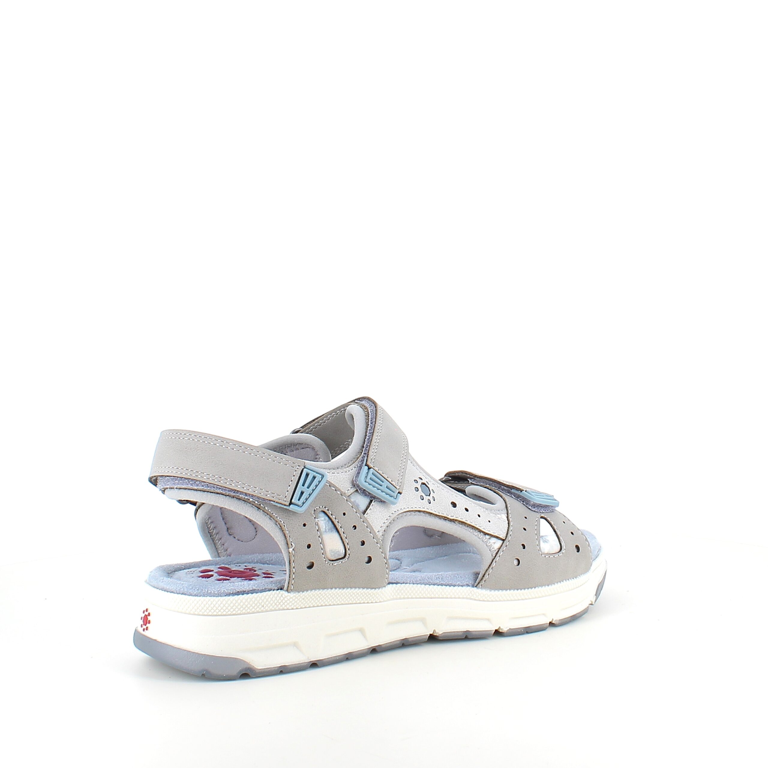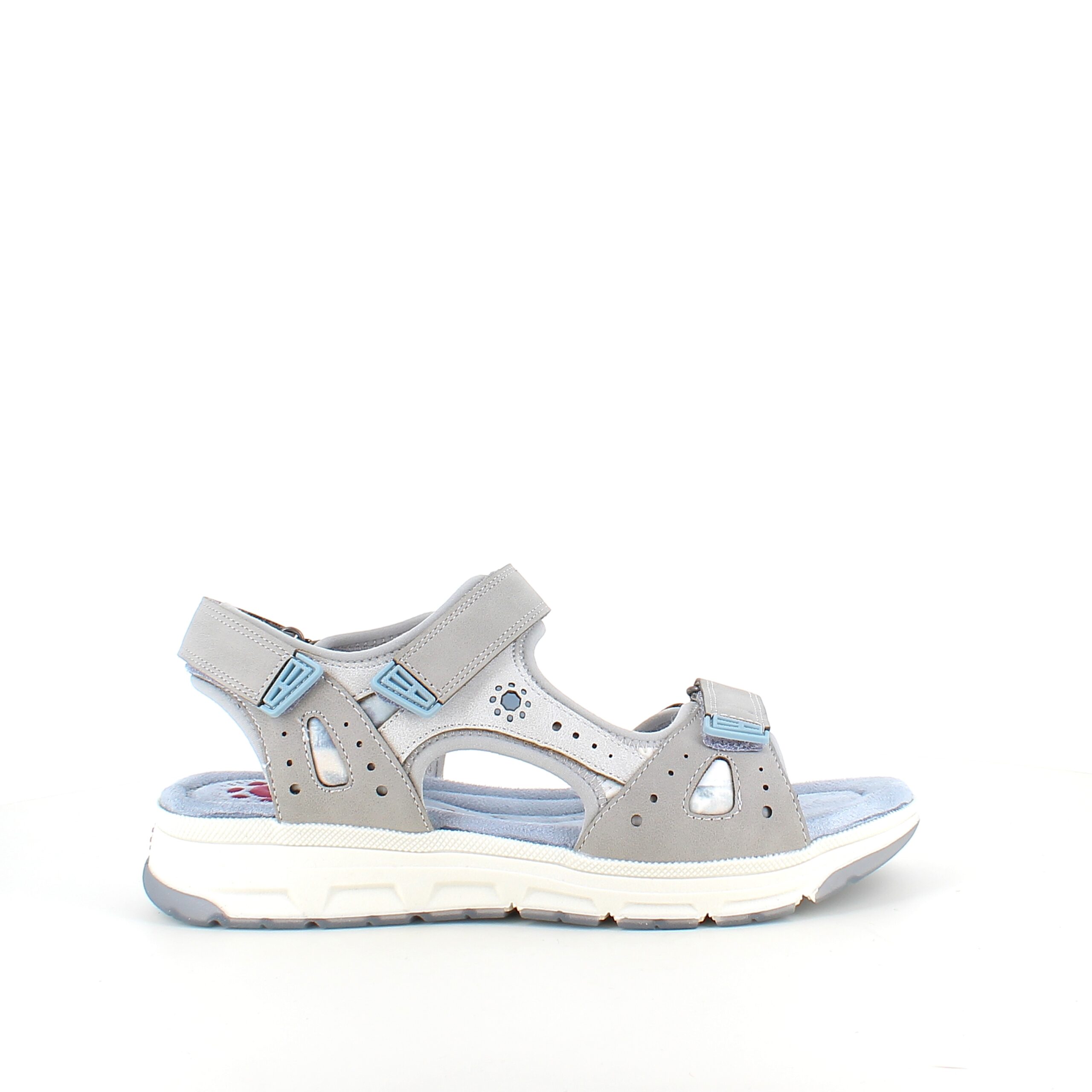 Med et feminint og sporty uttrykk kombinerer denne sandalen et lett sølvgrått design med diskrete lyseblå detaljer og en utrolig behagelig passform. Sandalen har hele tre justerbare borrelåsreimer – én over forfoten, én over vristen og én ved hælen – slik at du enkelt kan tilpasse den til nettopp din fot.