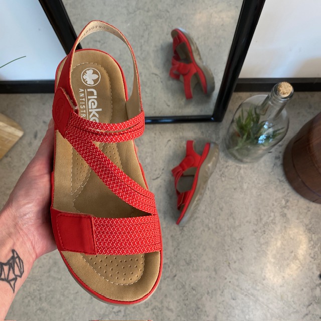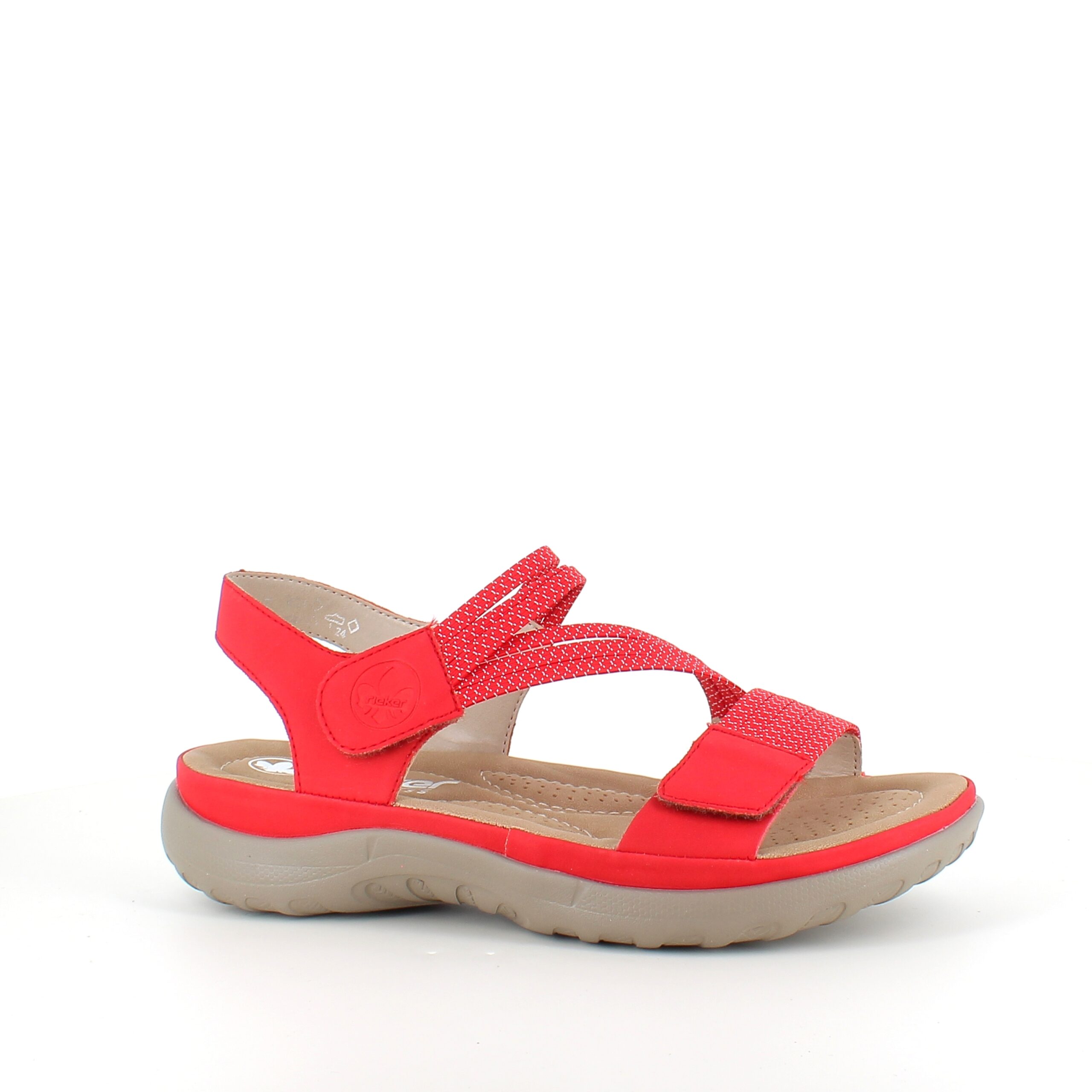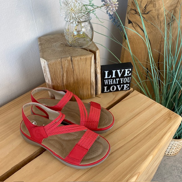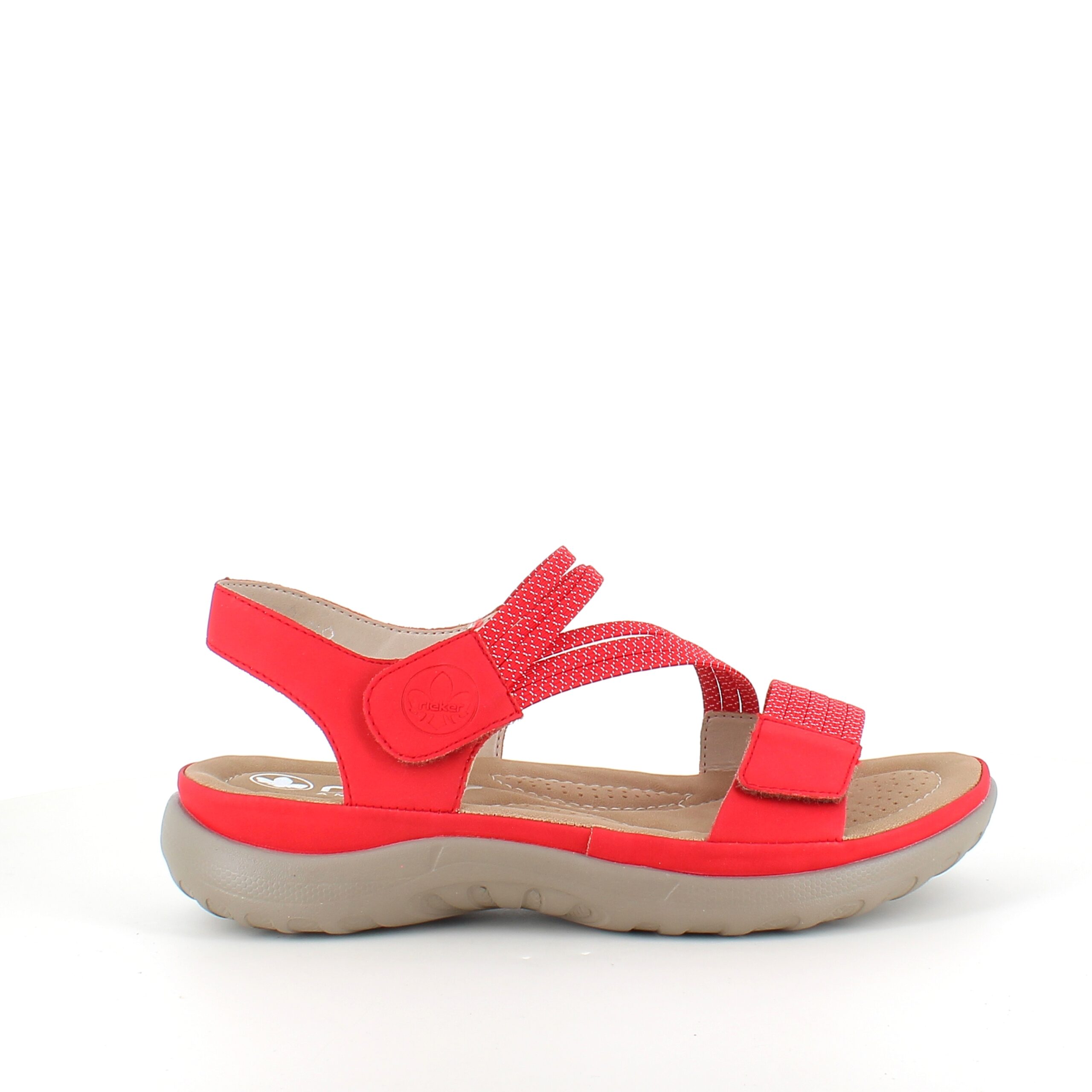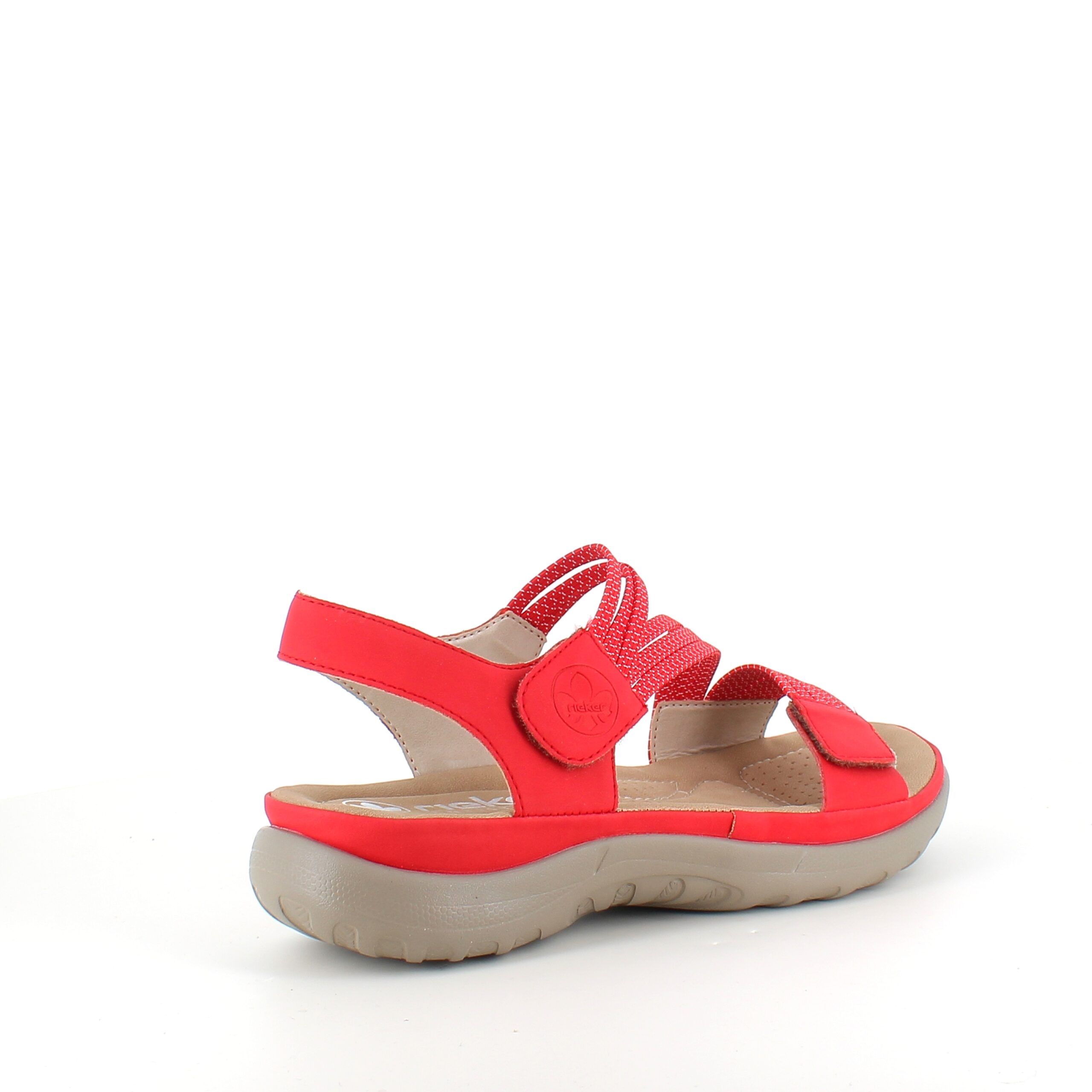 Rød sandal fra Rieker med elegante elastiske remmer.