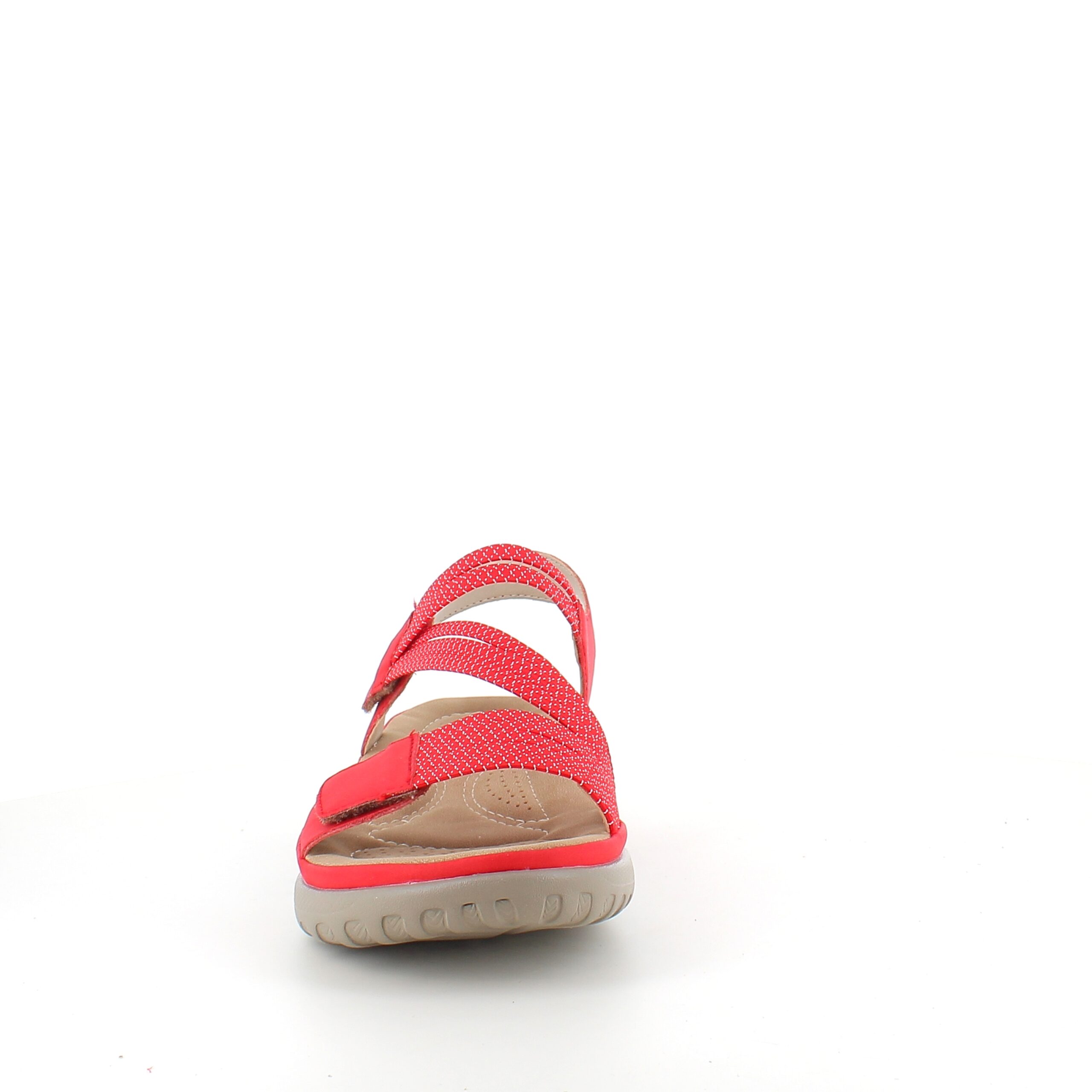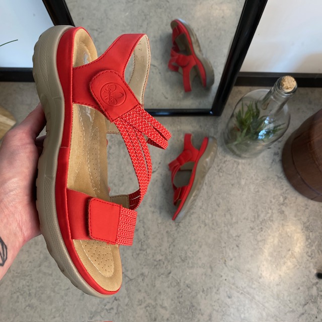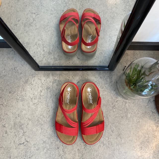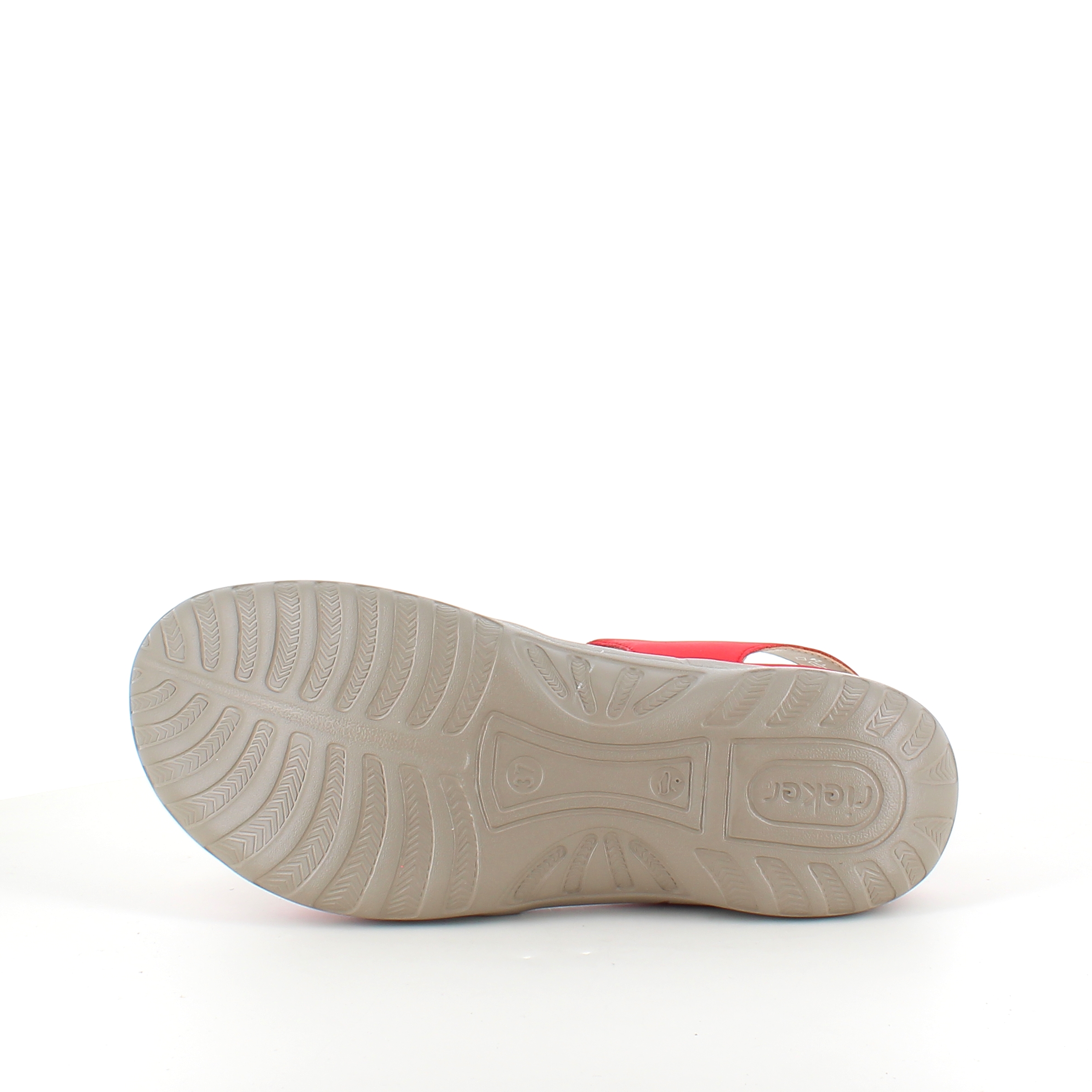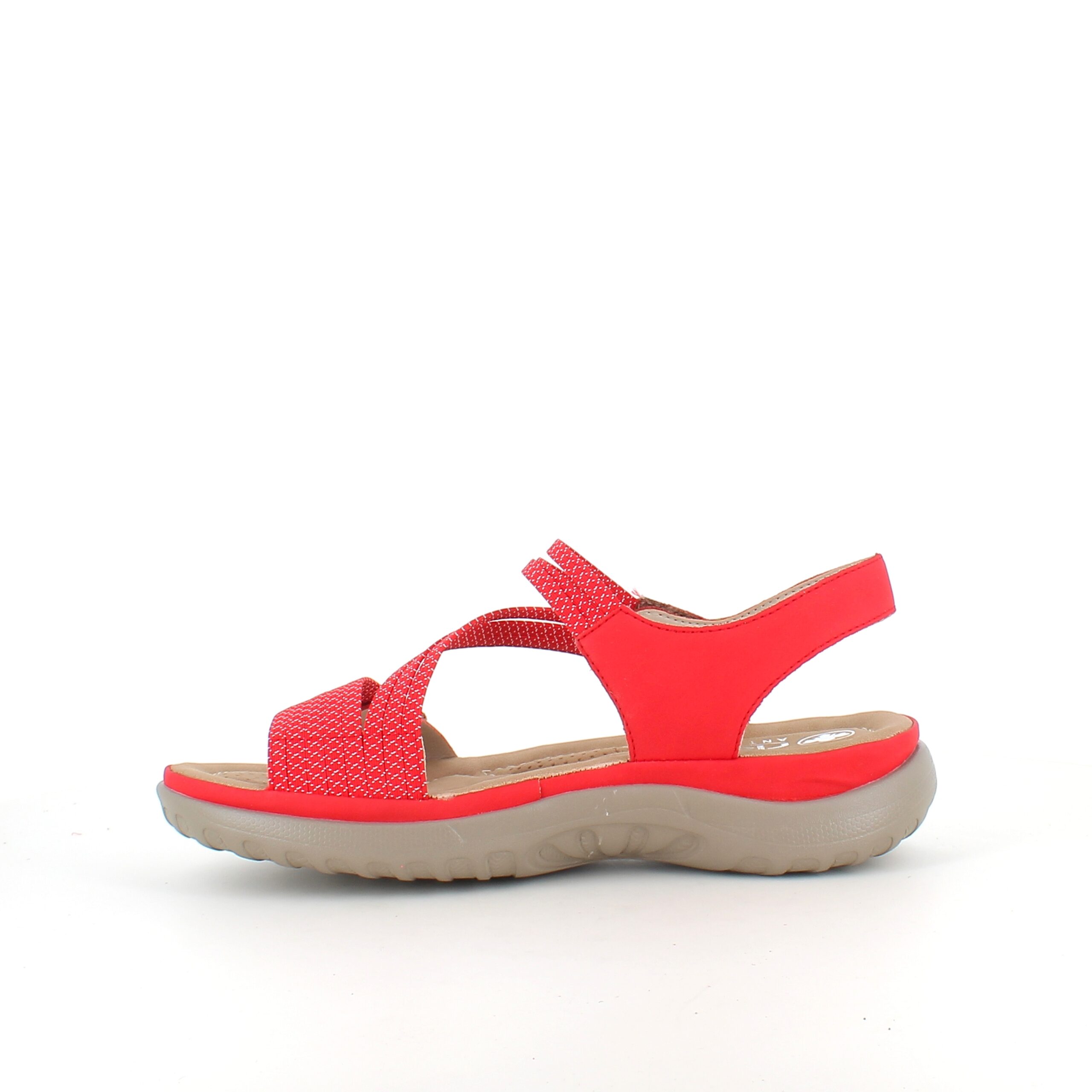 Rød sandal fra Rieker med elegante elastiske remmer.