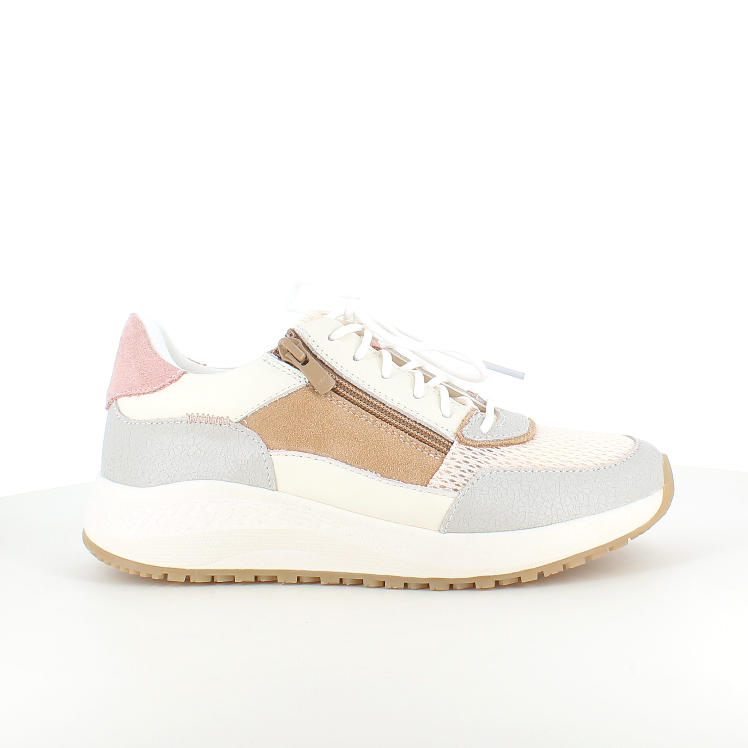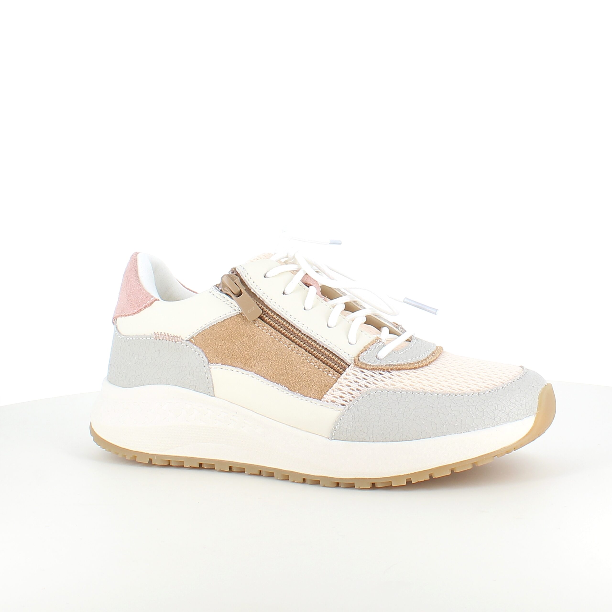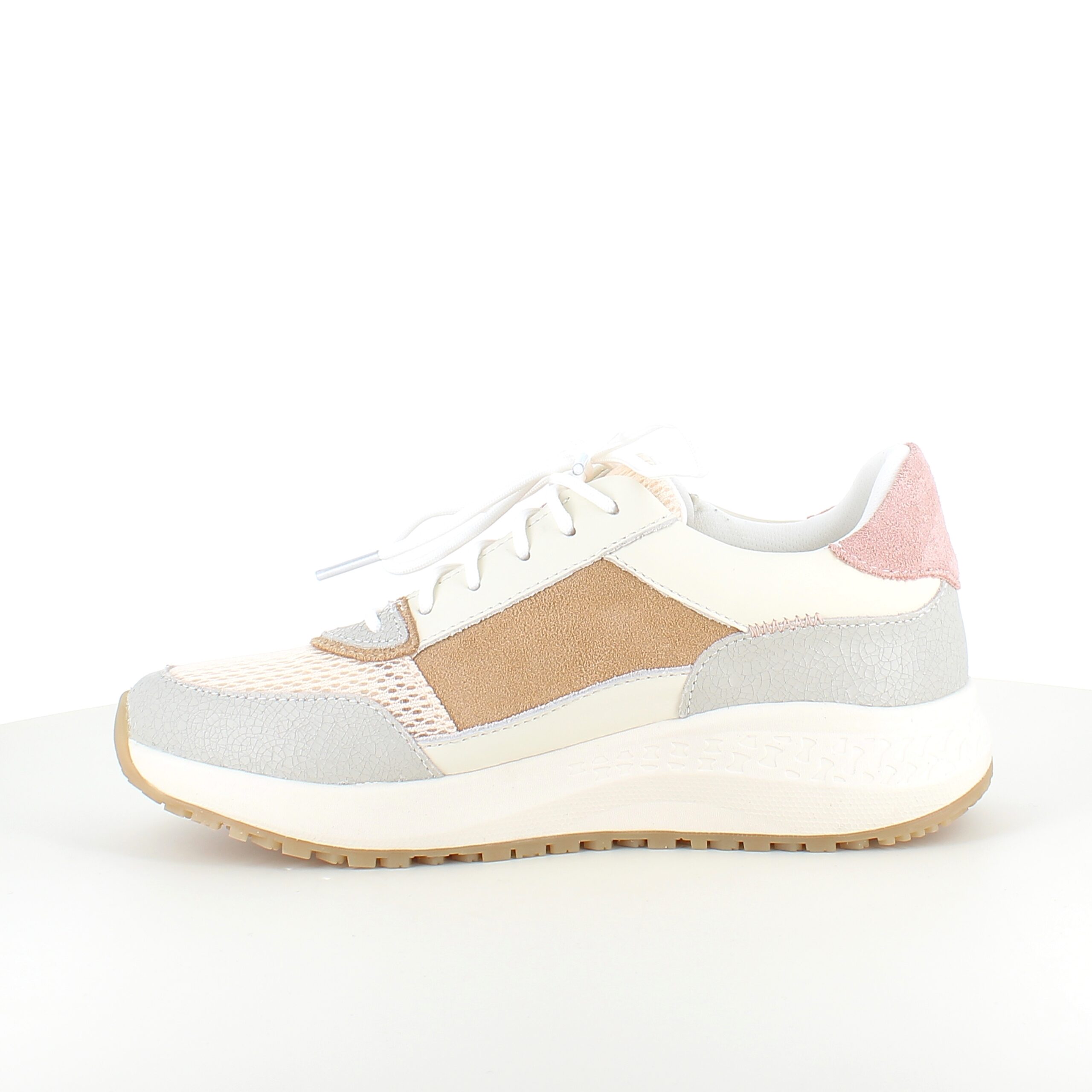 Overmaterialet er laget av kuskinn og vevd tekstil, noe som gir en elegant og slitesterk overdel.
