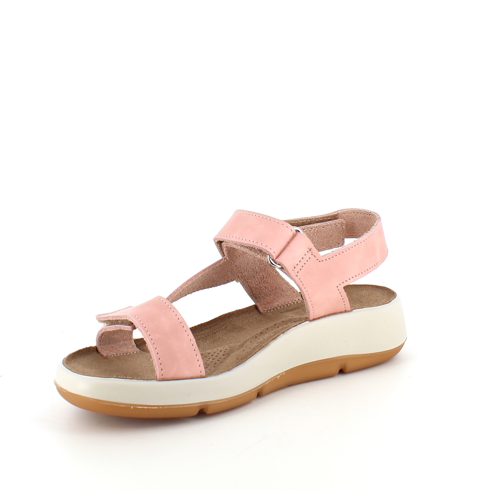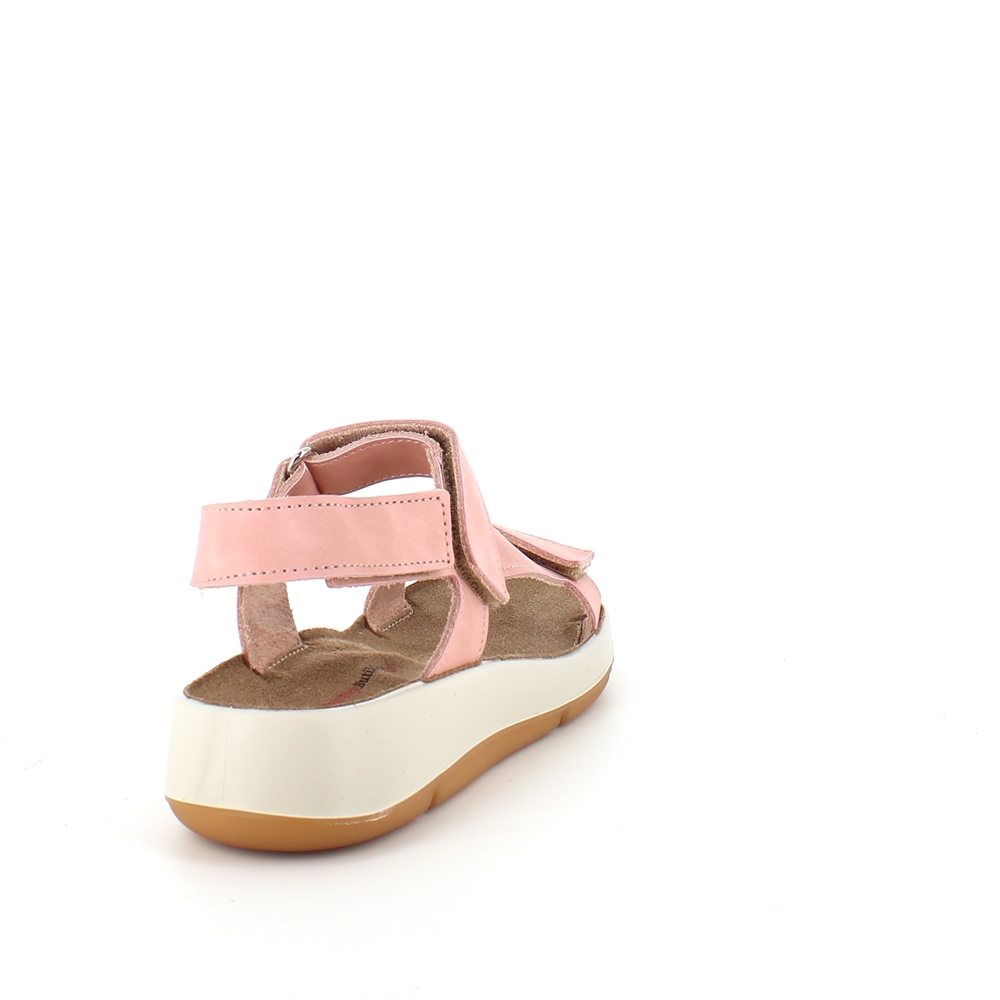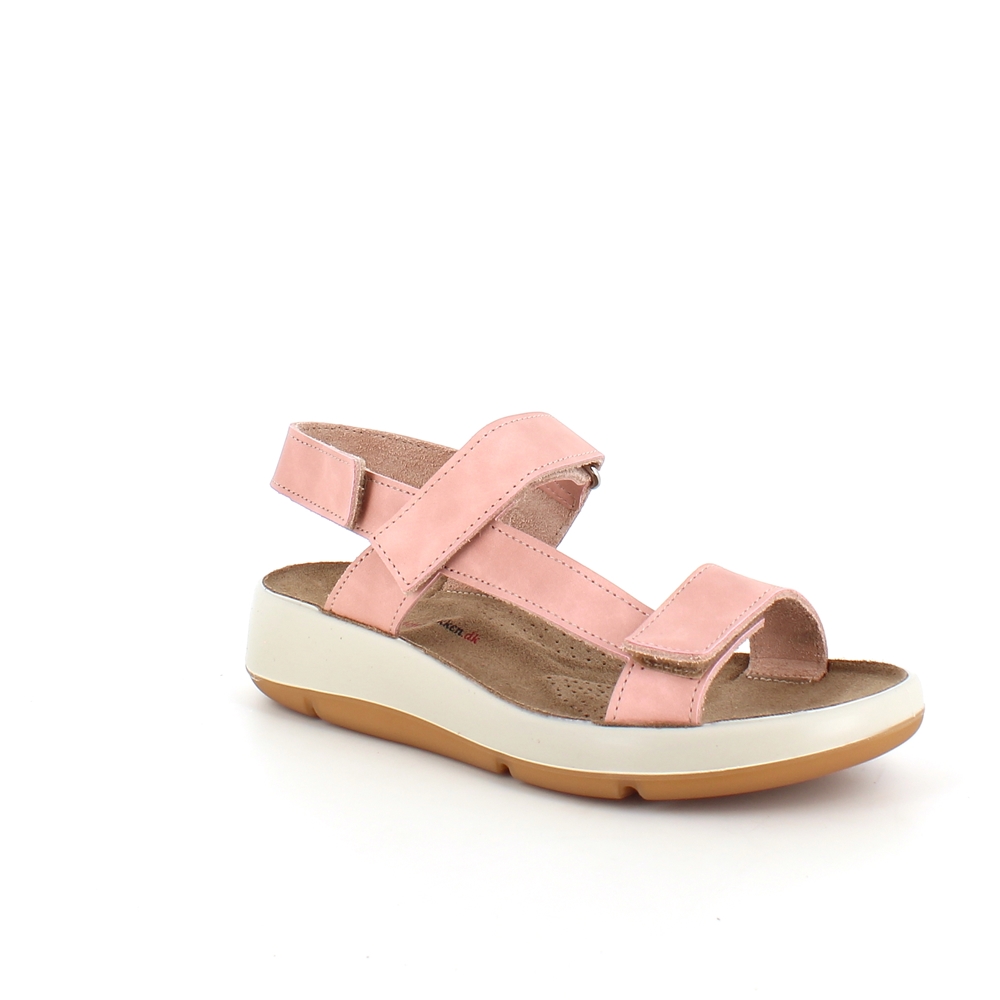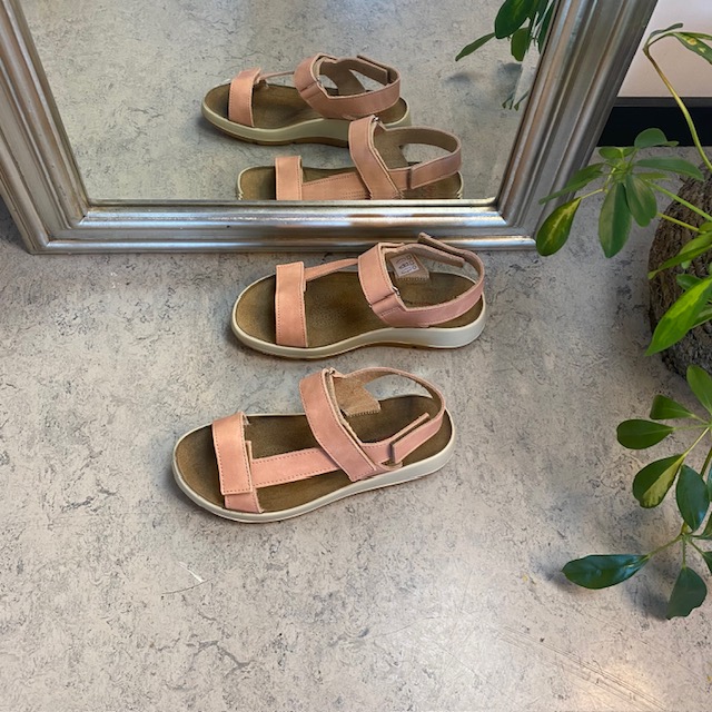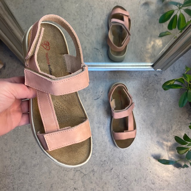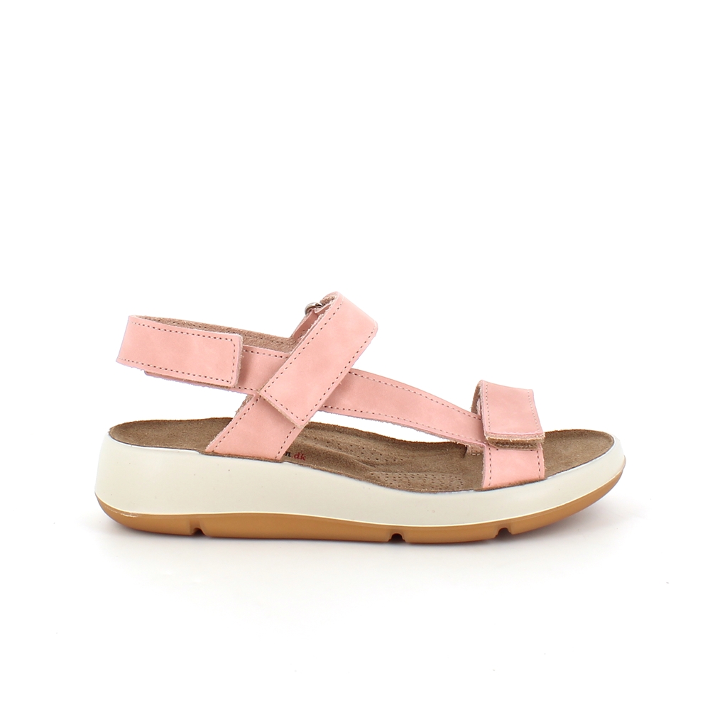 Rosa lærsandal med tre justerbare stropper og støtte for svangen