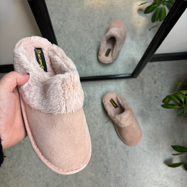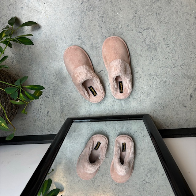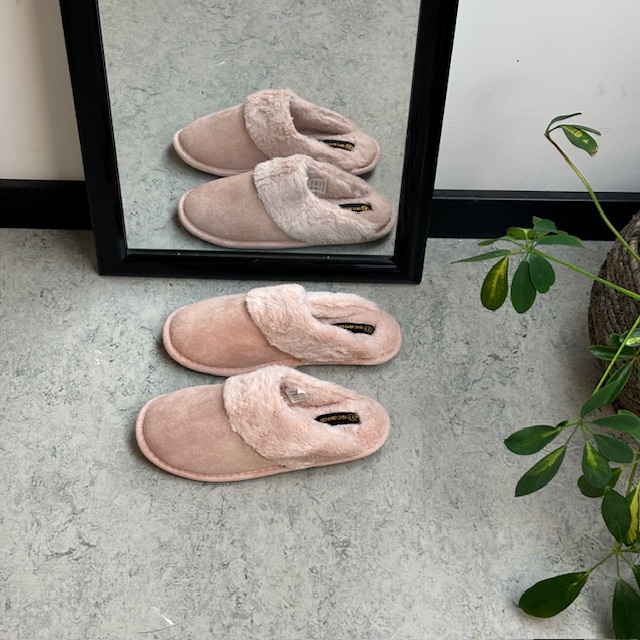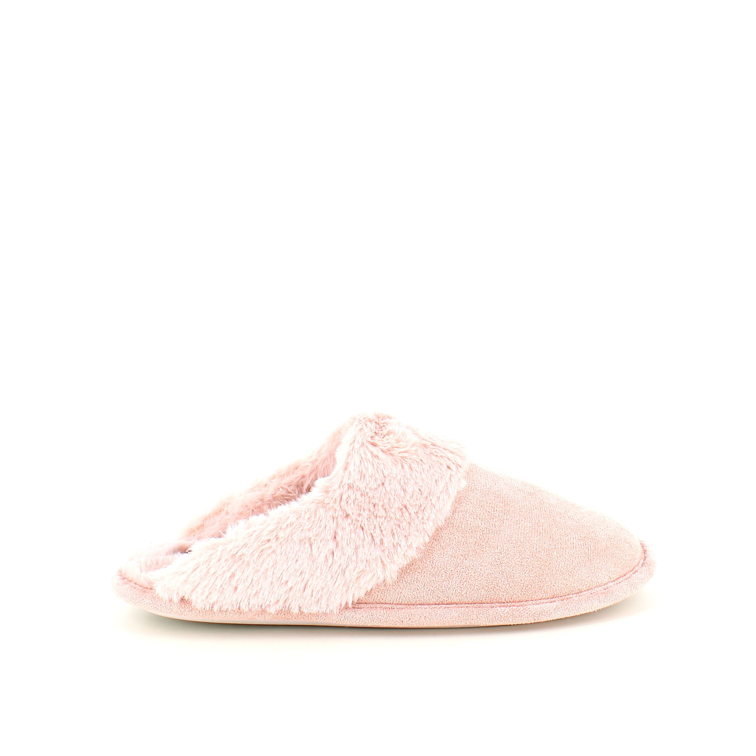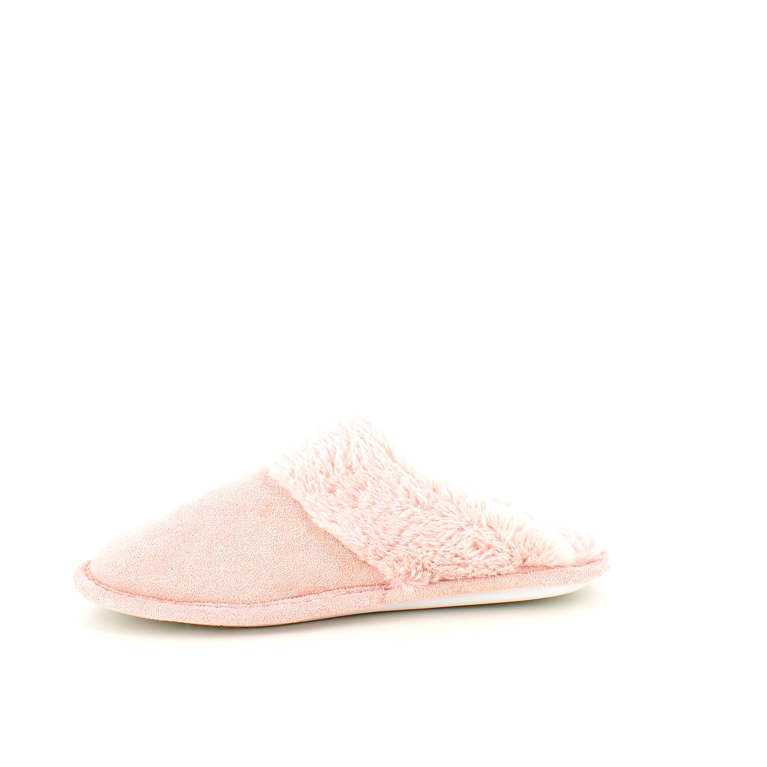 Rosa Slip In tøfler med mykt syntetisk pels.