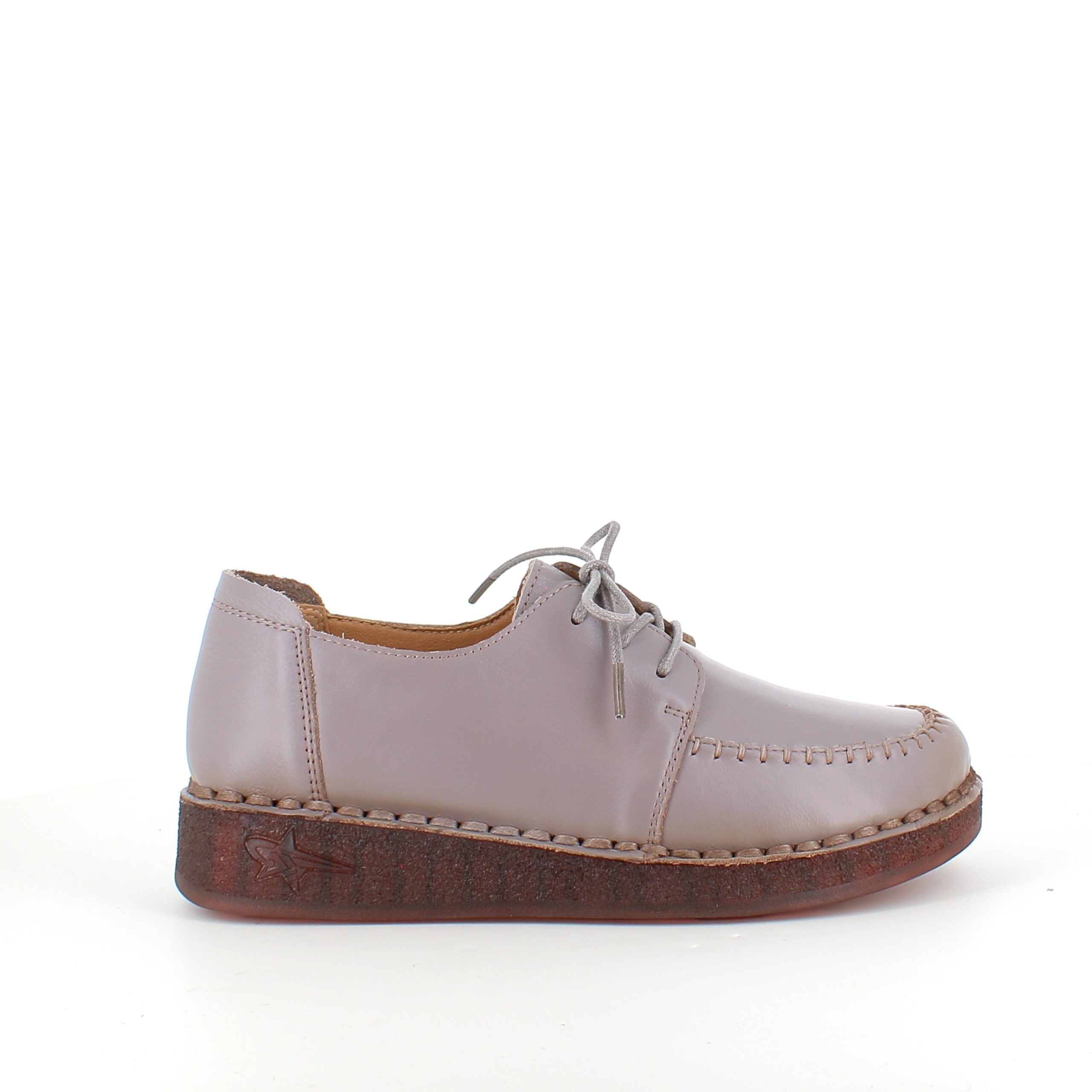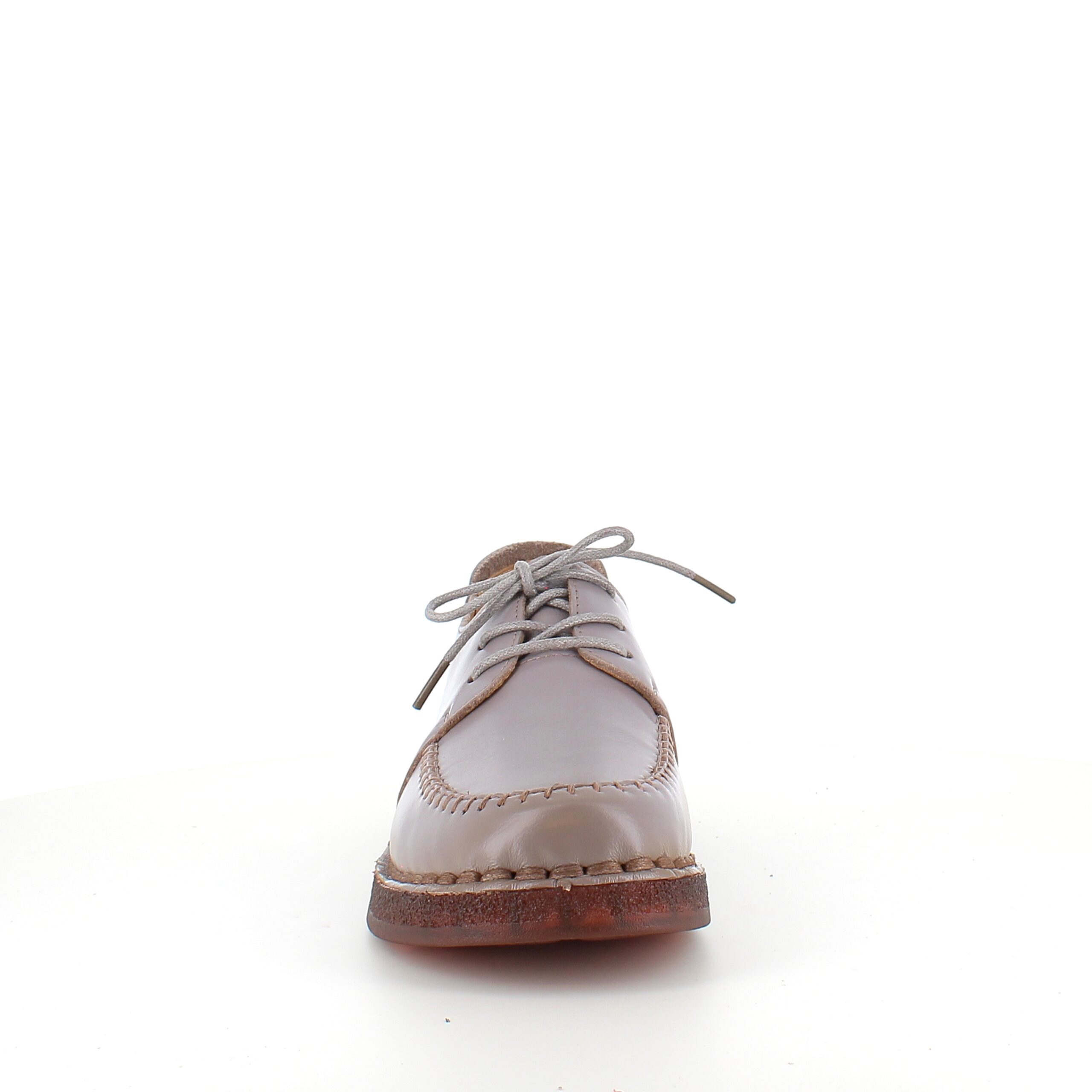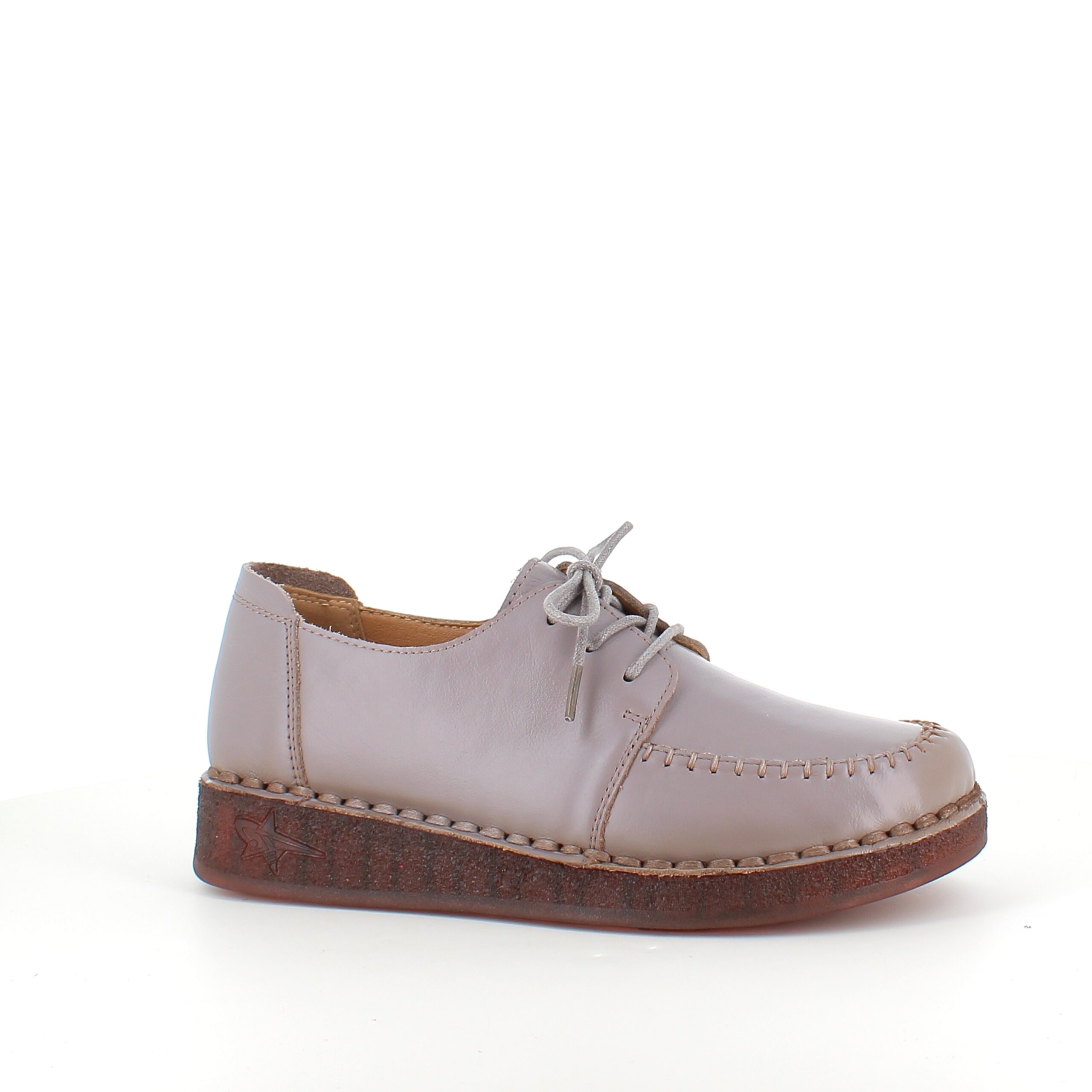 Sko med snøring i sandfarget skinn med flotte detaljer i skinnets sammensying på overdelen.