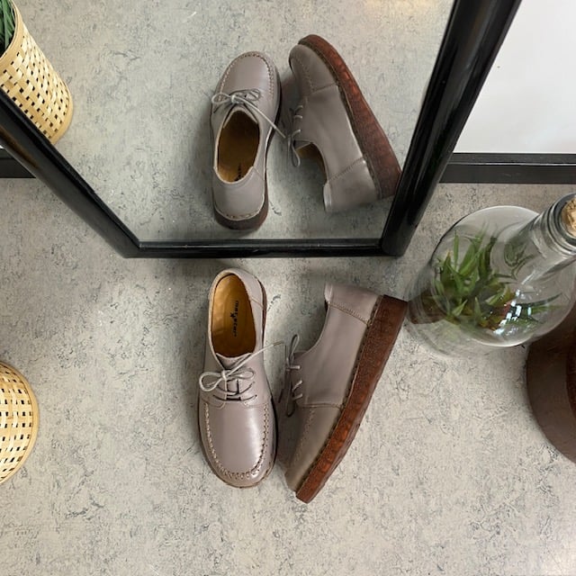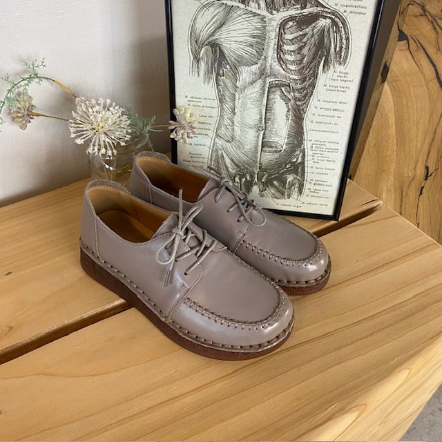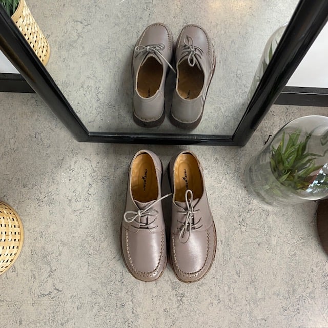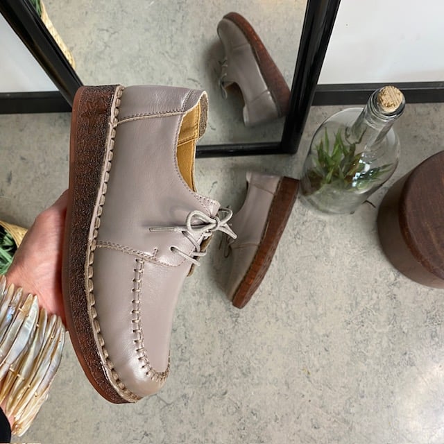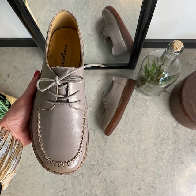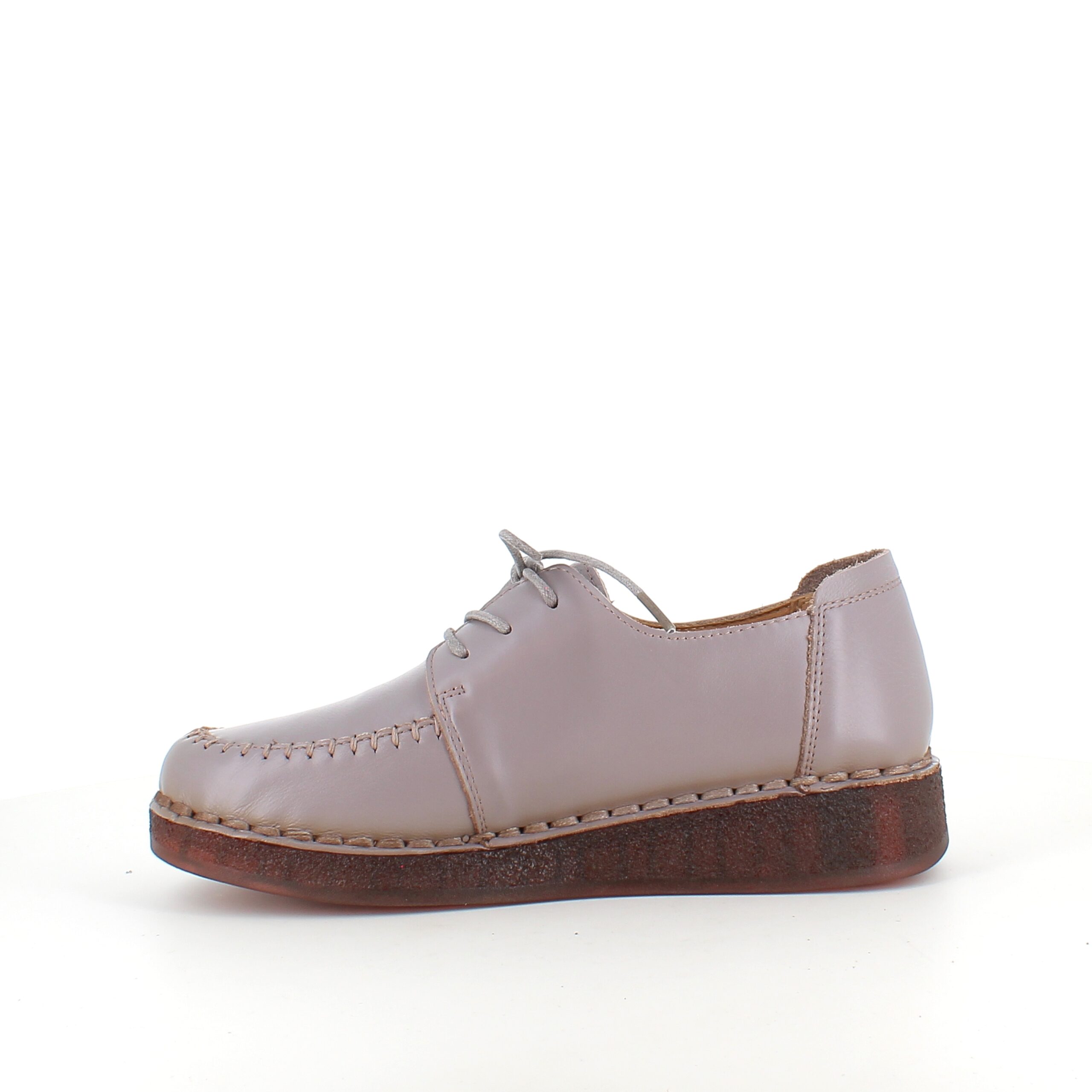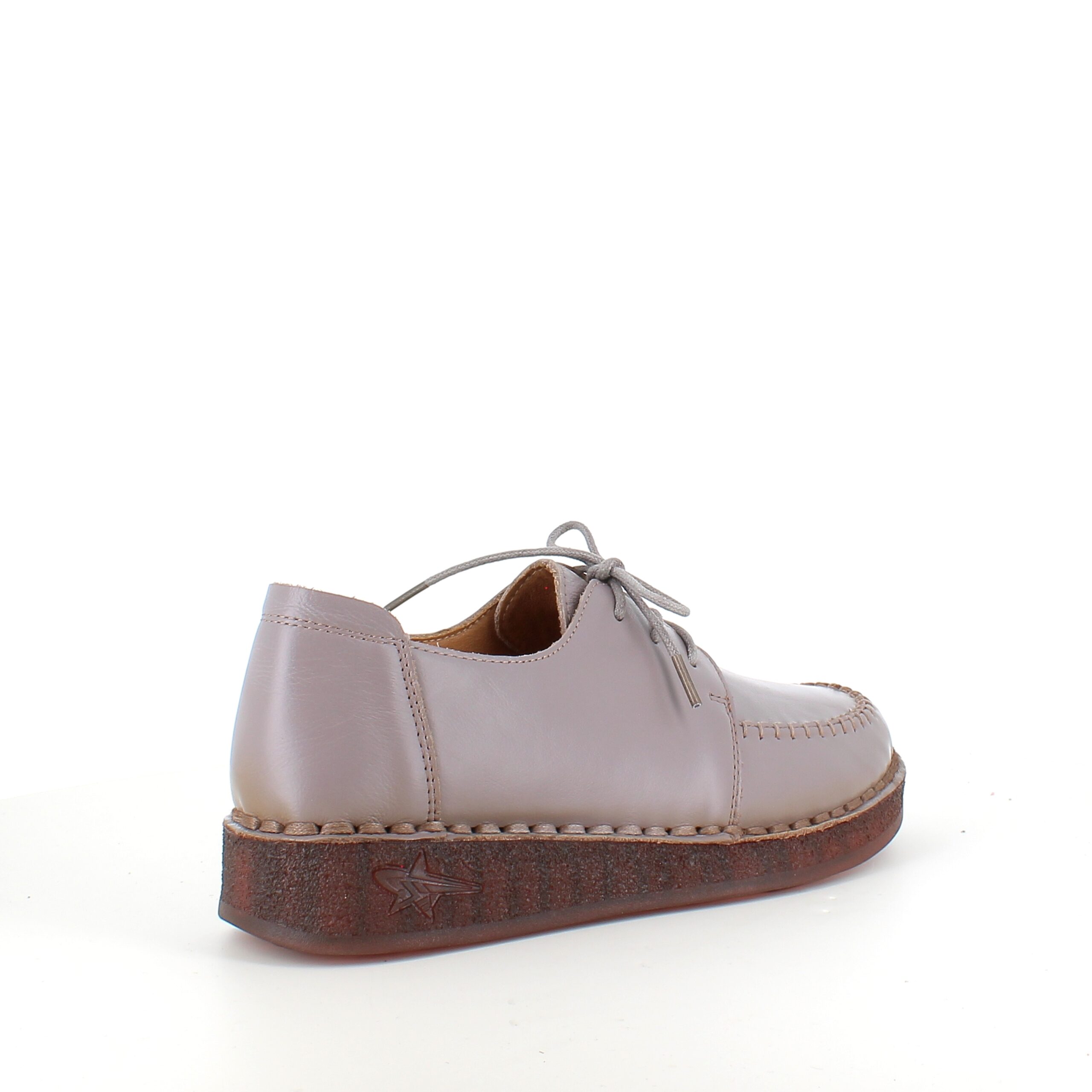 Sko med snøring i sandfarget skinn med flotte detaljer i skinnets sammensying på overdelen.