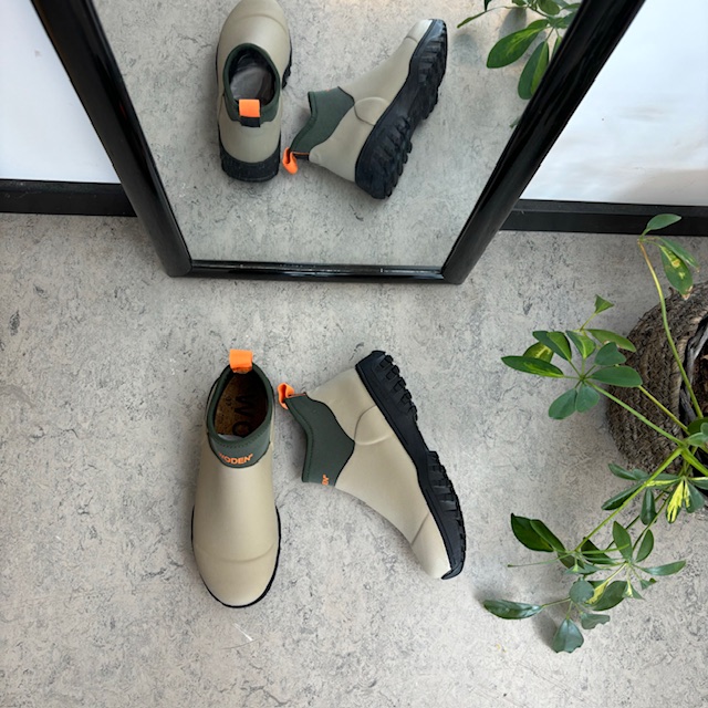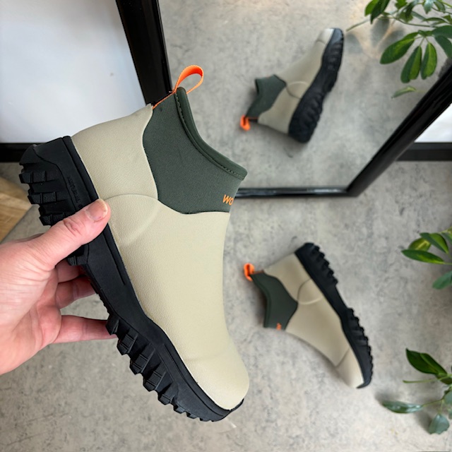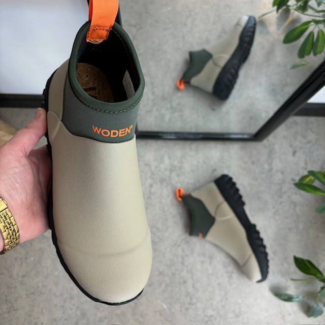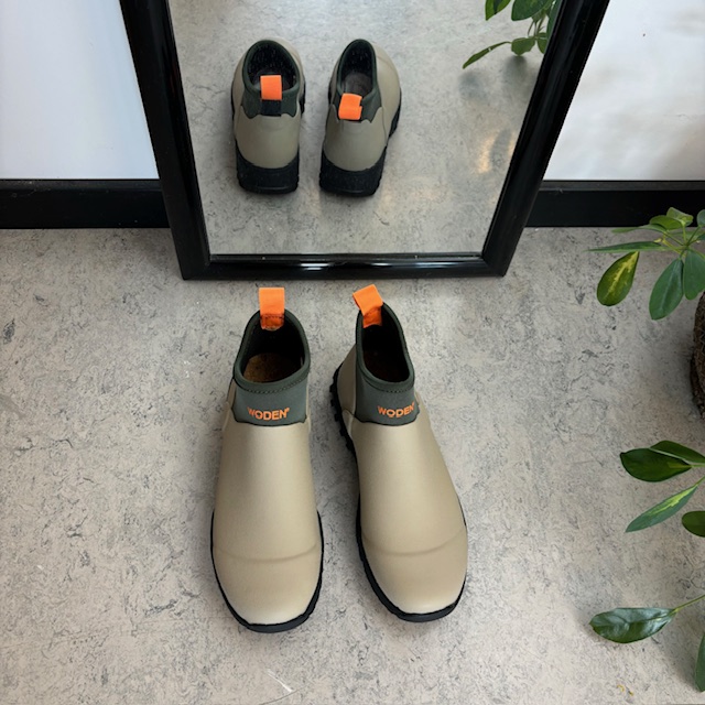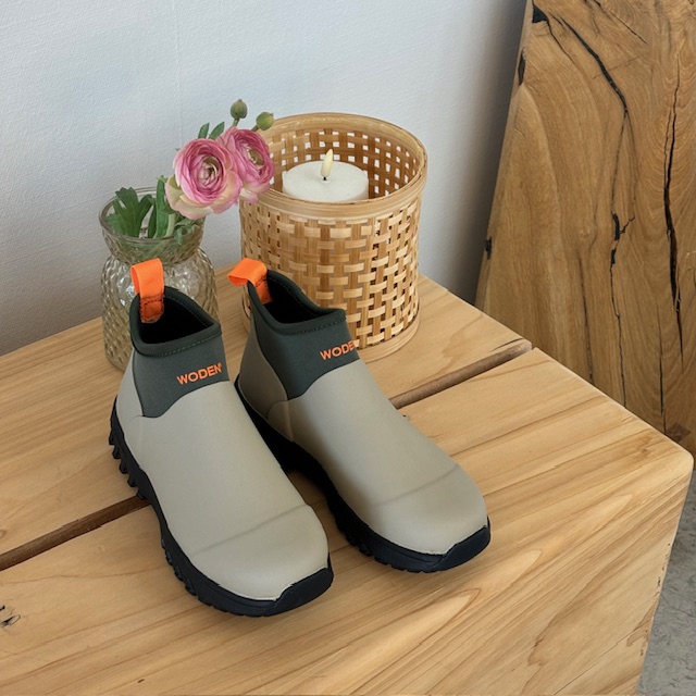 De sandfargede korte gummistøvlene fra Woden har fotbuesupport og effektiv støtdemping.