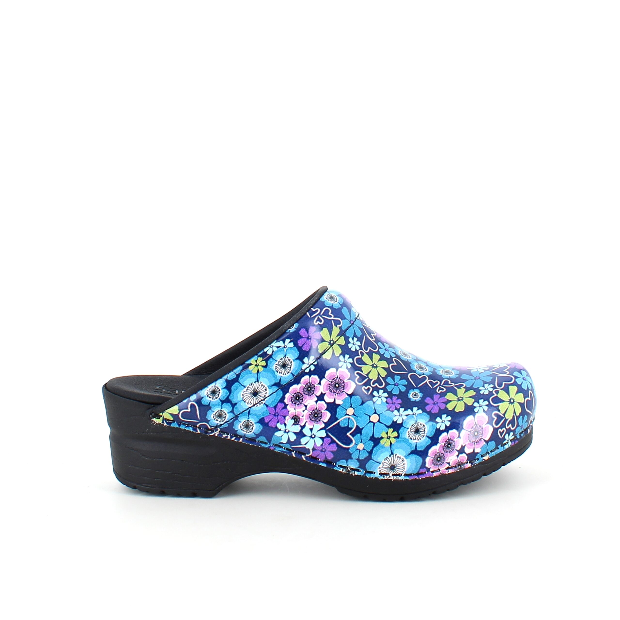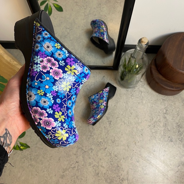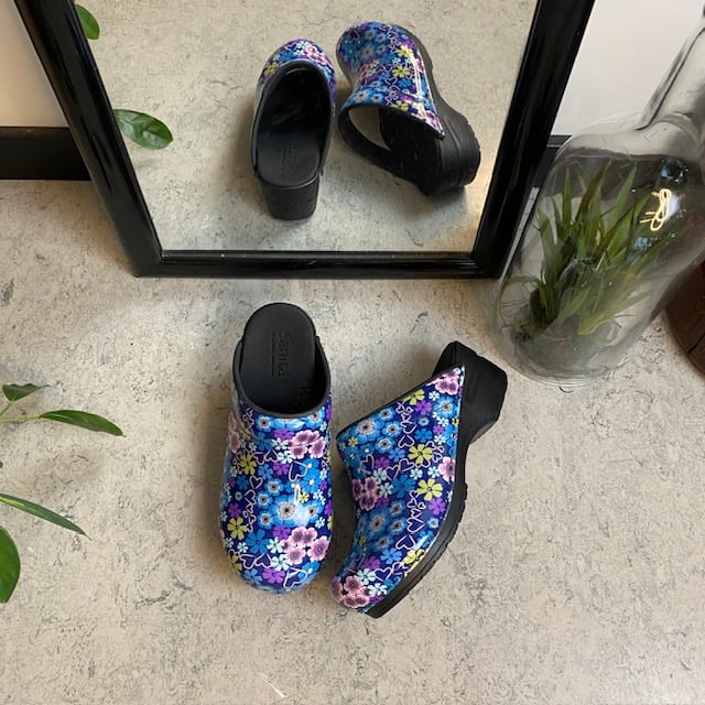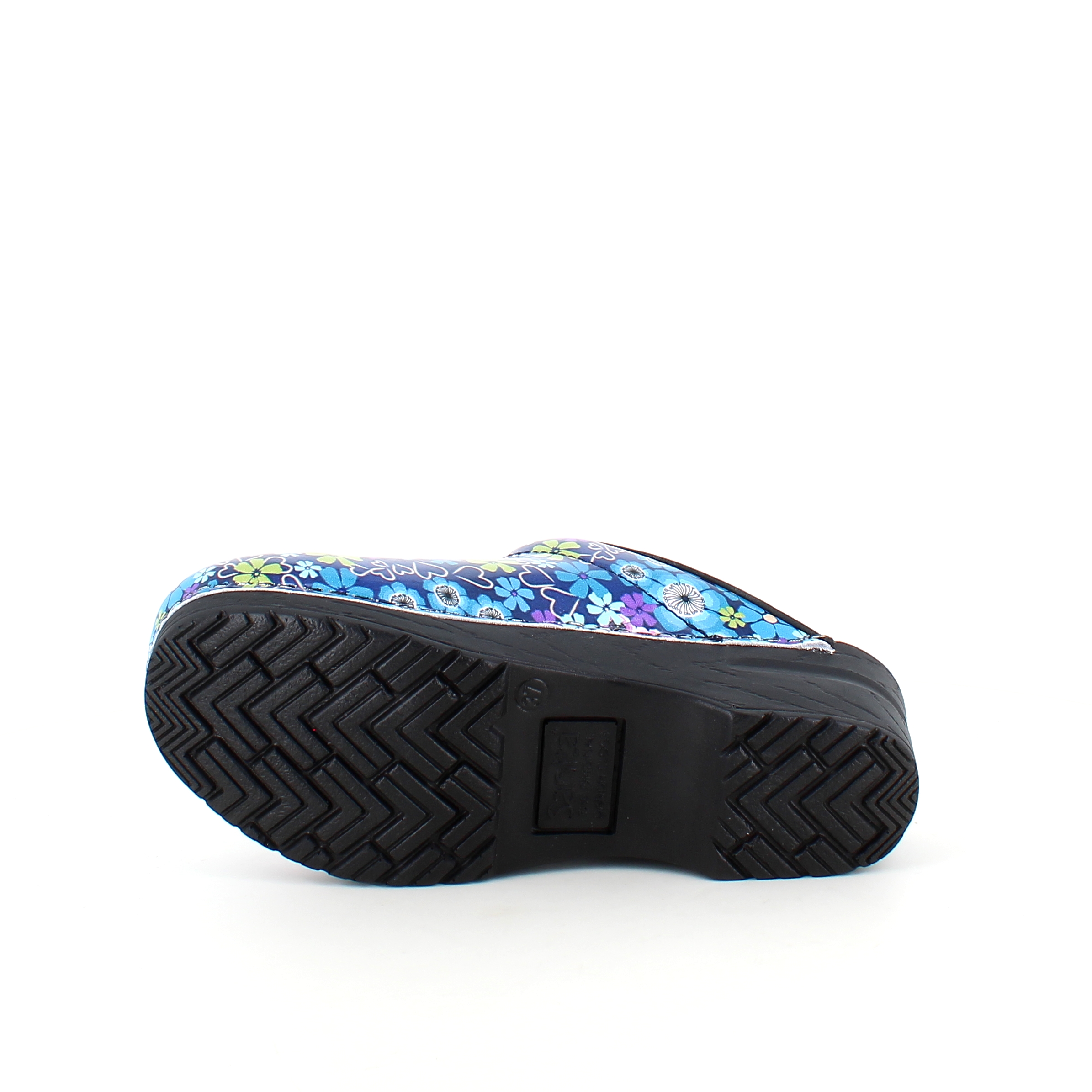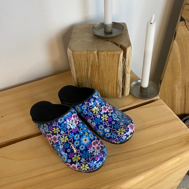 Elegant og komfortabel tøffeltresko i et flott blått og lilla blomstrete mønster i lakkert skinn.