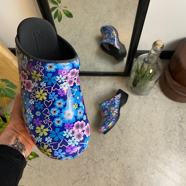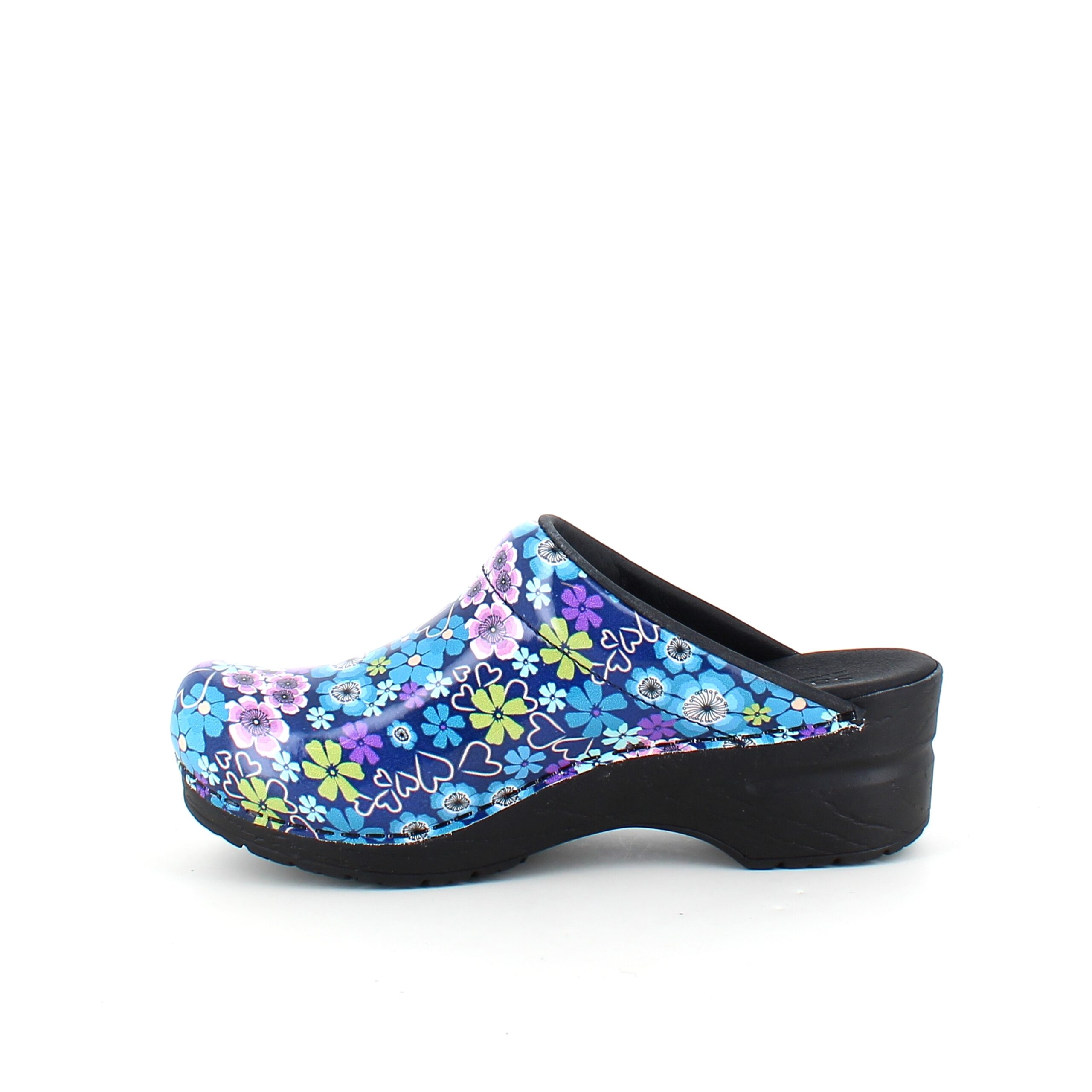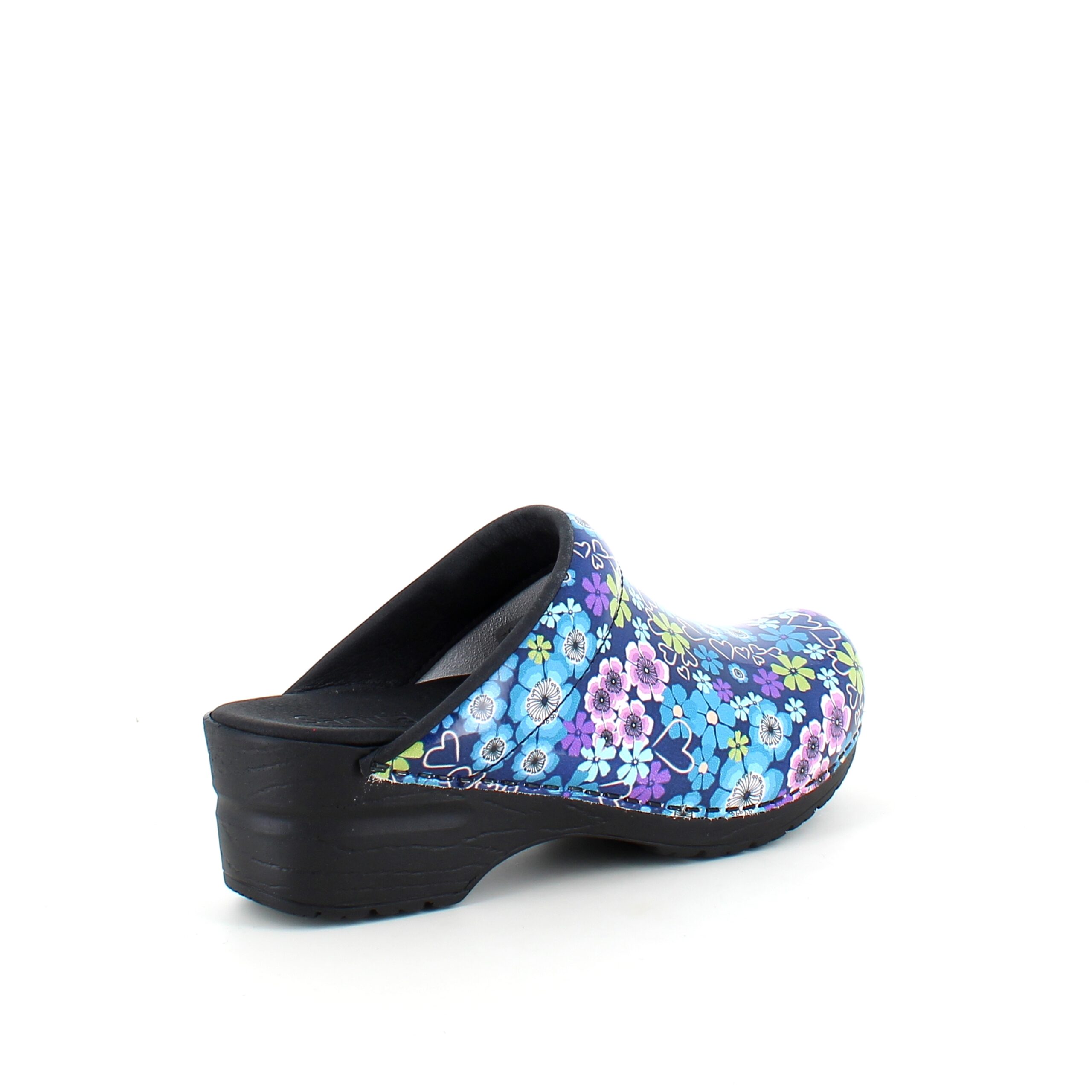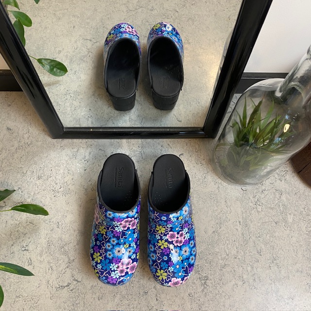 Elegant og komfortabel tøffeltresko i et flott blått og lilla blomstrete mønster i lakkert skinn.