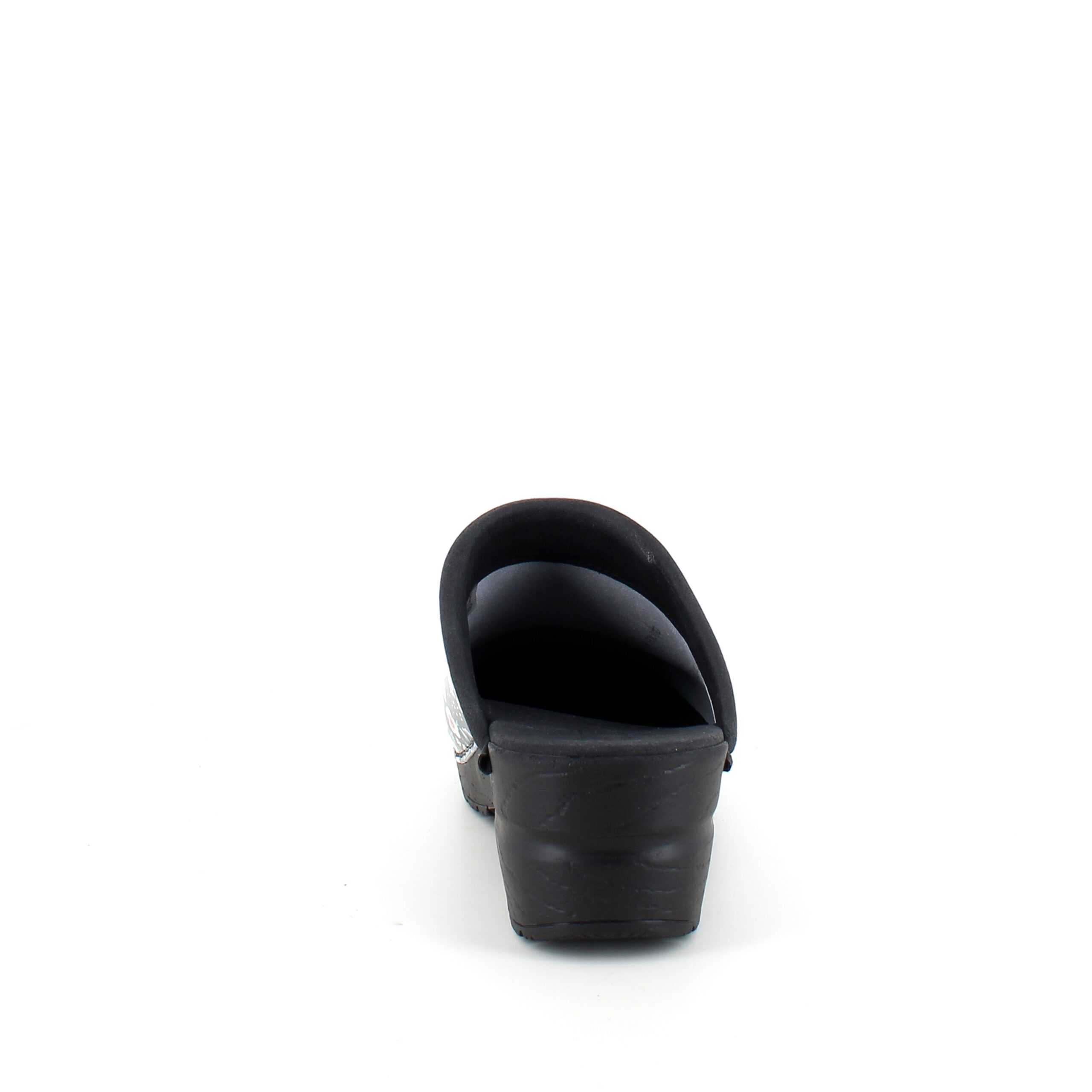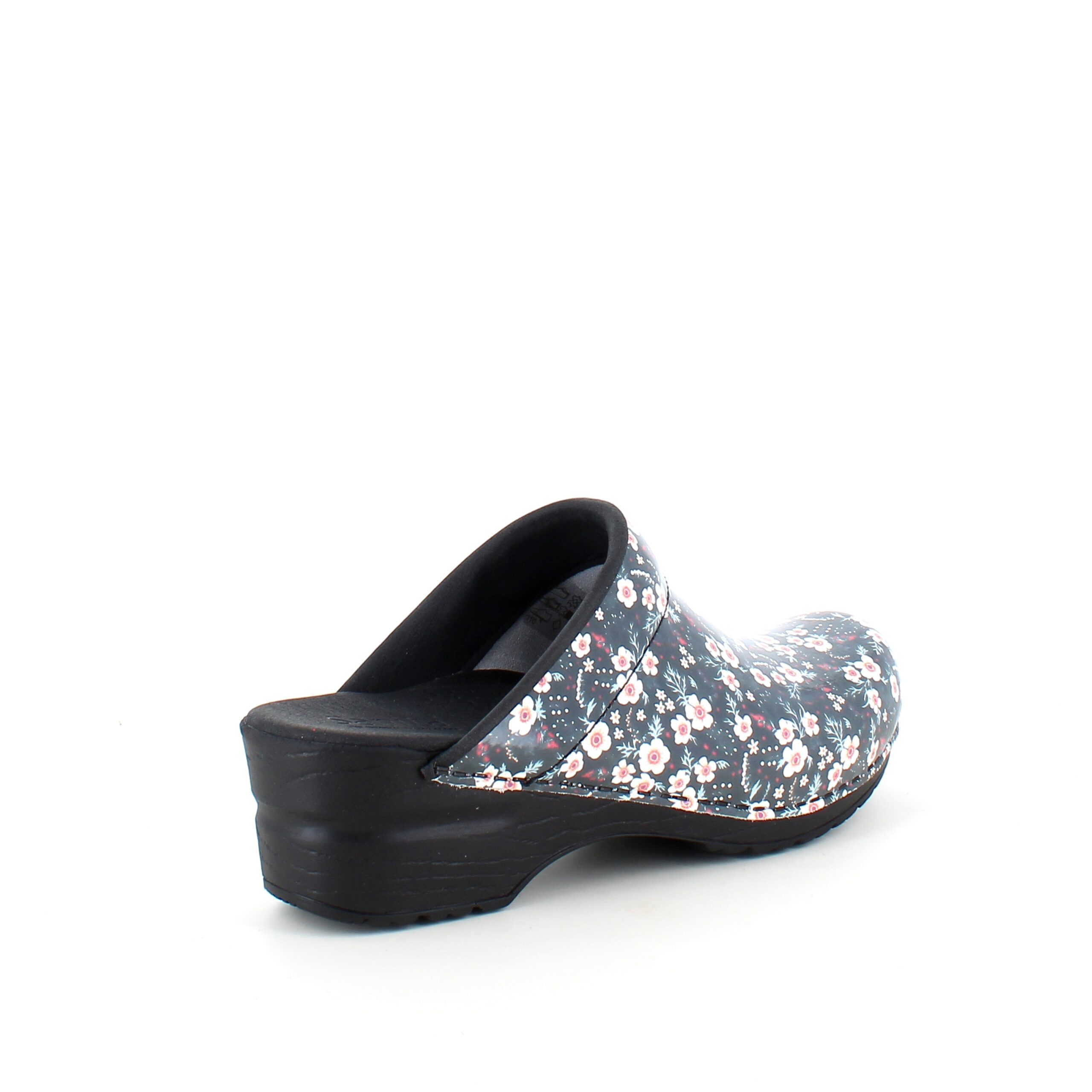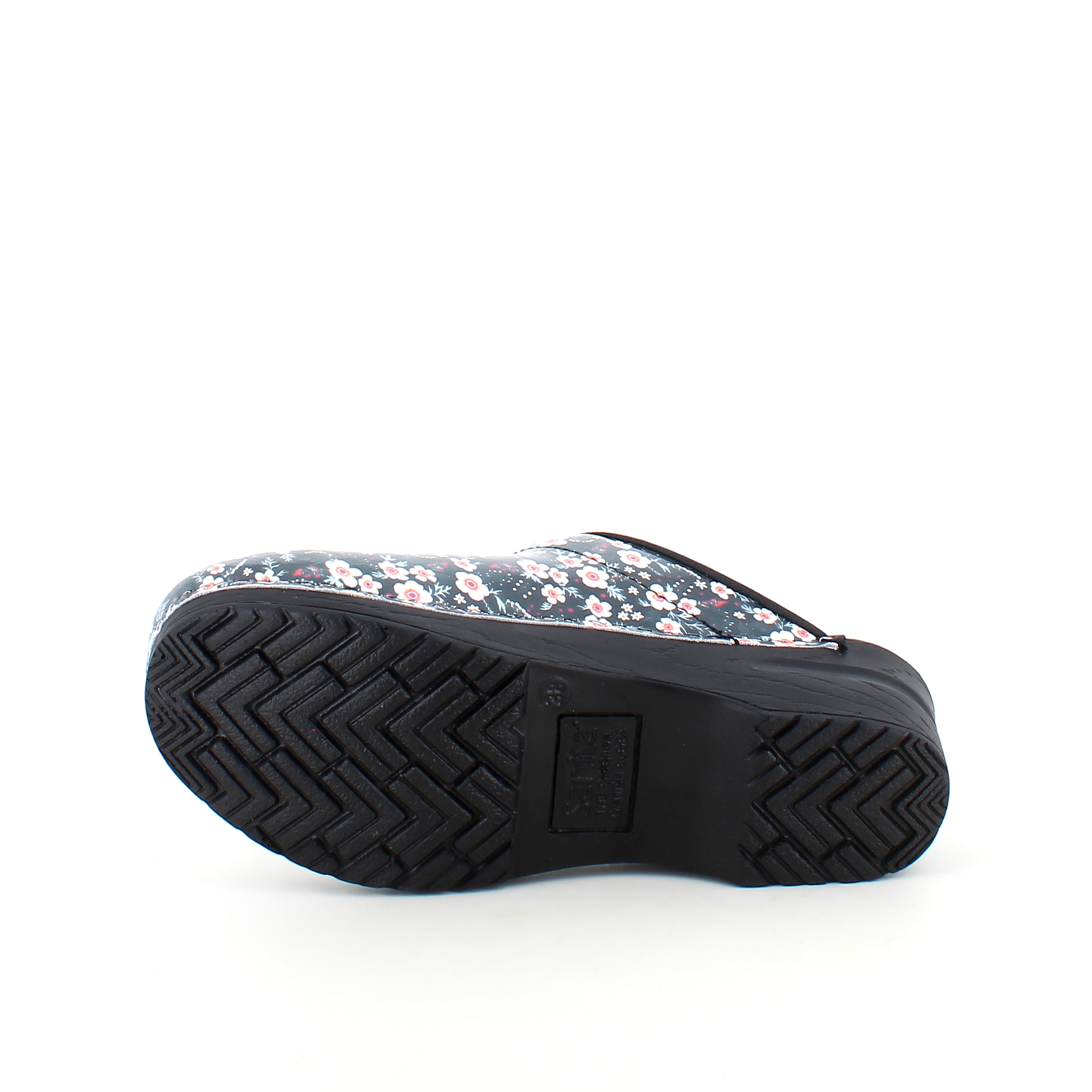 Elegant og komfortabel tøffelsko i et flott sort/hvitt blomstrete, trykt lakskinn.