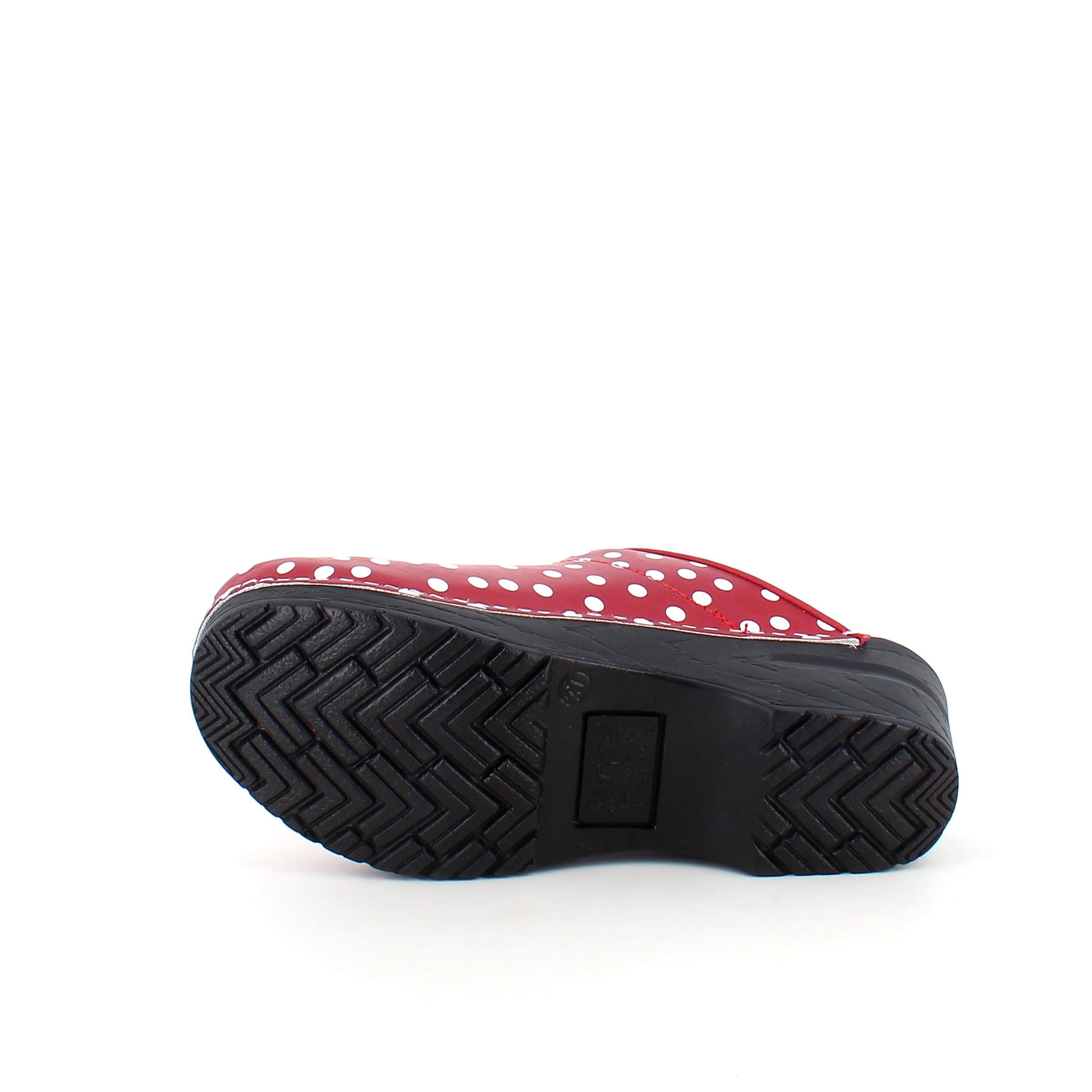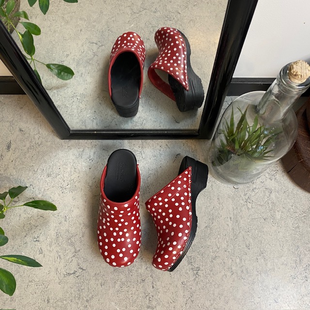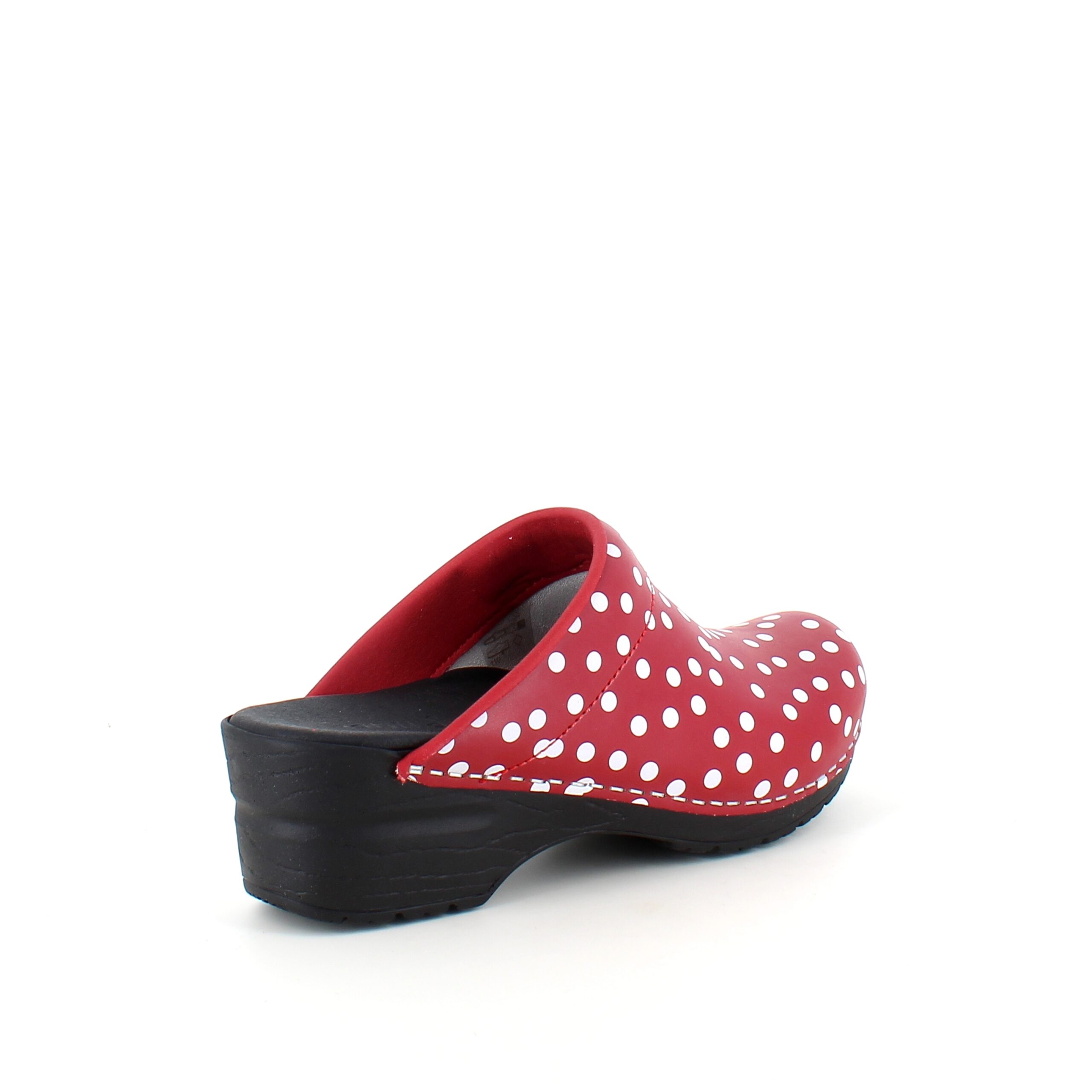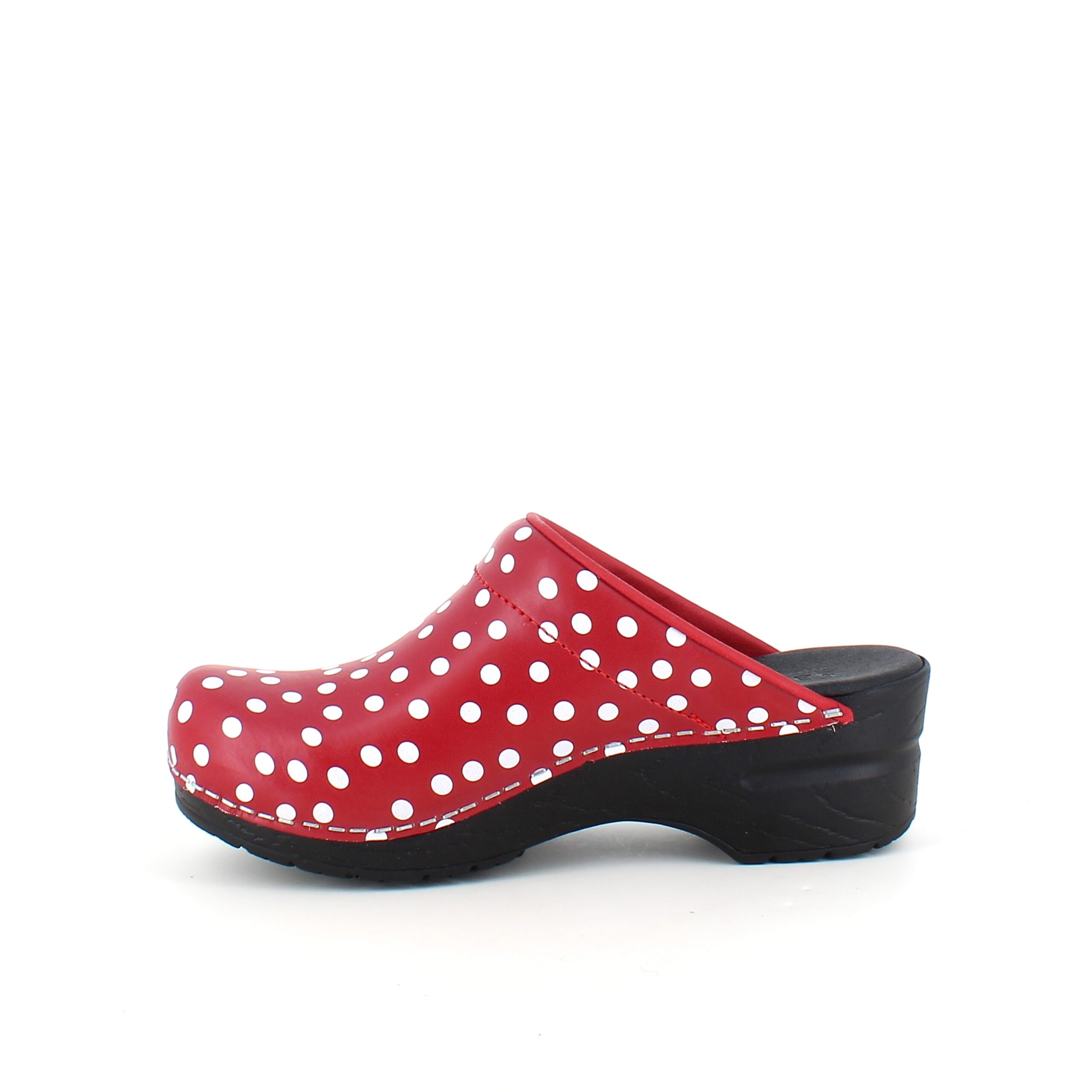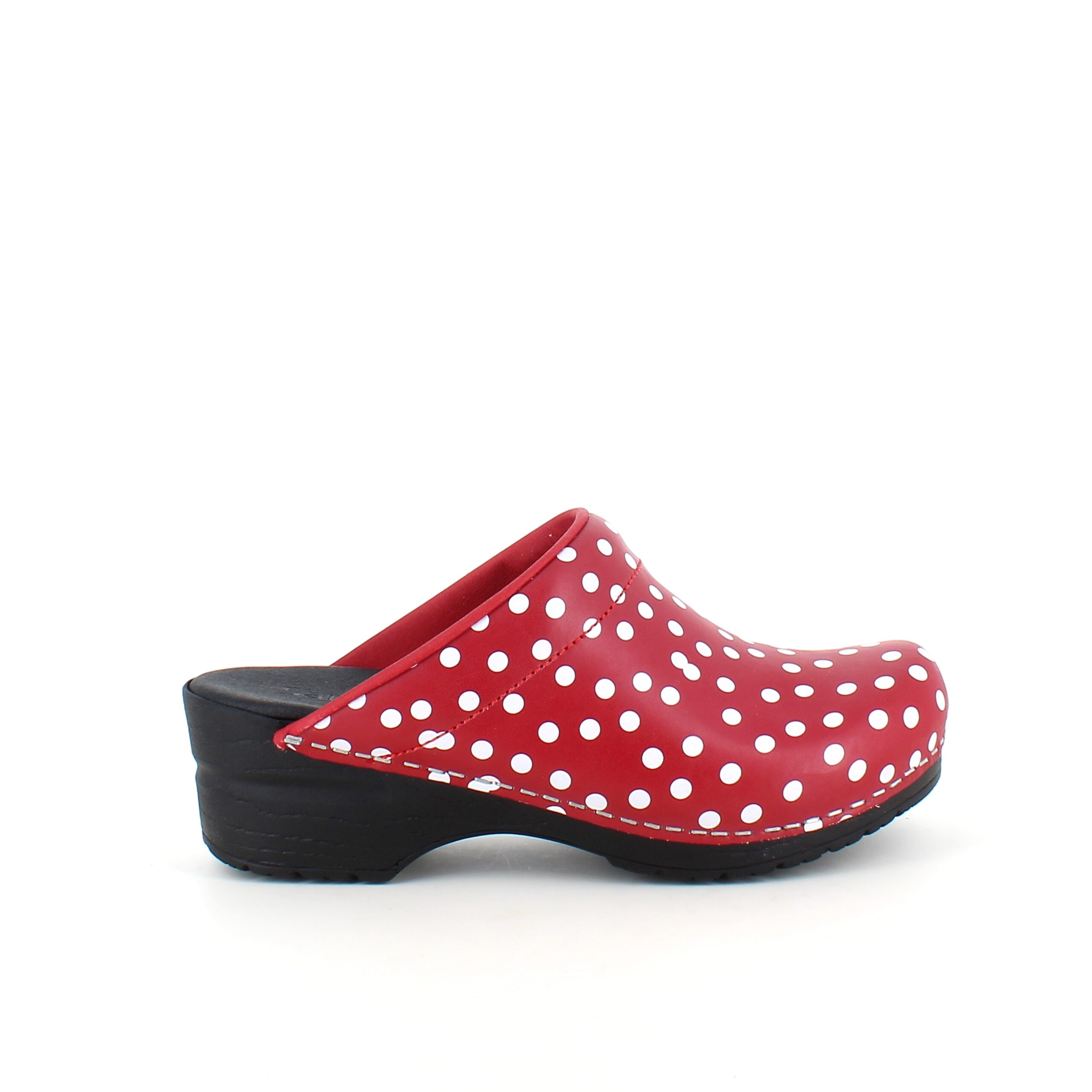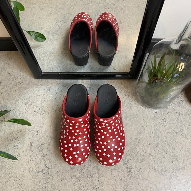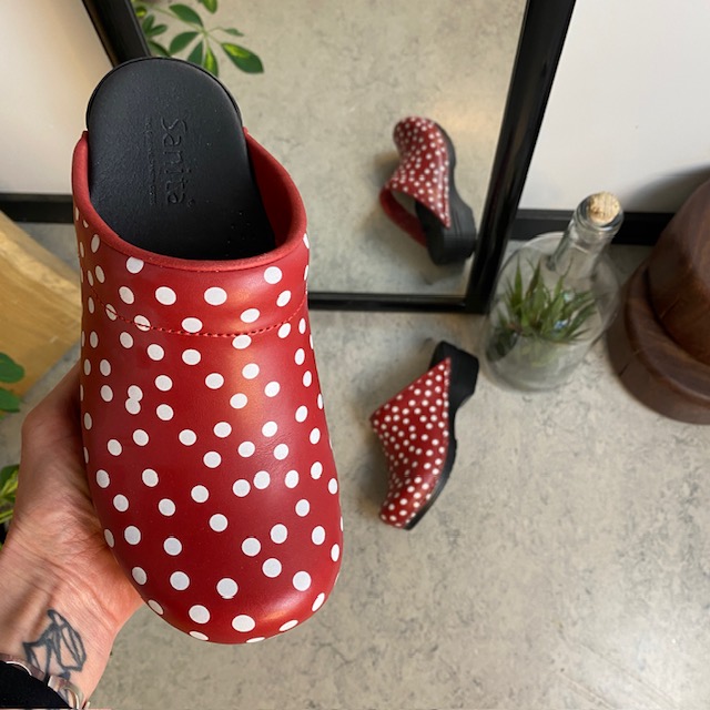 Sanita tresko med rødt og hvitt prikkemønster tilbyr en kombinasjon av stil og høy komfort.