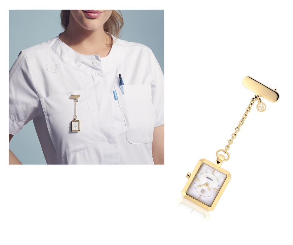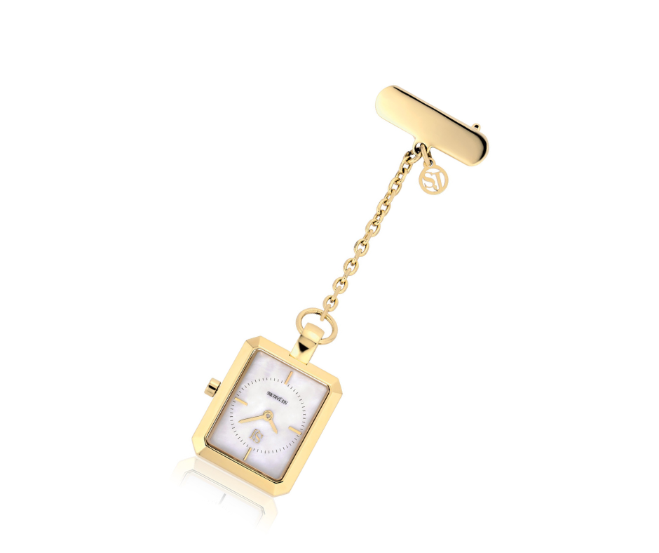 Sykepleierklokke fra Sif Jacobs i guldtone.