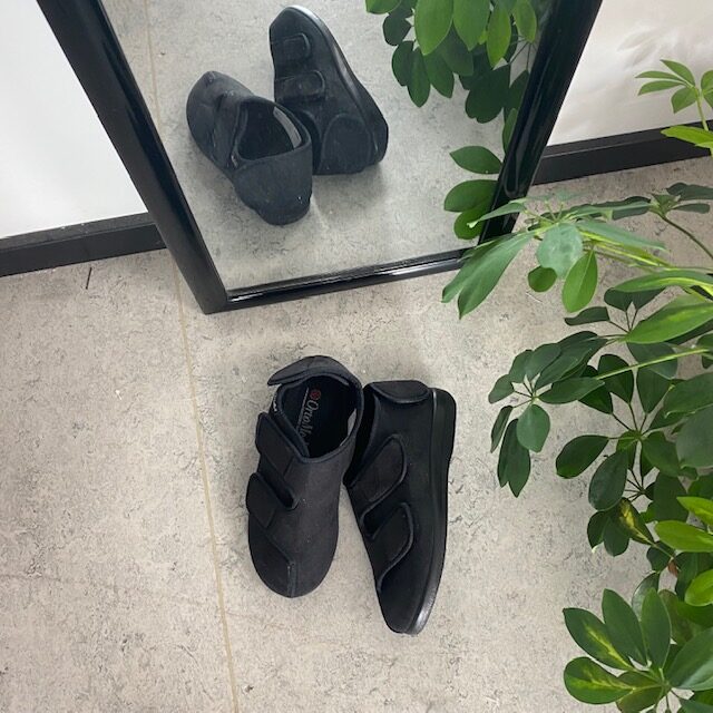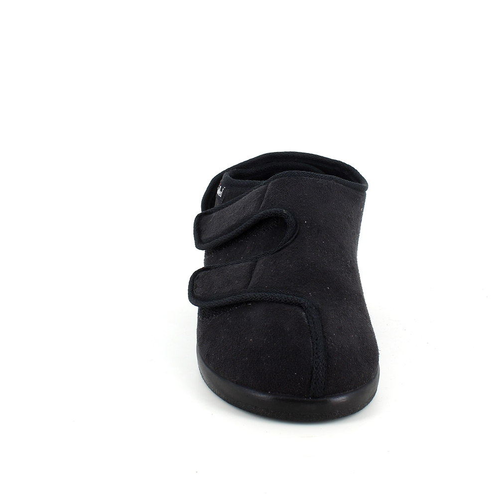 Bred ortopedisk sko i svart med borrelås i forfoten. Skoen har også borrelås rundt ankelen og rundt hælen.