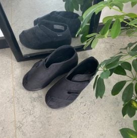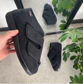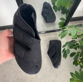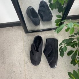 Bred ortopedisk sandal i svart med borrelås på forfoten. Sandalen har også borrelås rundt ankelen.