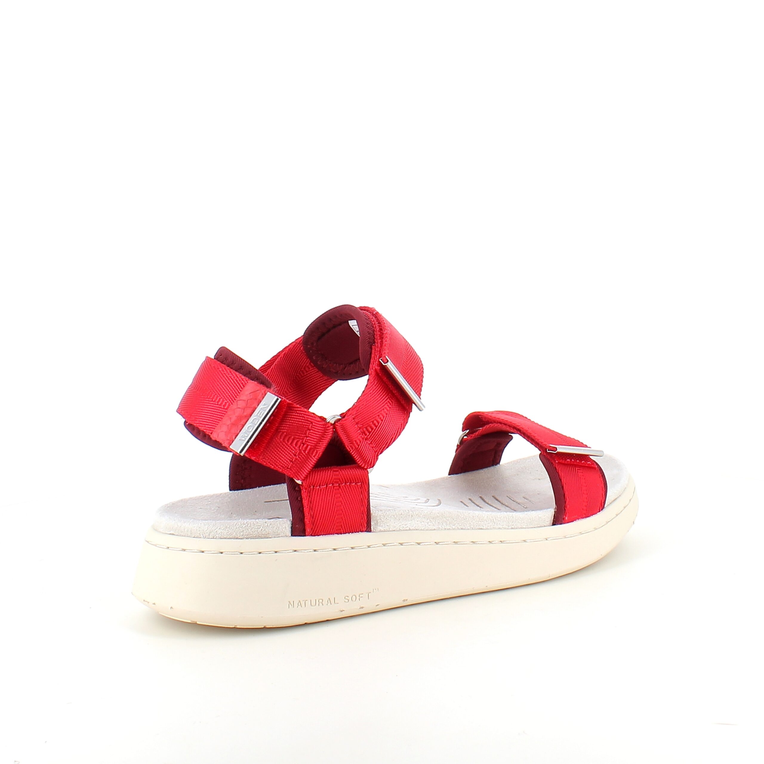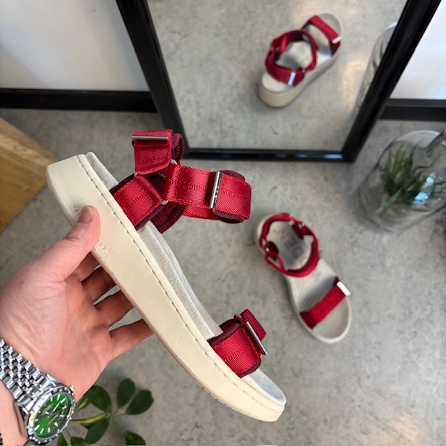 Denne røde sandal fra Woden har et design med tre justerbare stropper, noe som gjør det enkelt å tilpasse passformen individuelt.