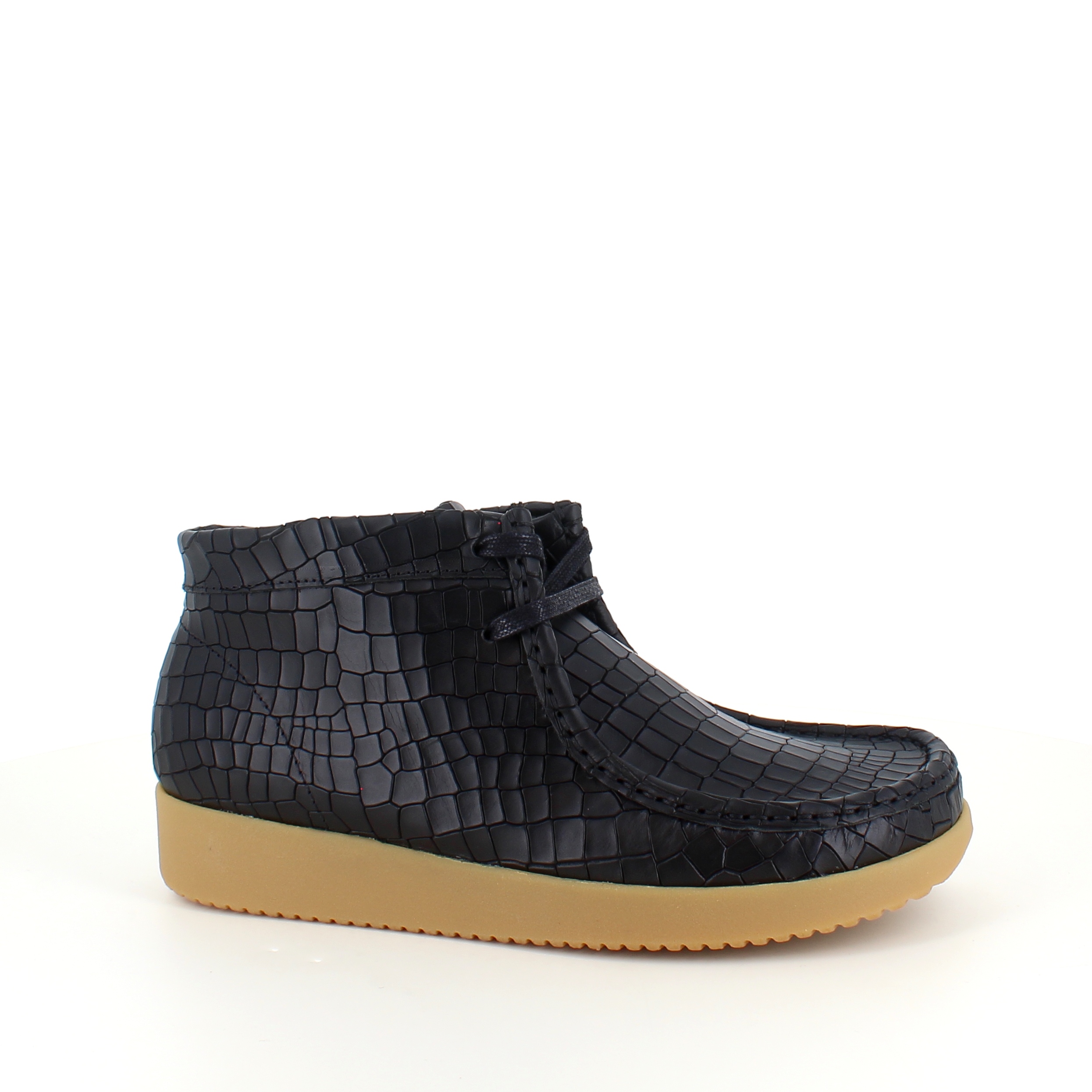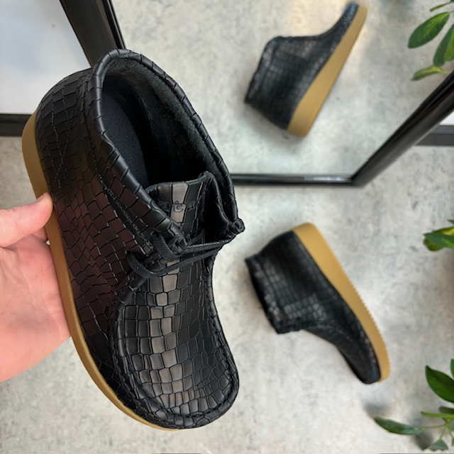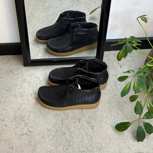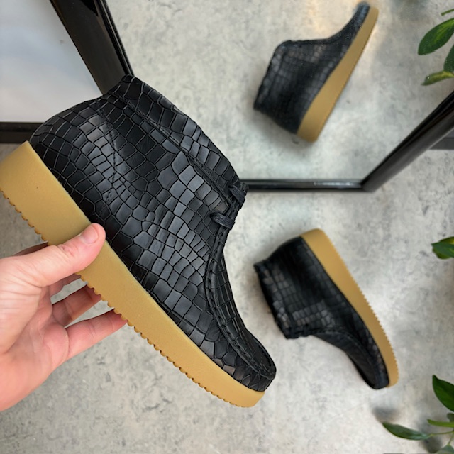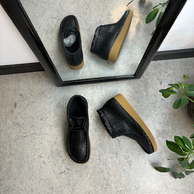 Sort krokodillemønstret støvlett fra Nature er en moderne og ergonomisk sko laget av skinn.