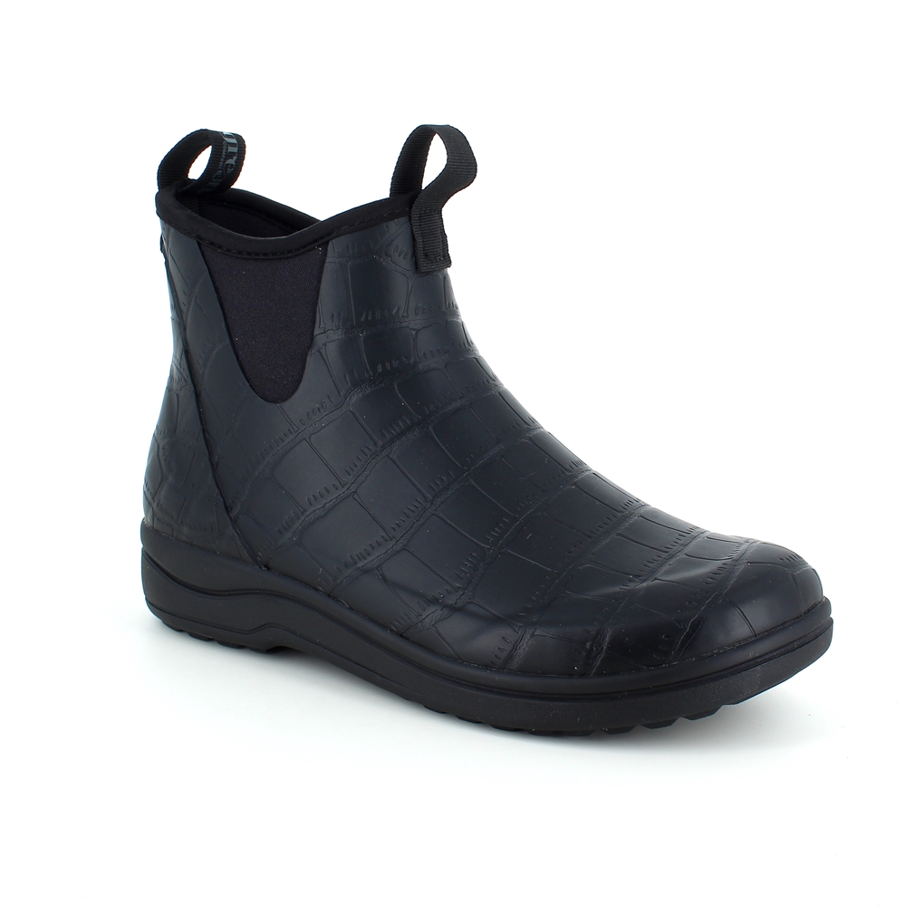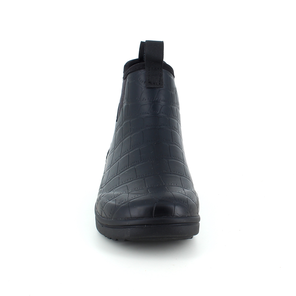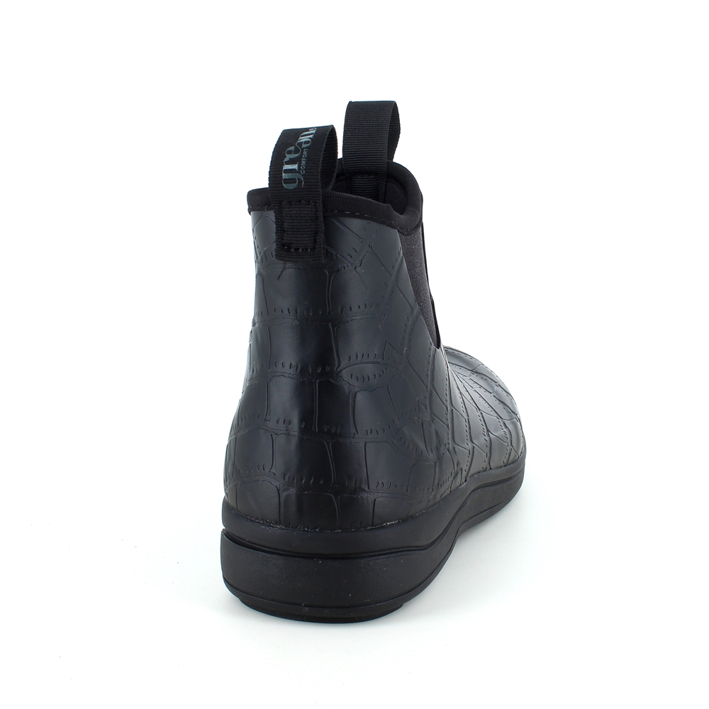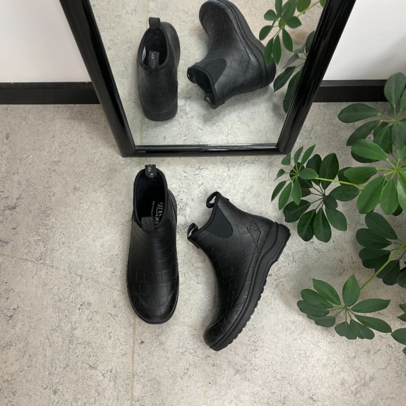 Stilig sort gummistøvel med en overdel av kraftig mønstret gummi, som gir støvelen et moderne utseende.