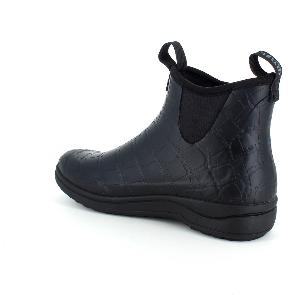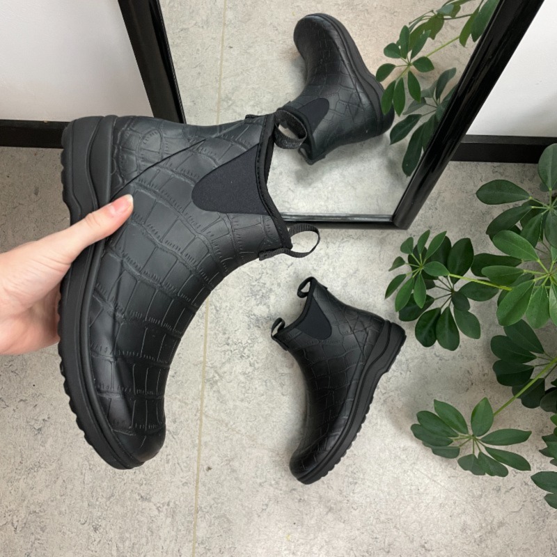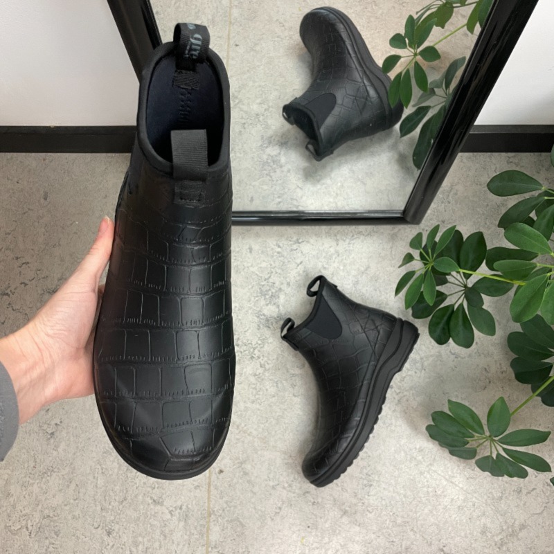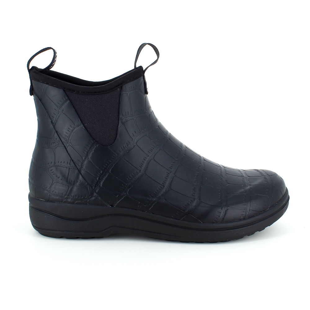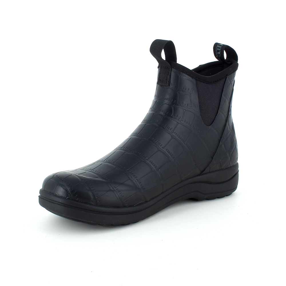 Stilig sort gummistøvel med en overdel av kraftig mønstret gummi, som gir støvelen et moderne utseende.