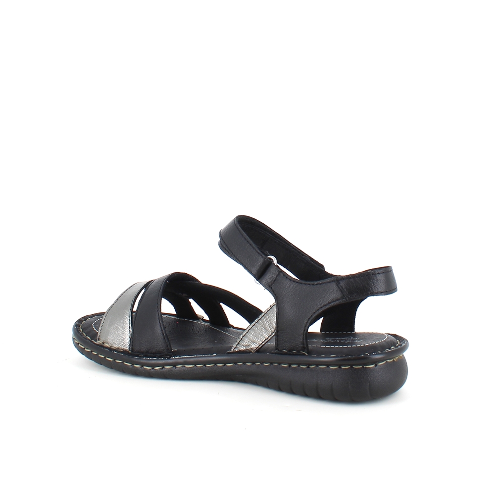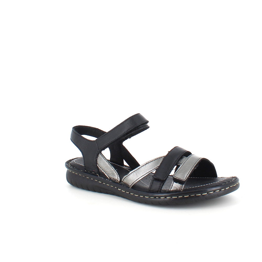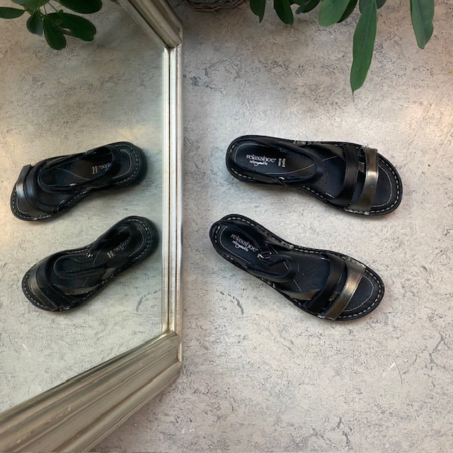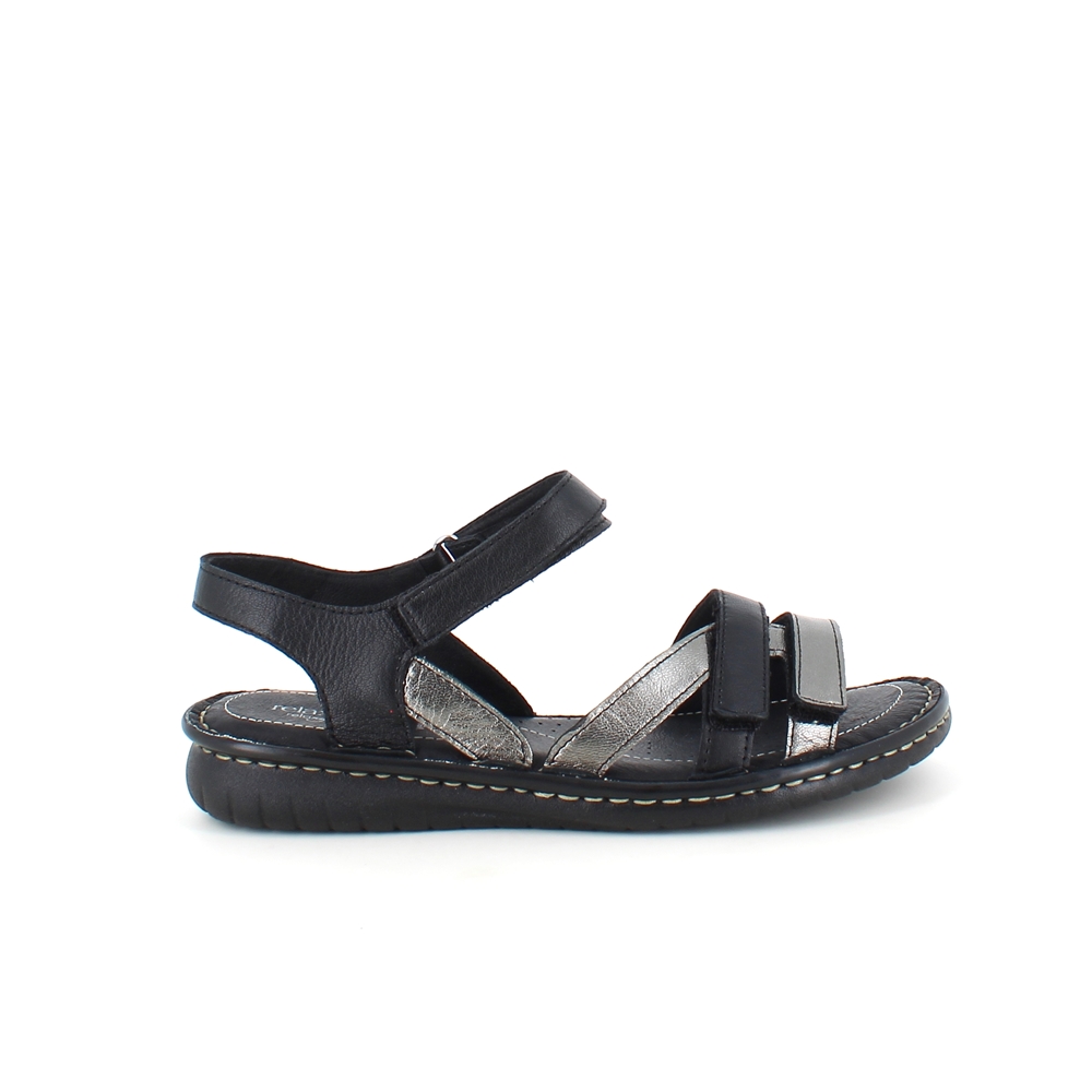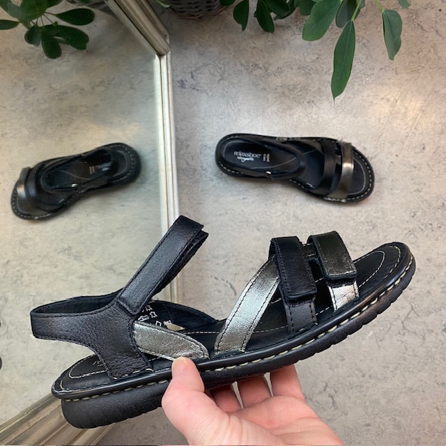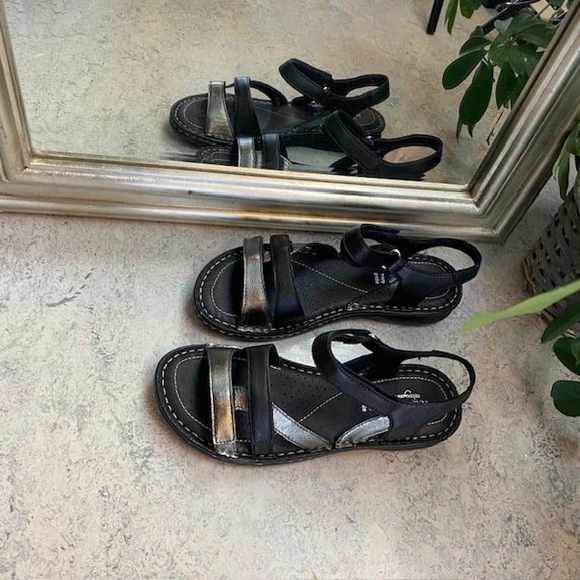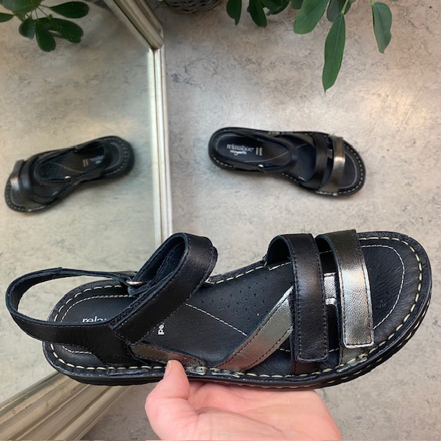 Svart skinnsandal med tre remmer og metallic detaljer fra Relaxshoe