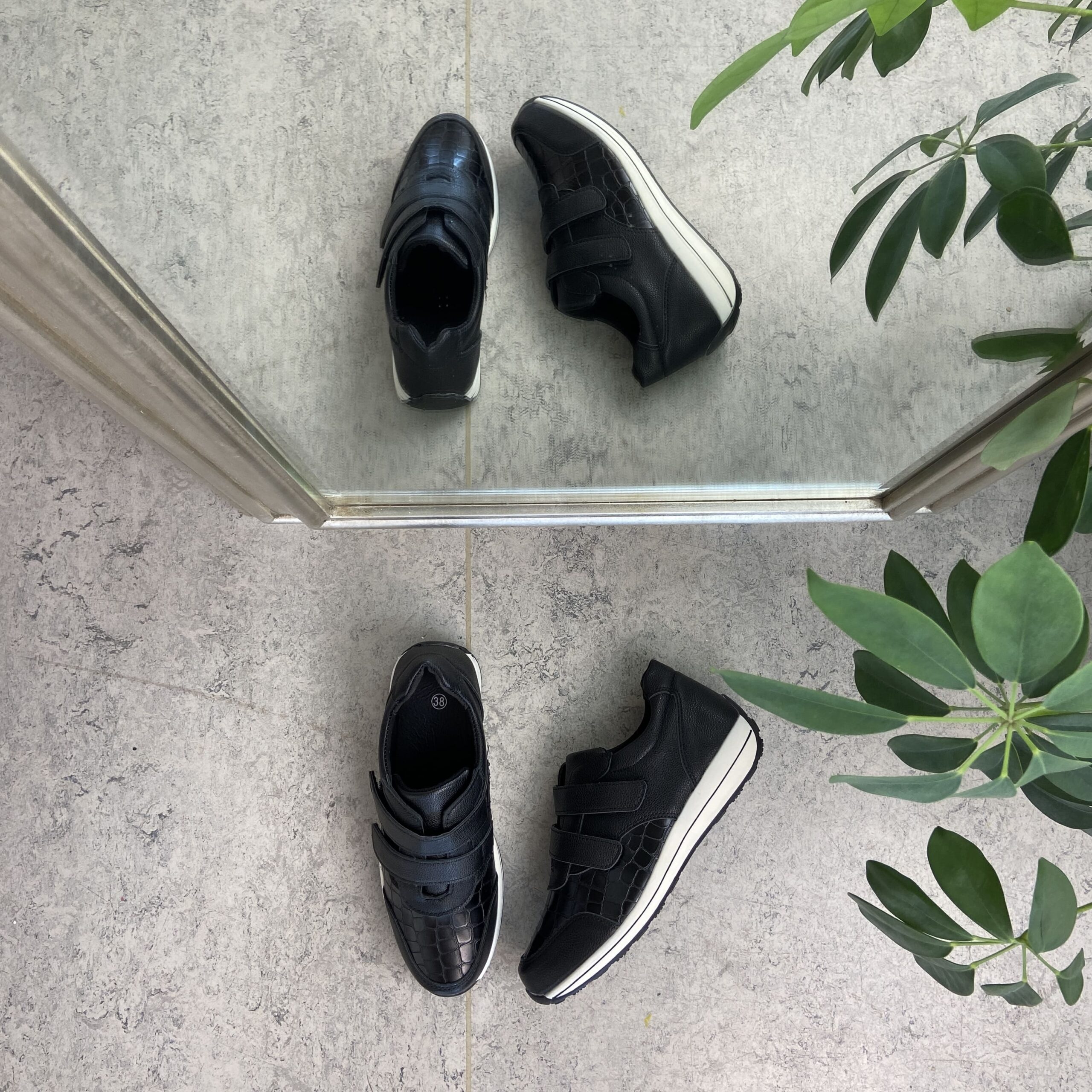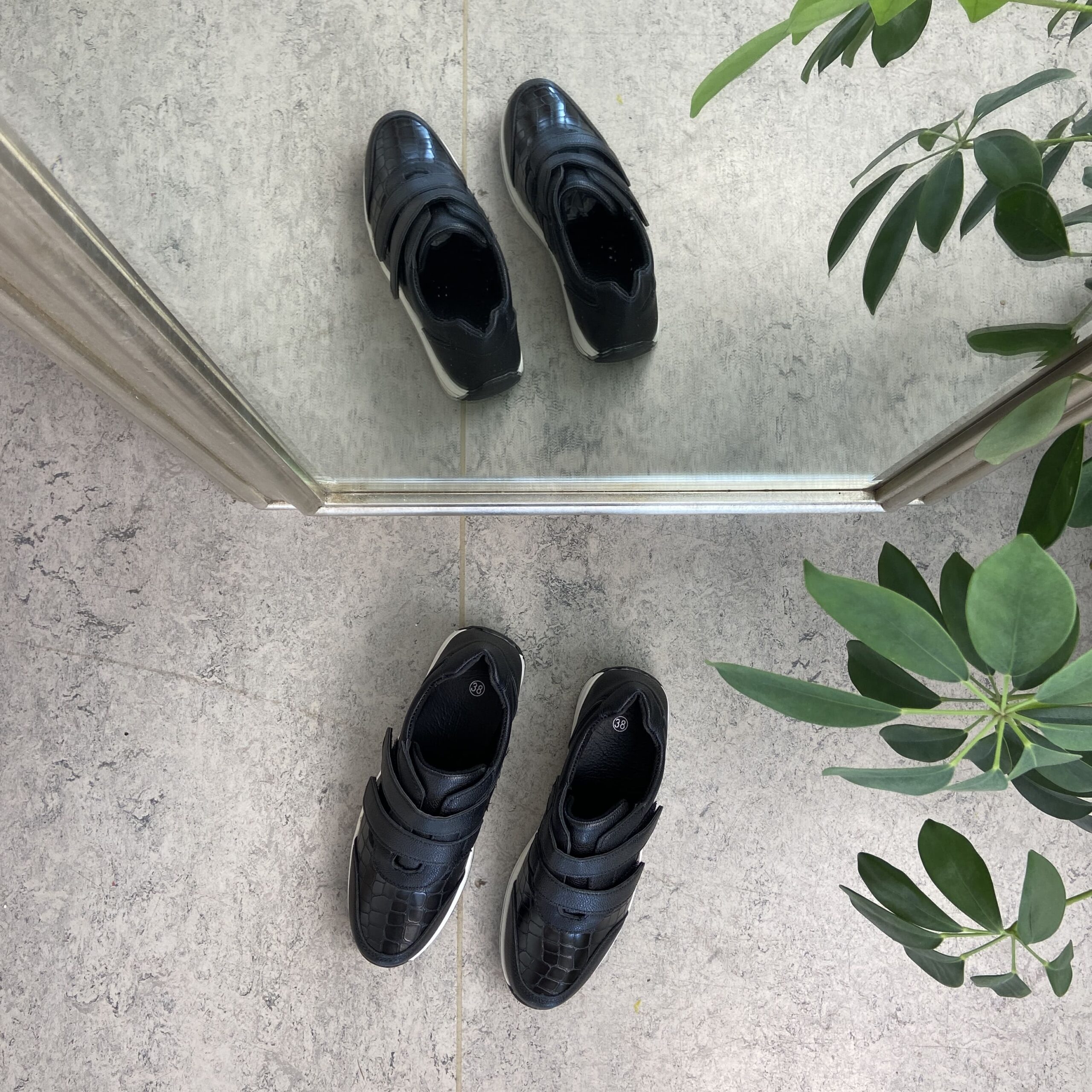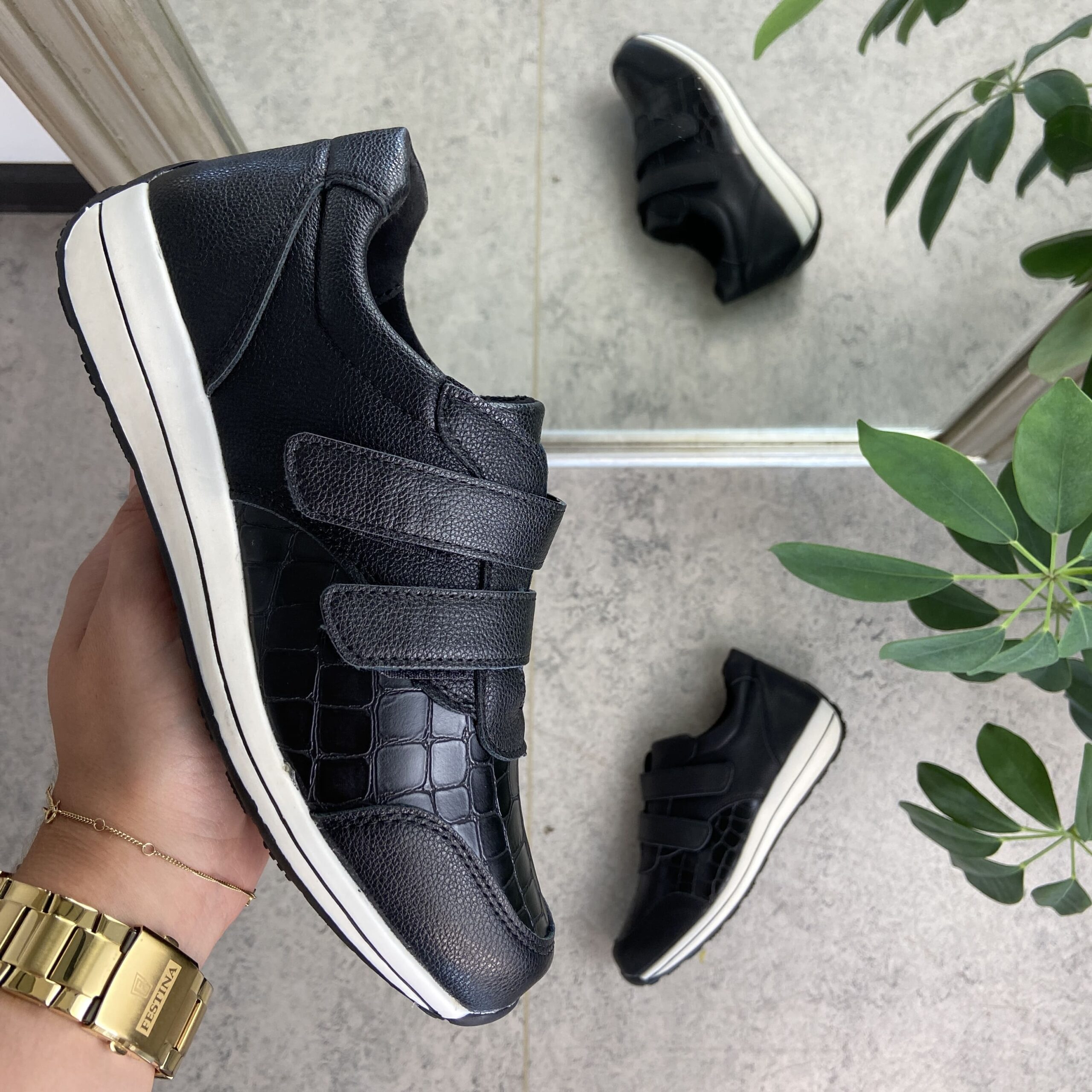 Sort sko med overdel i en smart kombinasjon av glatt og mønstret overflate.