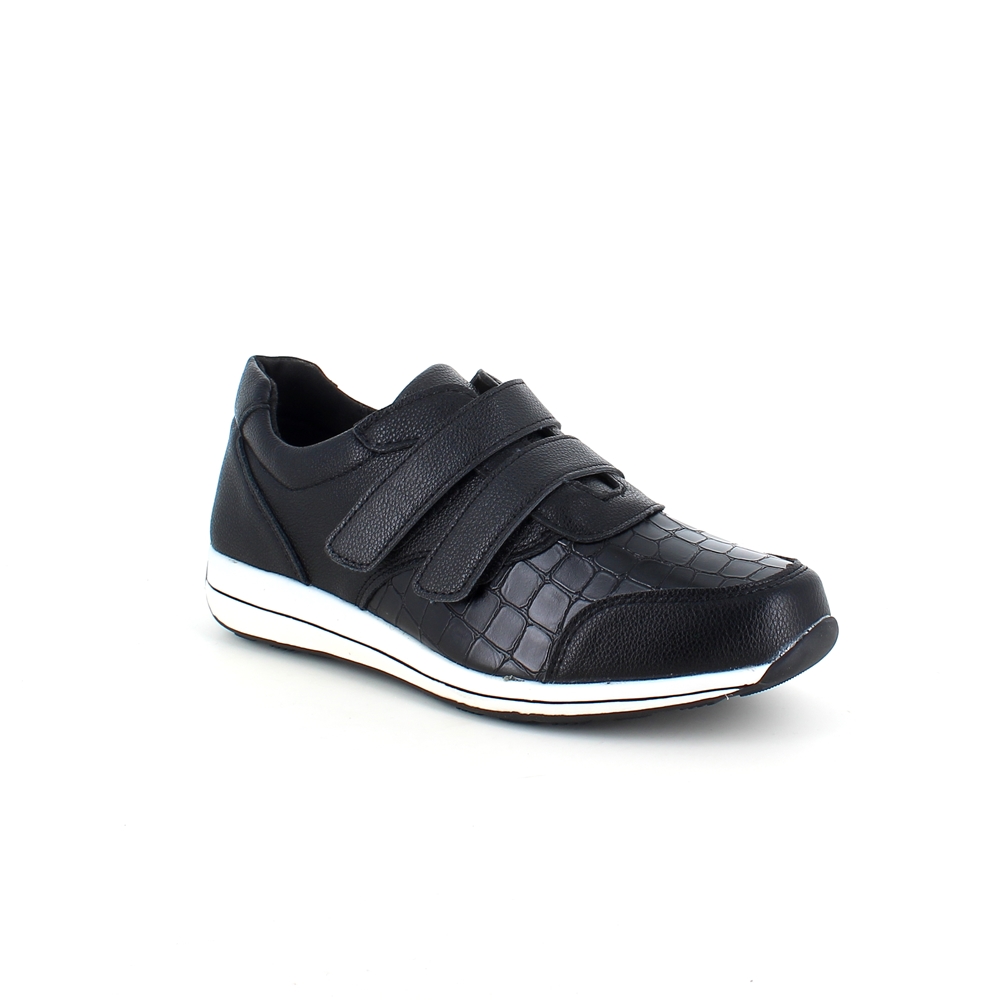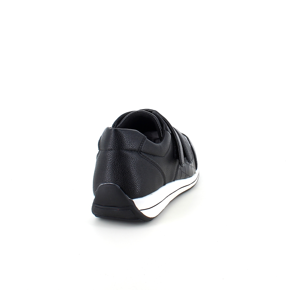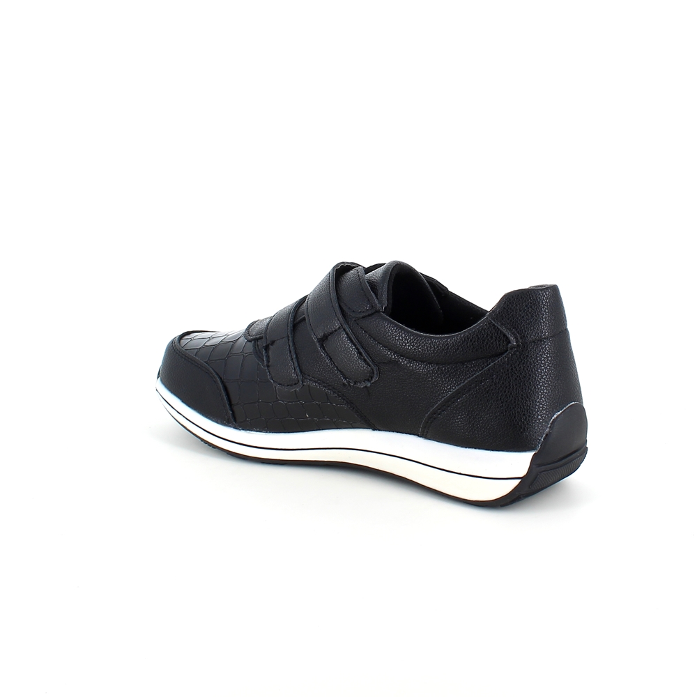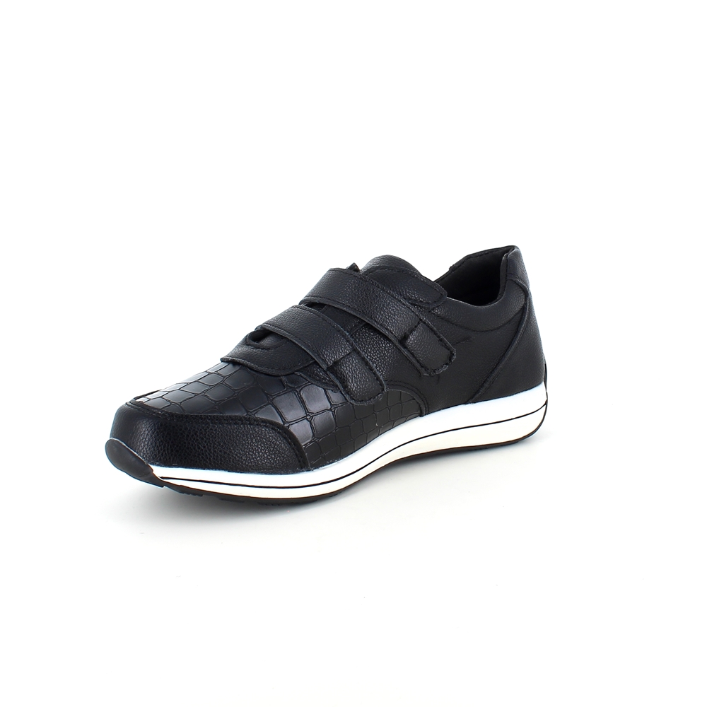 Sort sko med overdel i en smart kombinasjon av glatt og mønstret overflate.