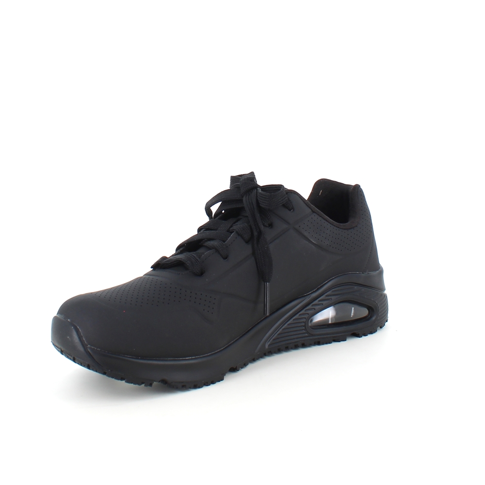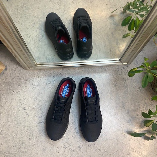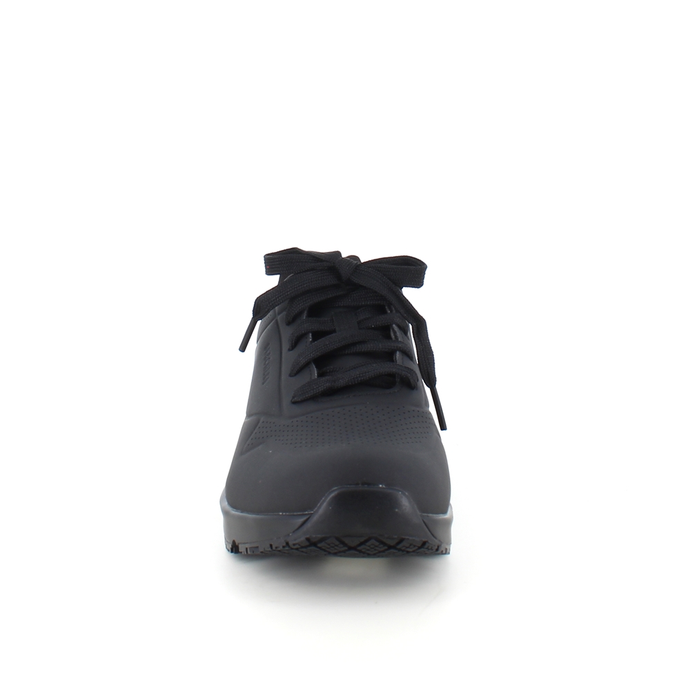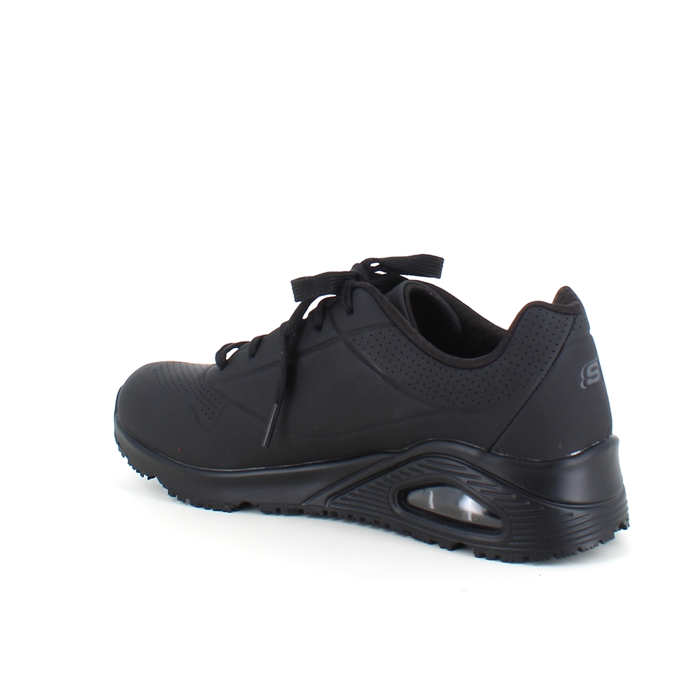 Sort arbeidssko fra Skechers med en glatt overflate som er enkel å rengjøre.