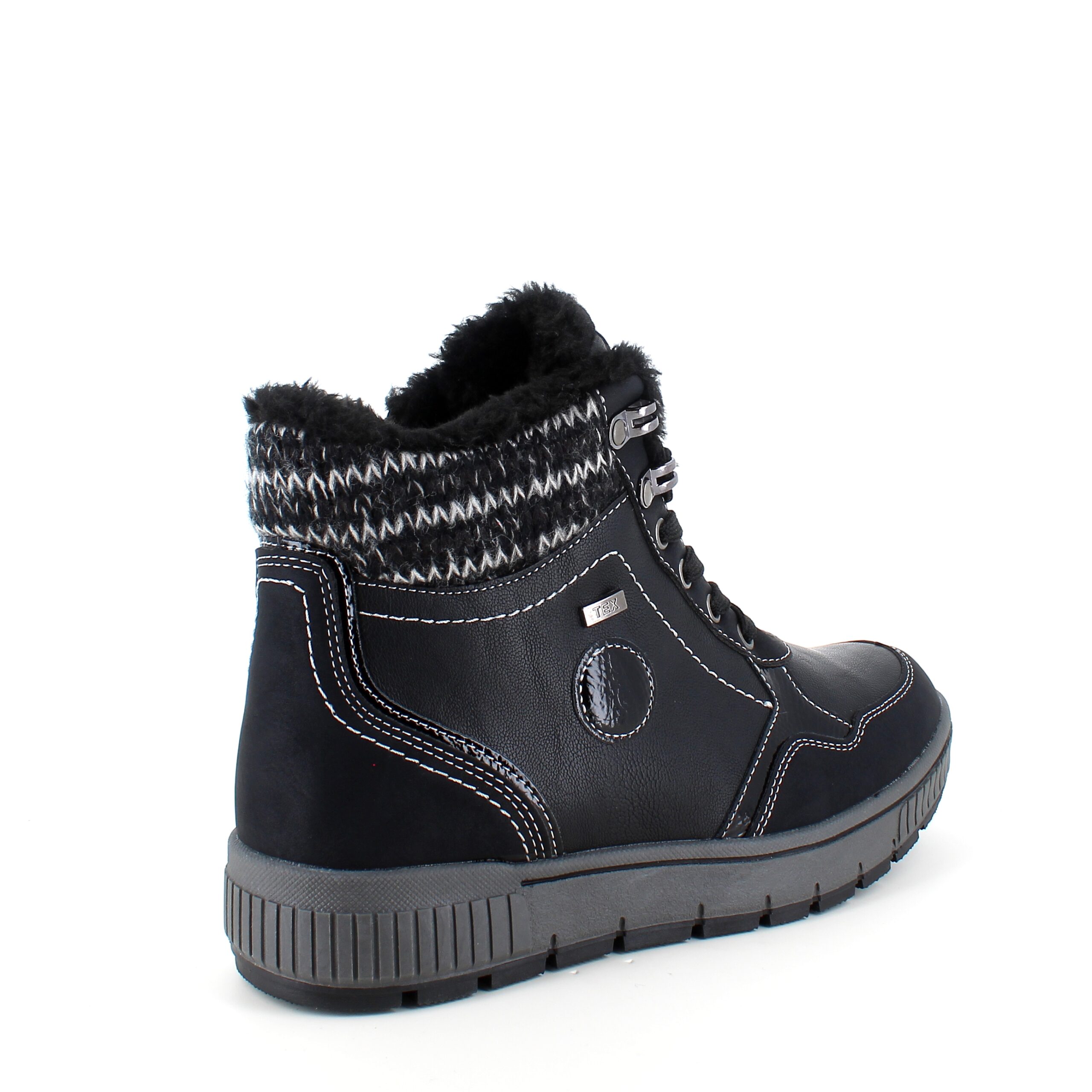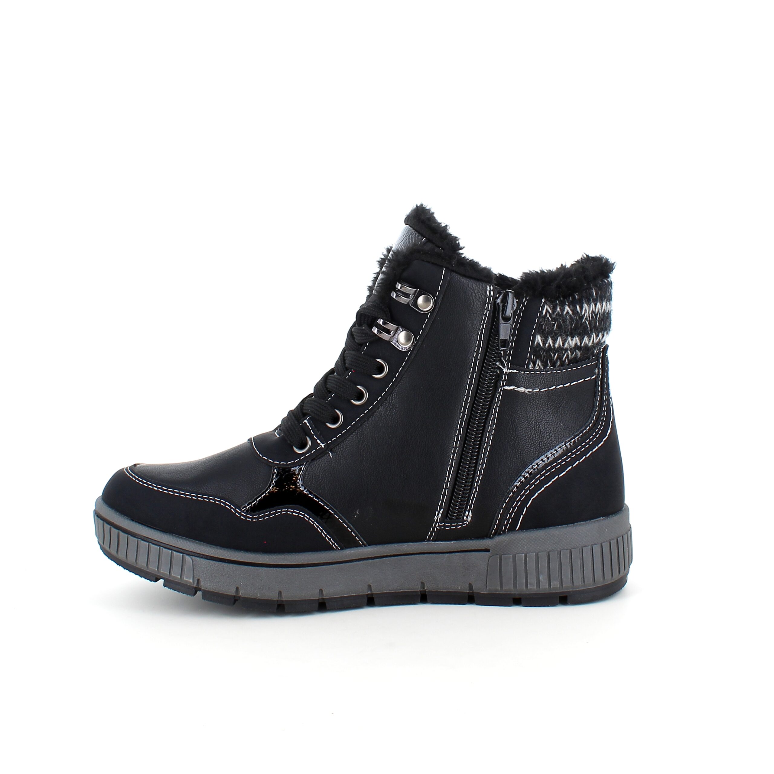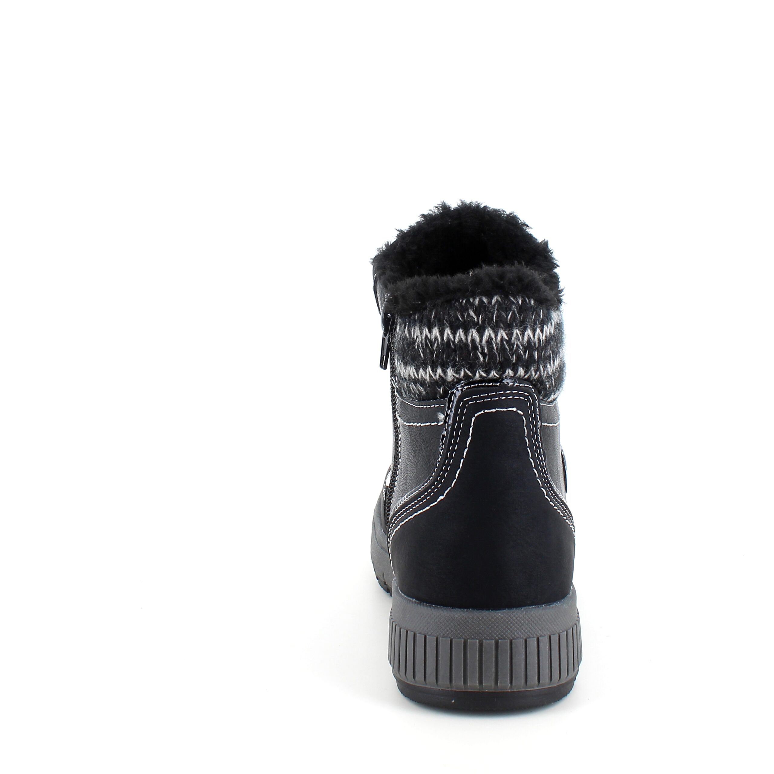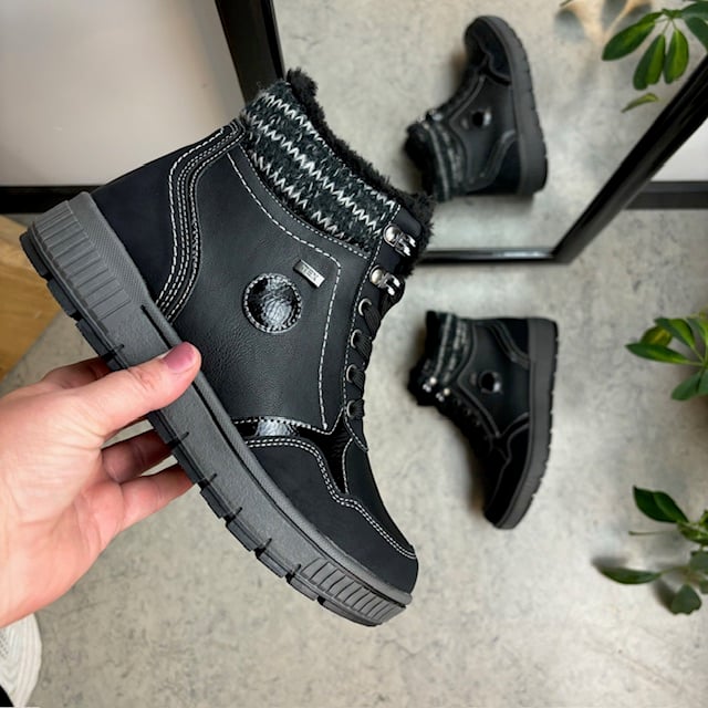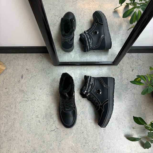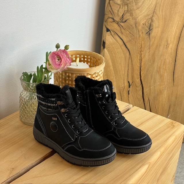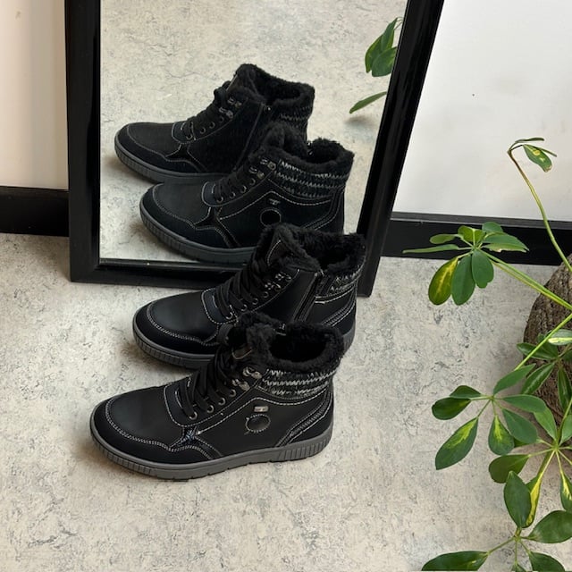 Flott svart støvel med kort skaft og strikket detalj øverst.