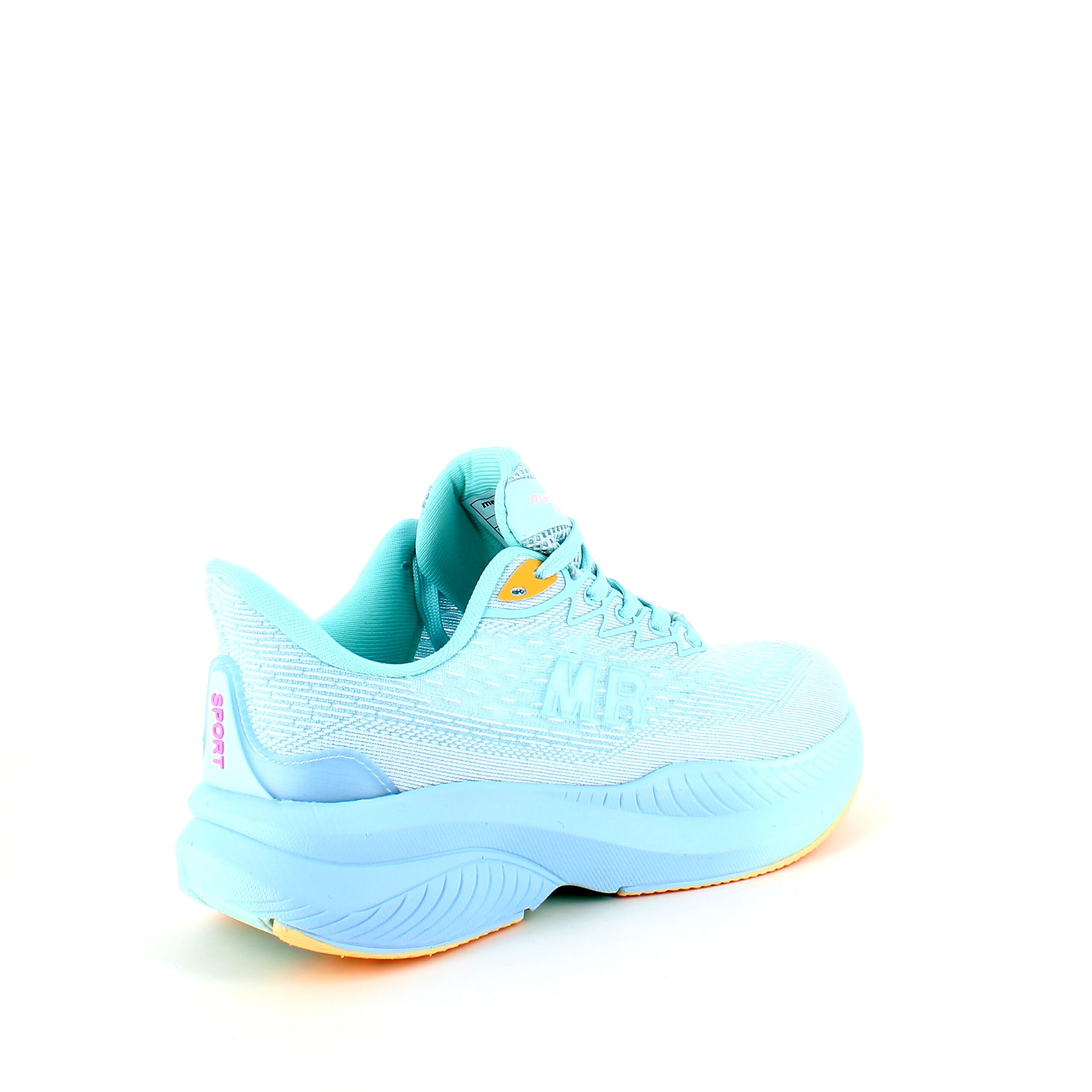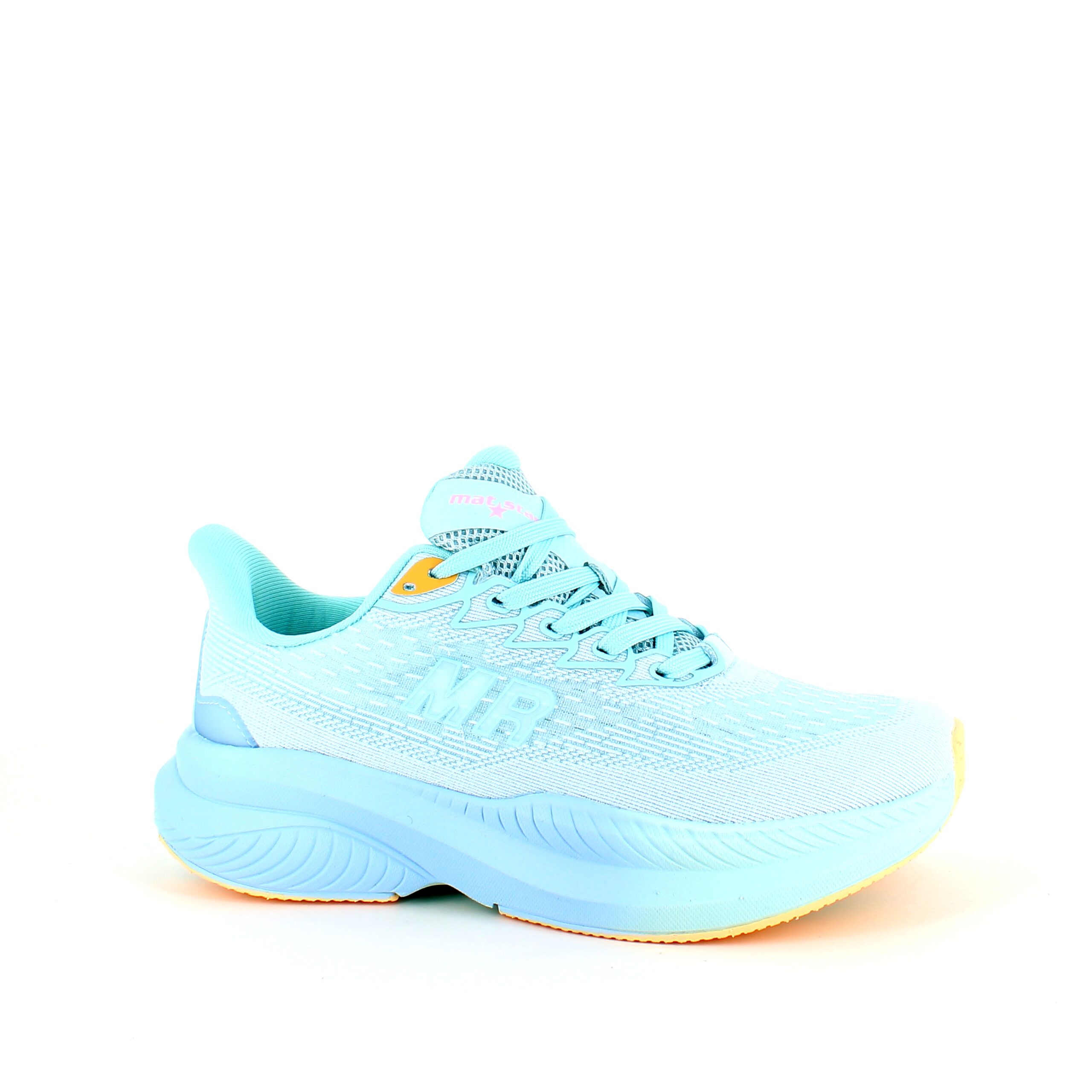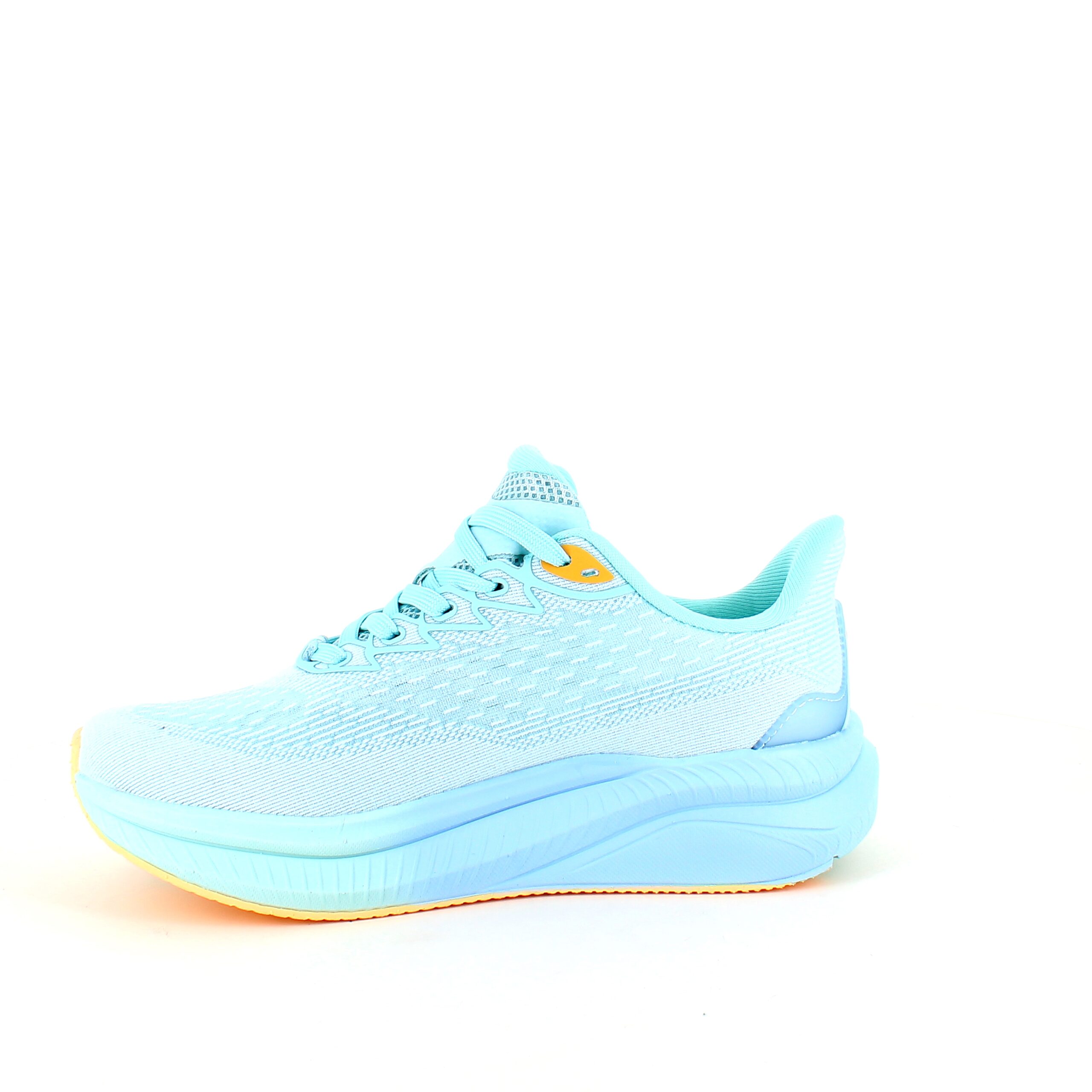 Disse sporty lettvektssko kombinerer en stilren turkis overdel med iøynefallende oransje detaljer ved lissene og sålen, noe som gir et moderne uttrykk.