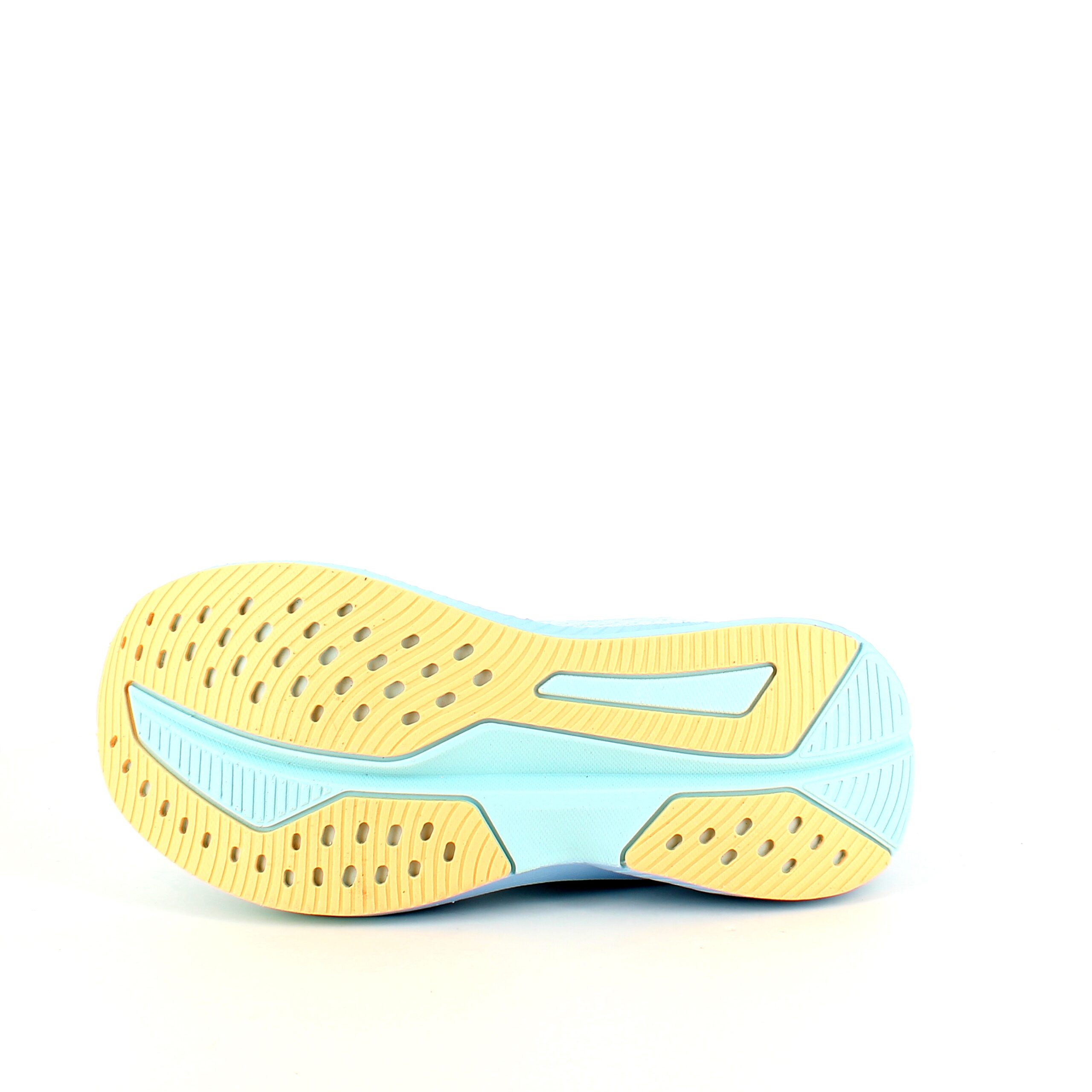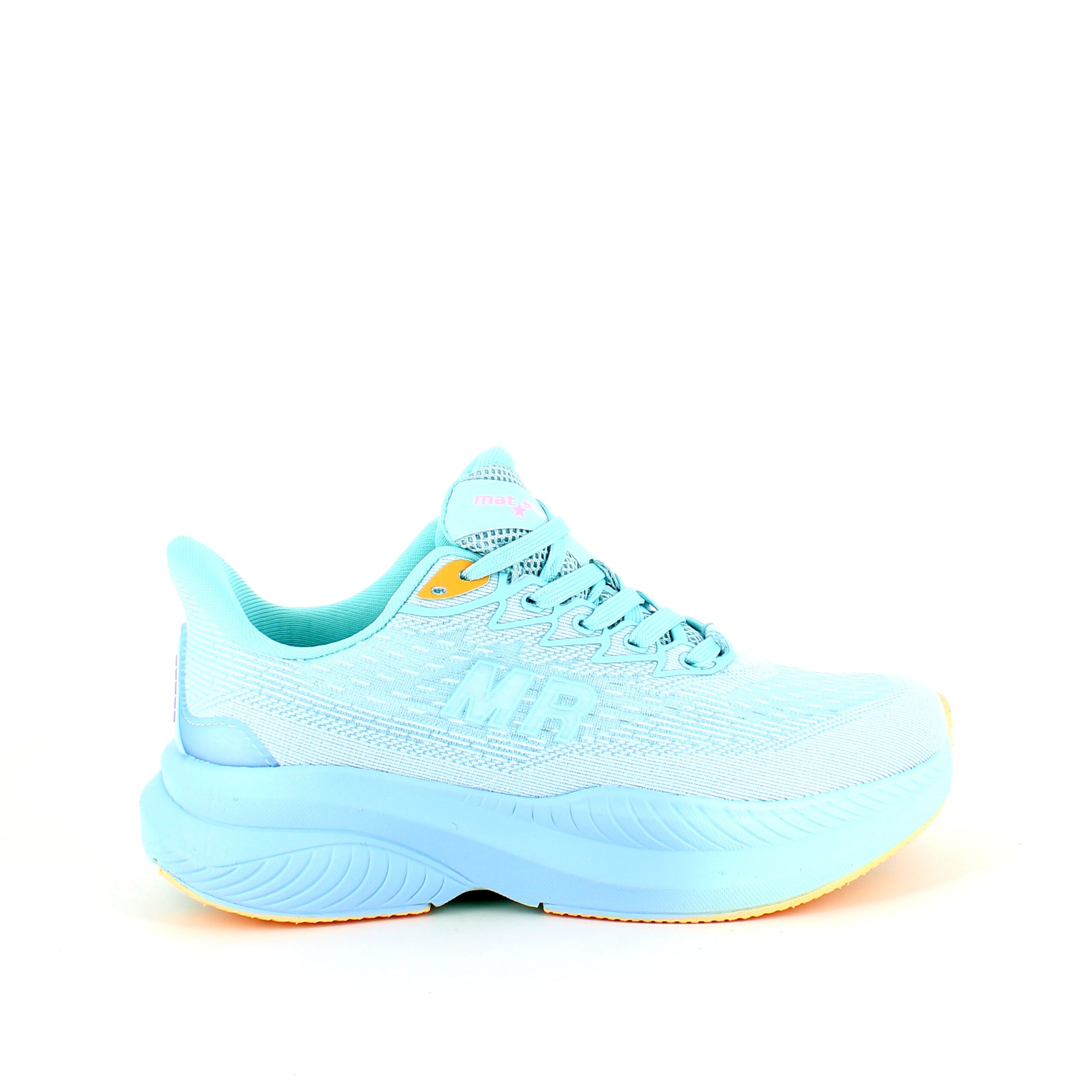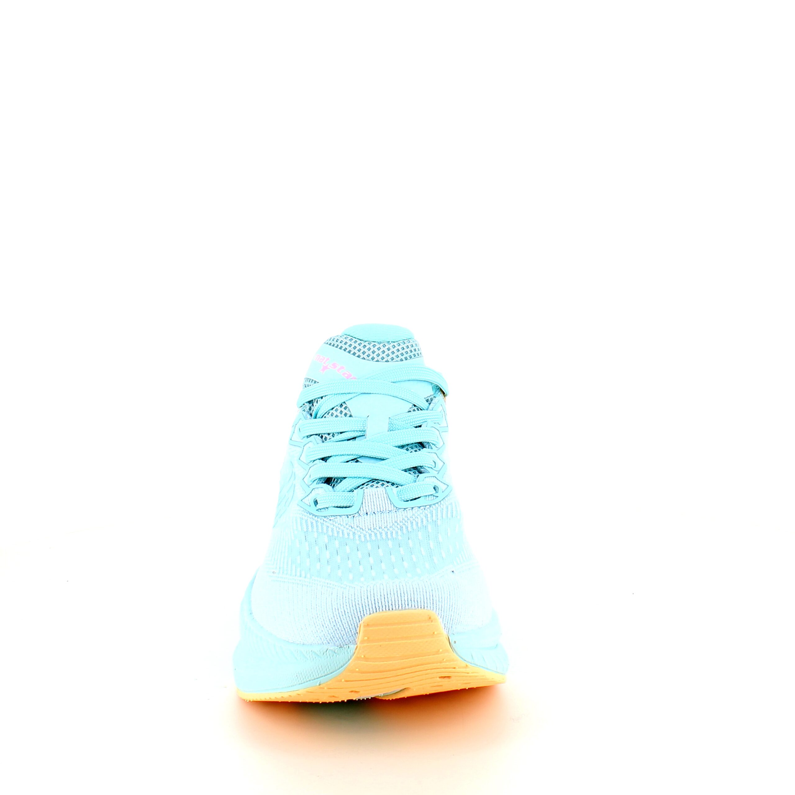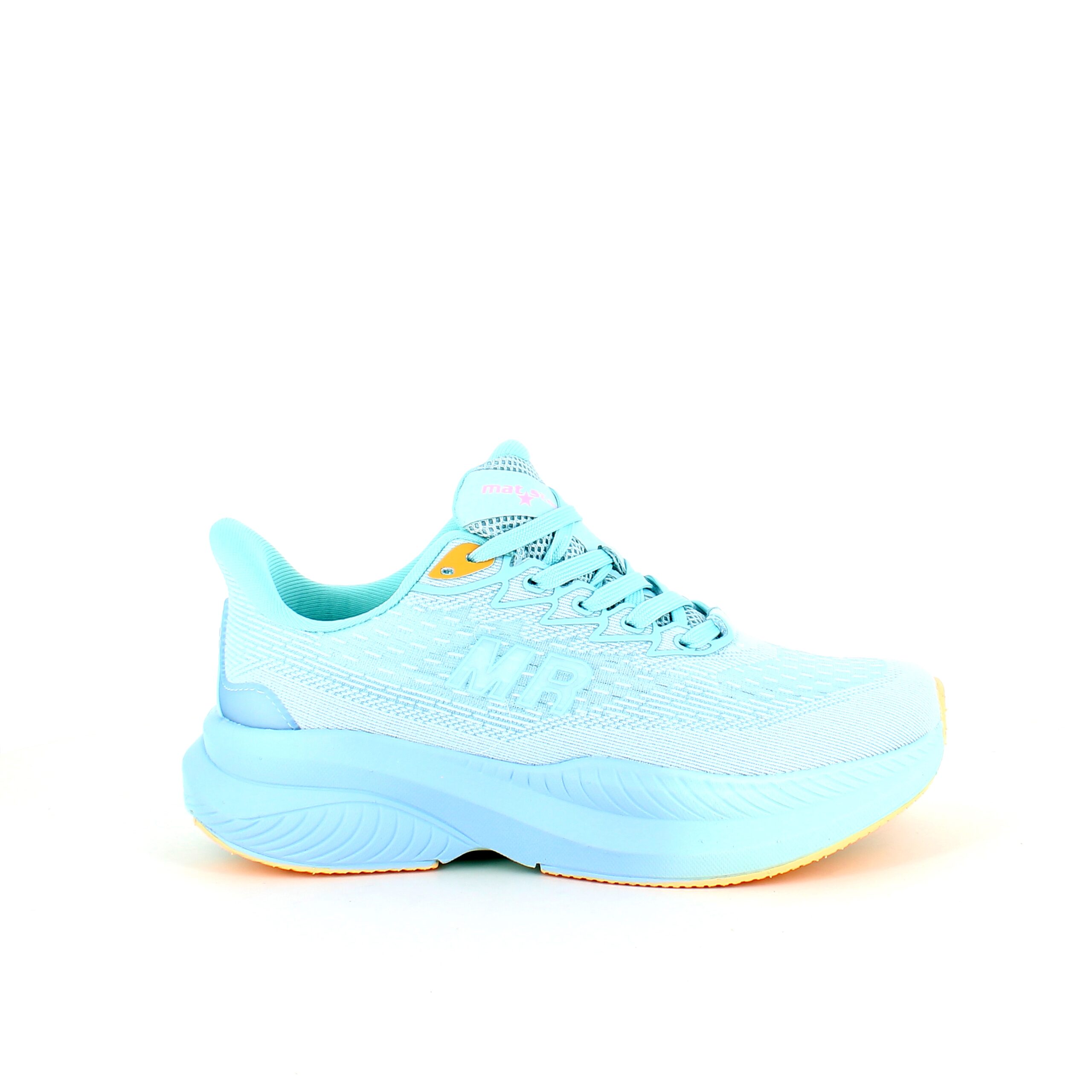 Disse sporty lettvektssko kombinerer en stilren turkis overdel med iøynefallende oransje detaljer ved lissene og sålen, noe som gir et moderne uttrykk.