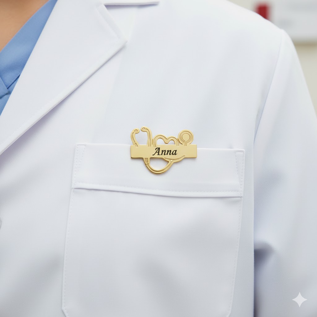 Dette elegante navneskiltet i gullfarget rustfritt stål er designet med et unikt stetoskopmotiv som danner et hjerte – et symbol på omsorg, faglig dyktighet og kjærlighet til helsearbeidet. Skiltet er perfekt for sykepleiere, leger, helsefagarbeidere og annet helsepersonell som ønsker et profesjonelt, men personlig uttrykk i uniformen sin.