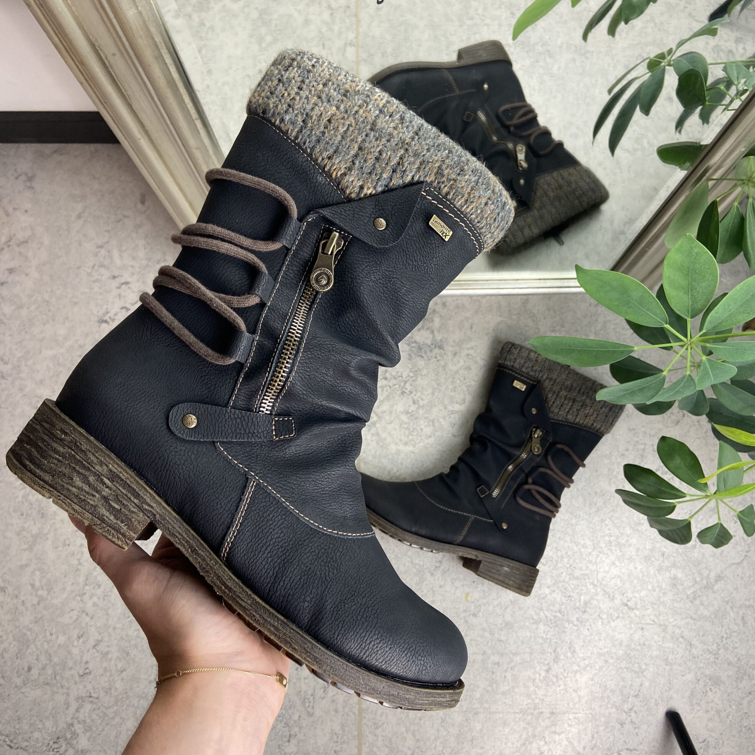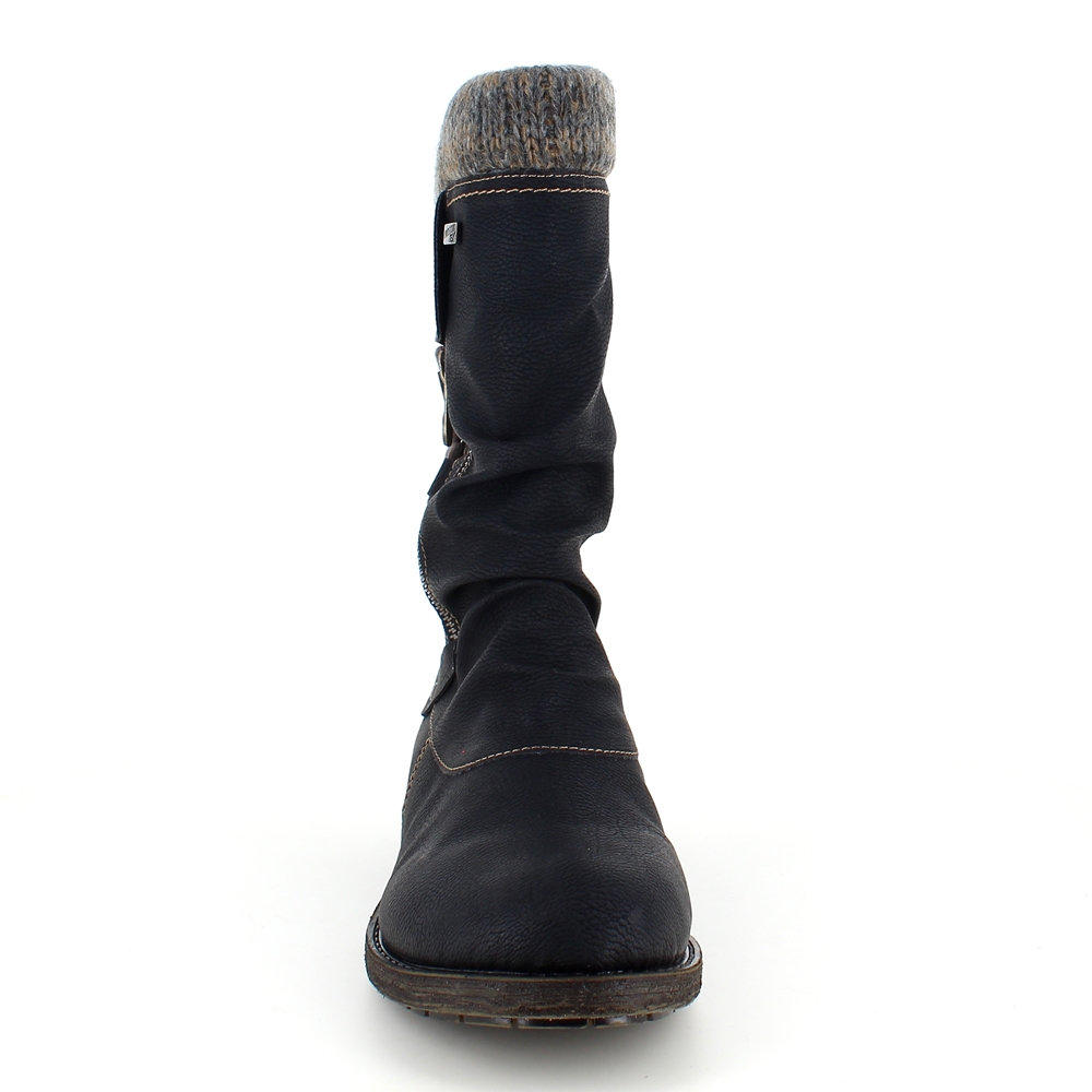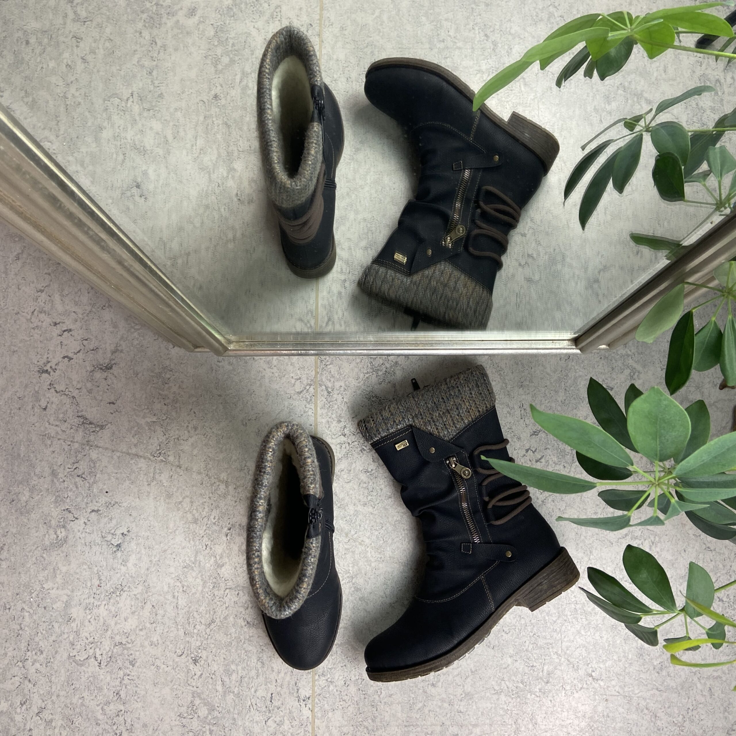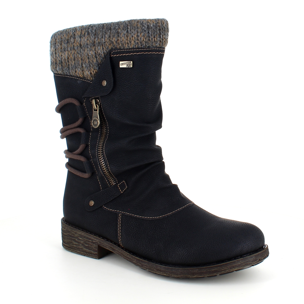 Sort vinterstøvel fra Remonte med mange smarte detaljer med glidelås på siden og snøring bak.