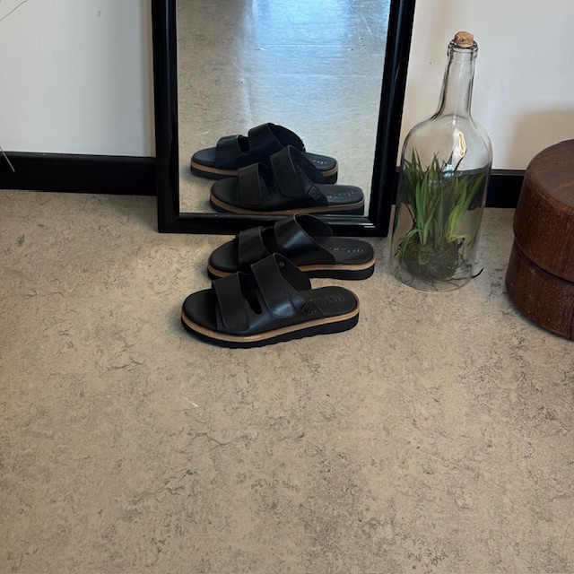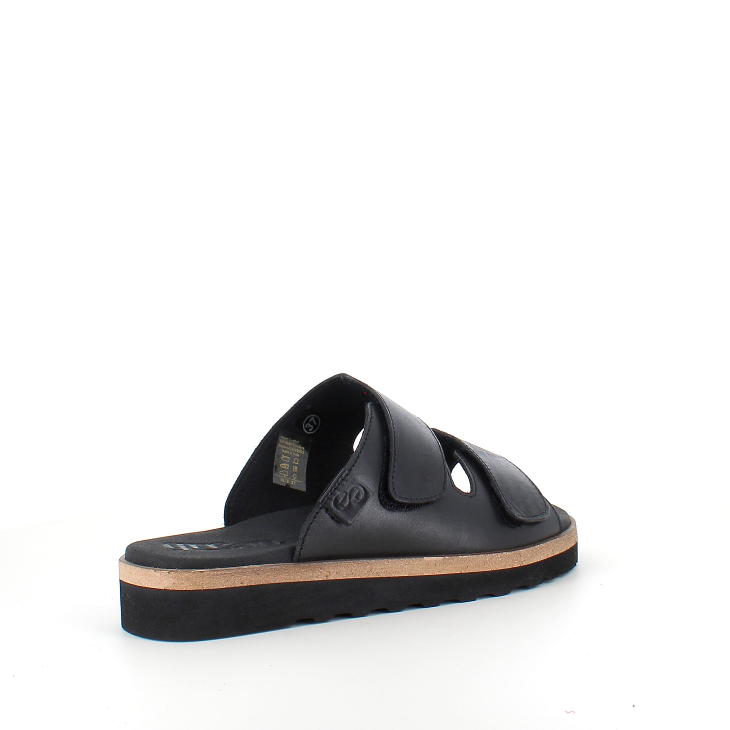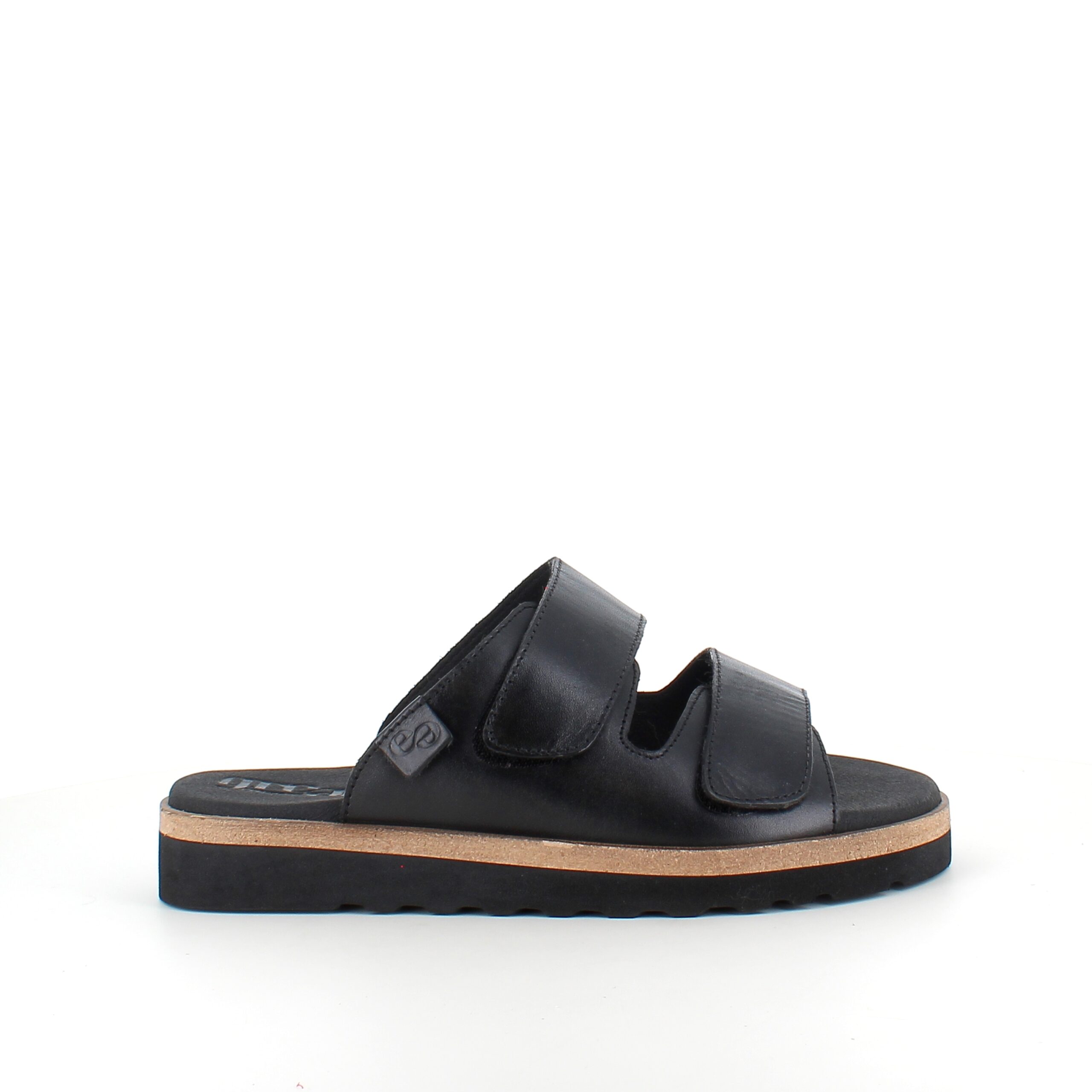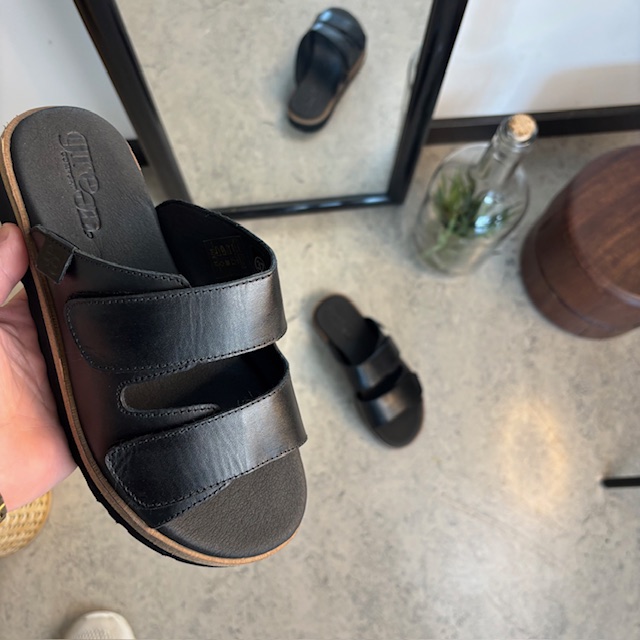 Myke skinnetøfler med brede justerbare borrelåsremmer for perfekt passform.