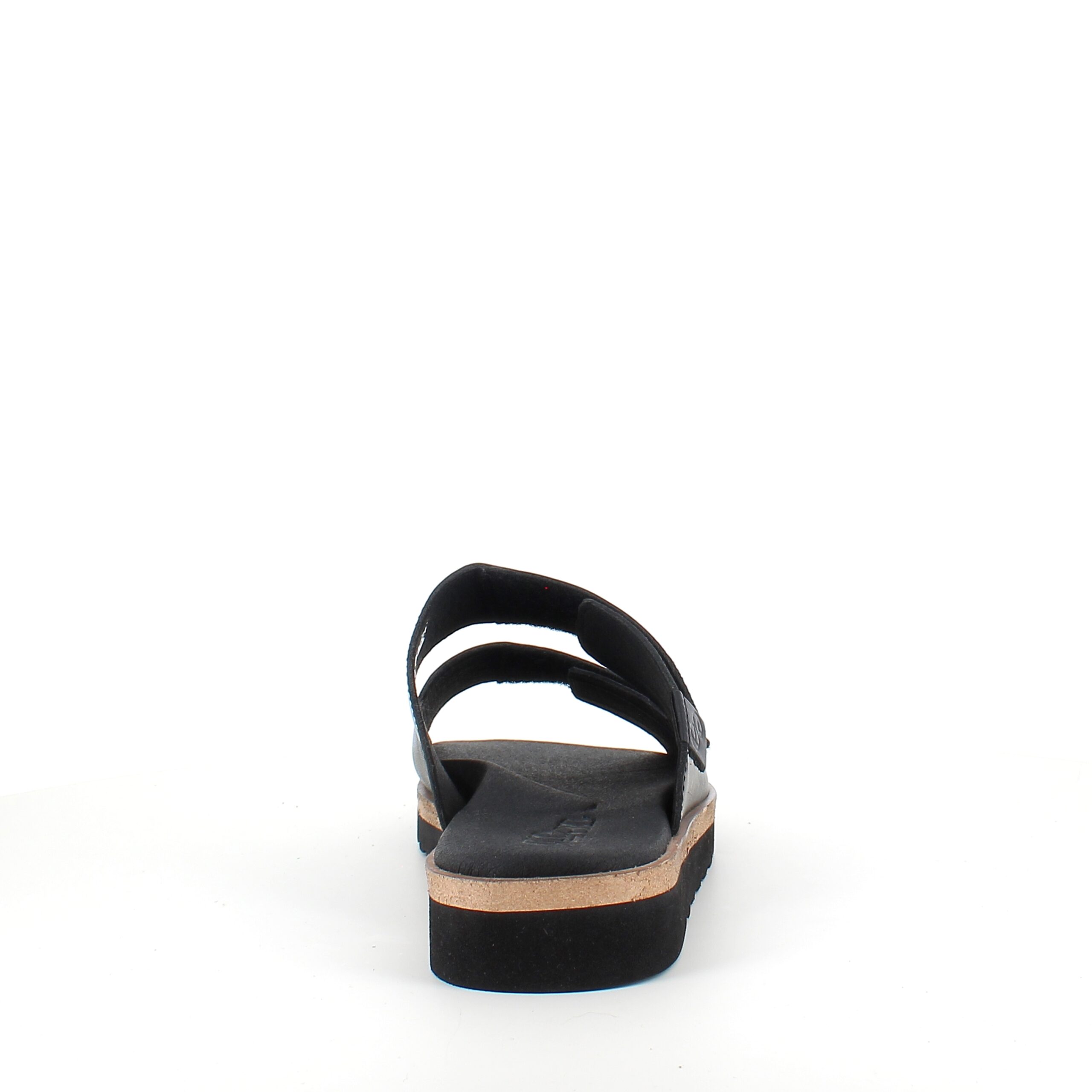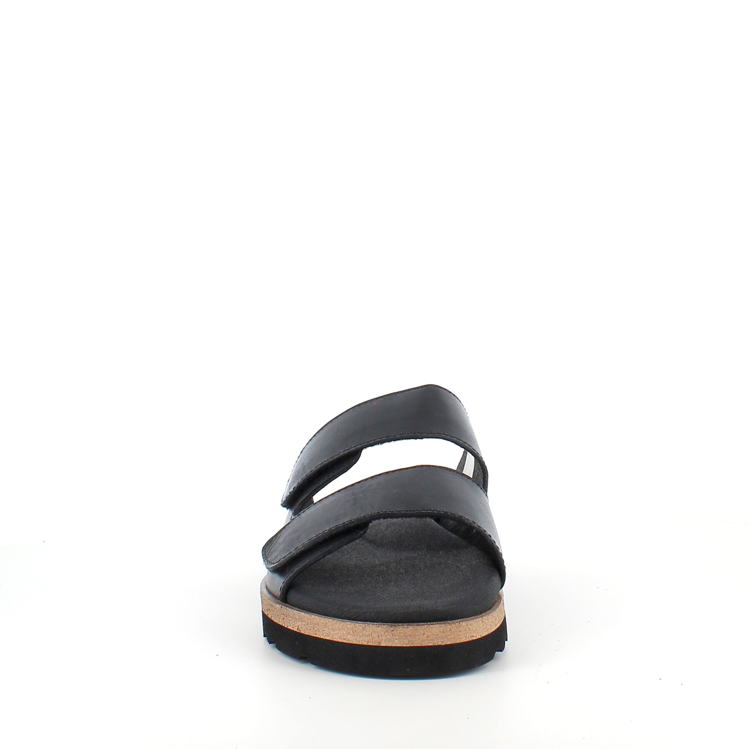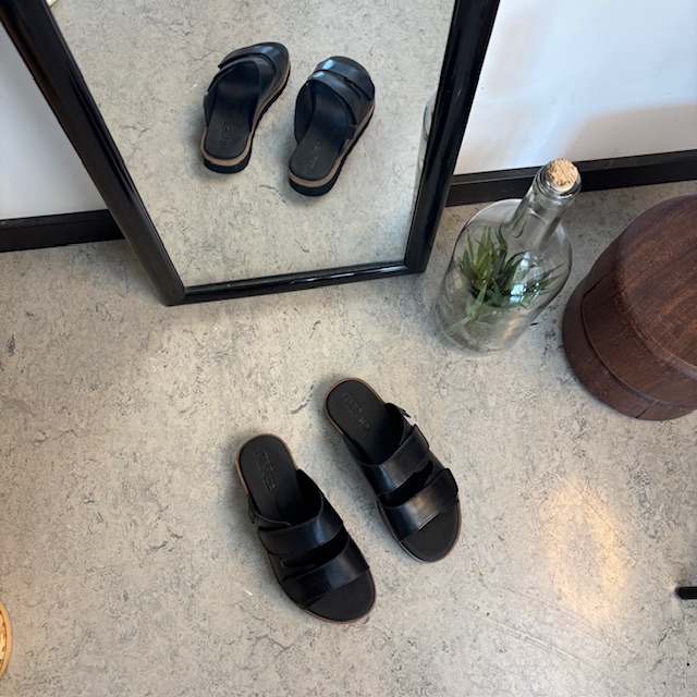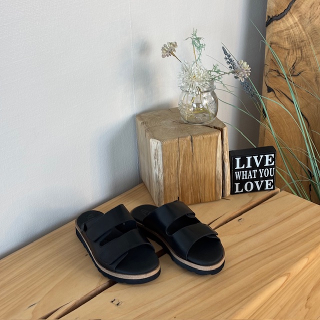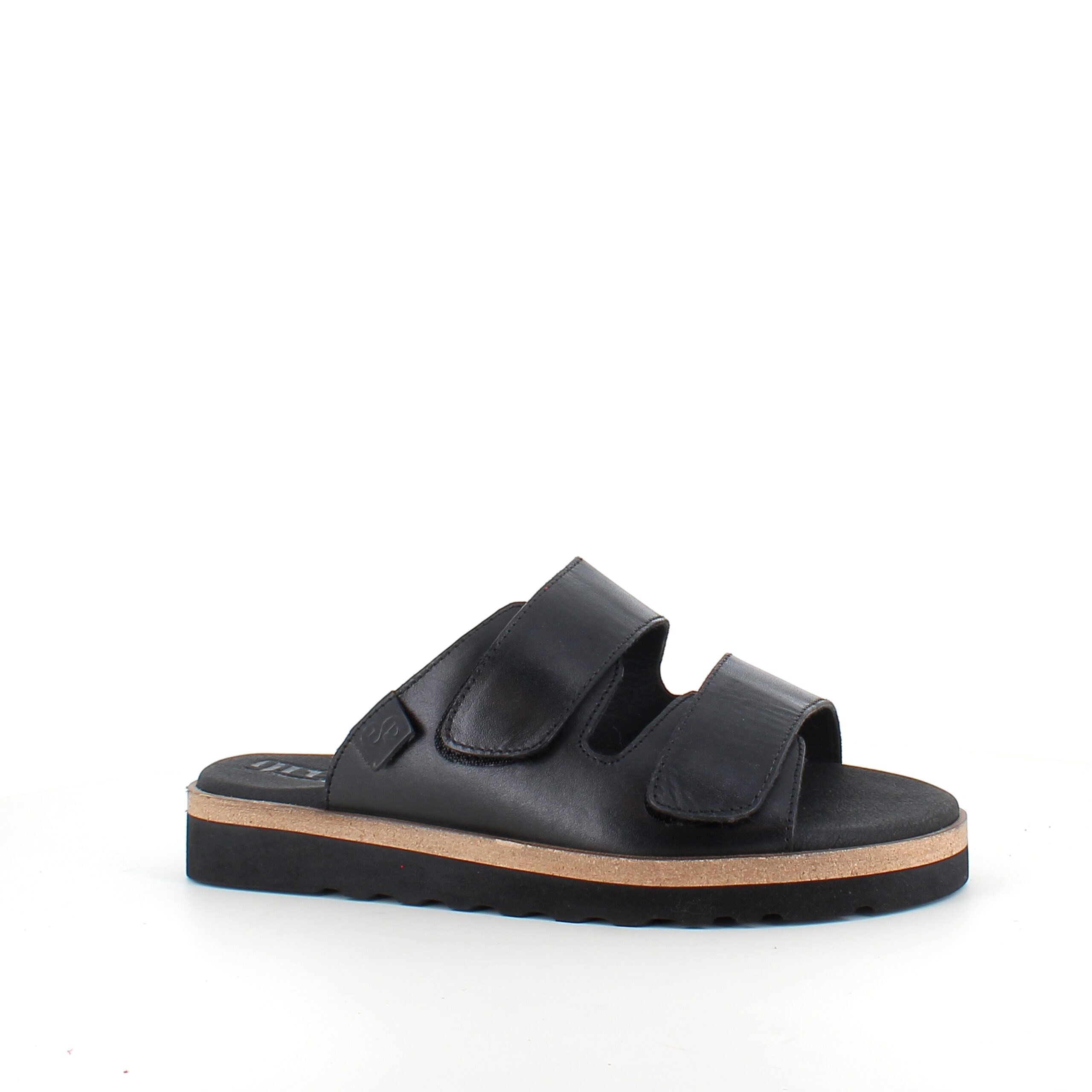 Myke skinnetøfler med brede justerbare borrelåsremmer for perfekt passform.