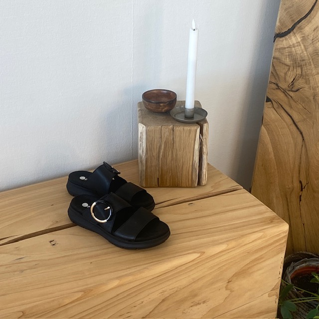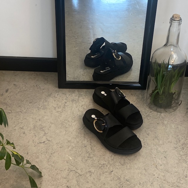 Sandalen er laget av sort glatt skinn og kombinerer eleganse med praktisk design.