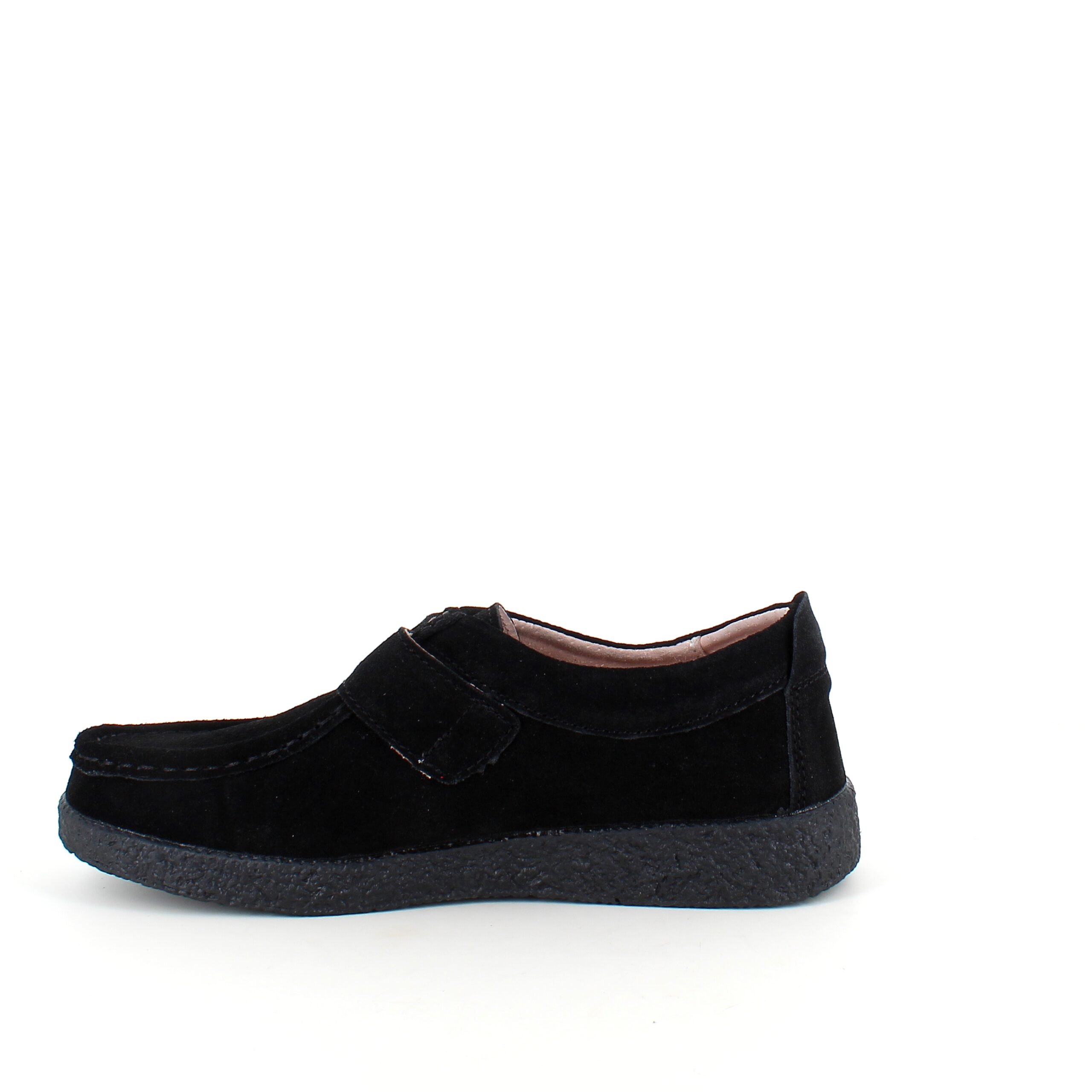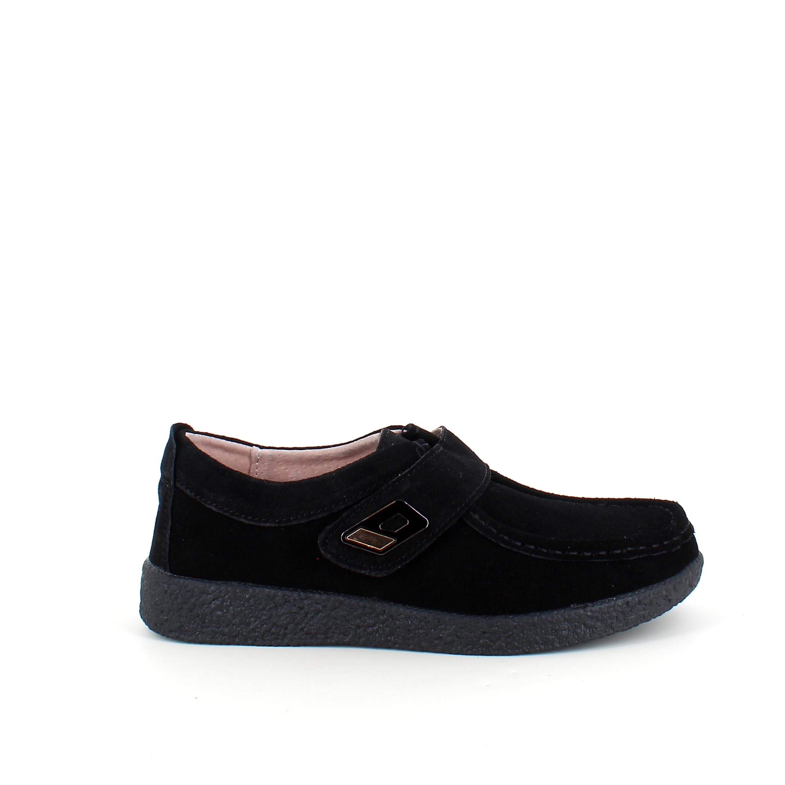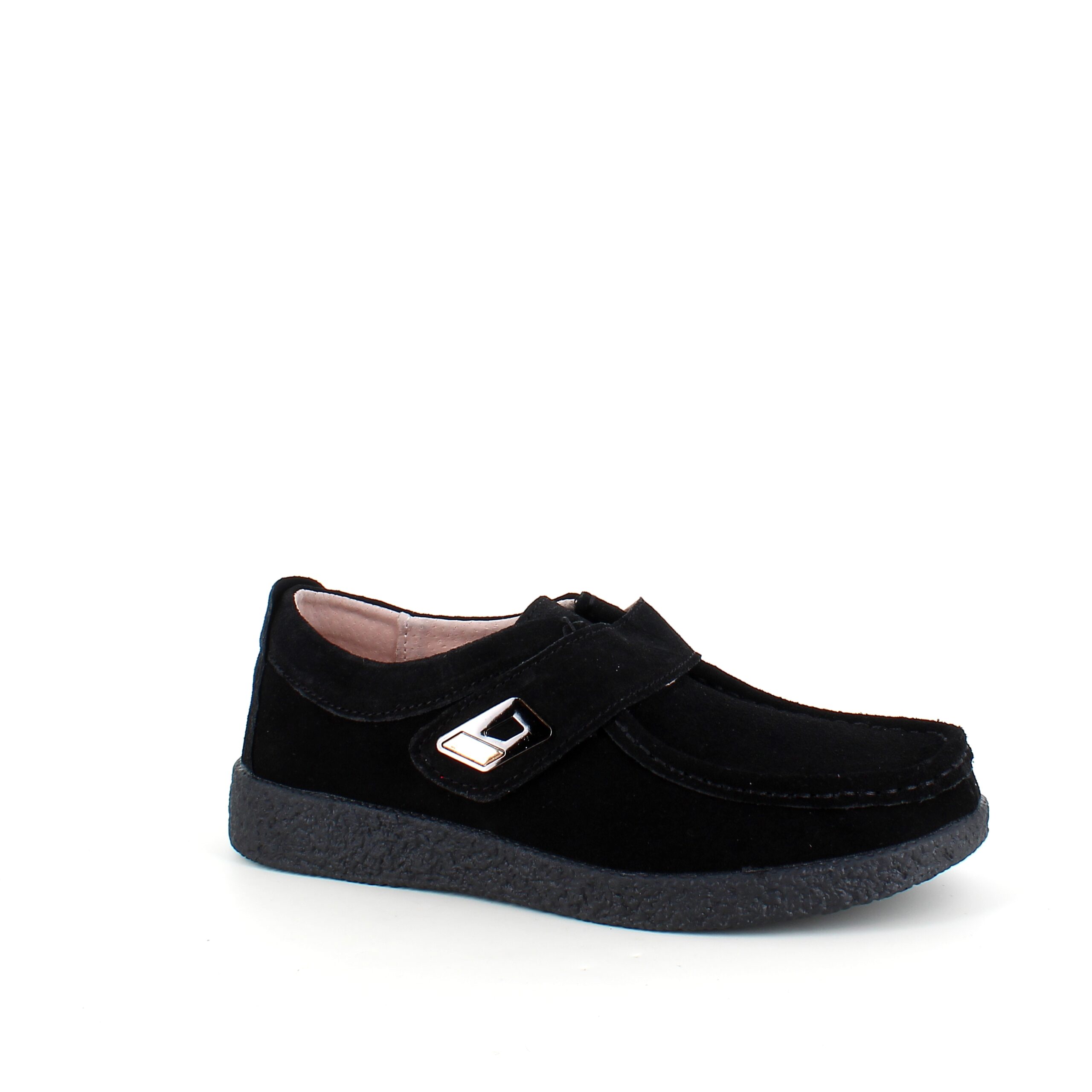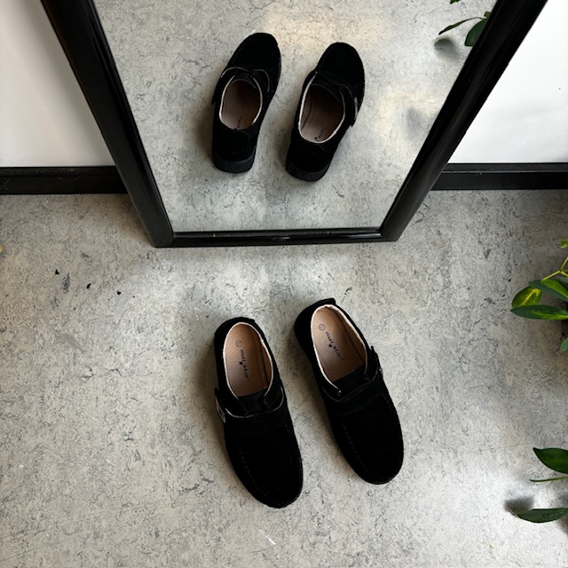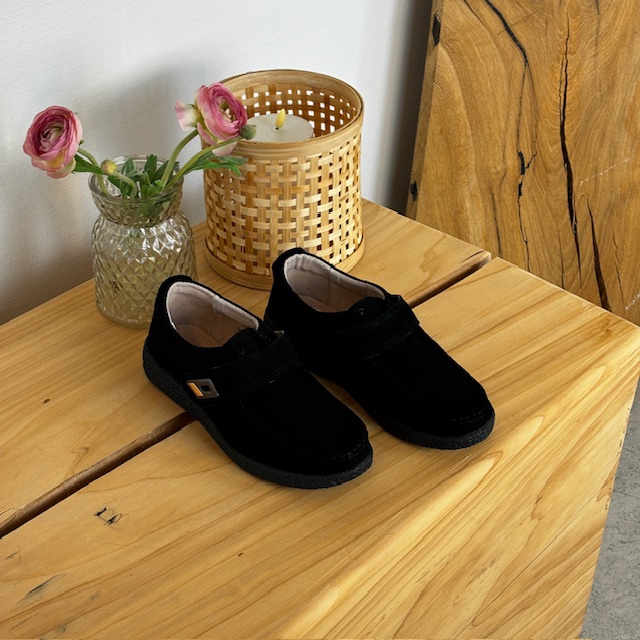 Sort ruskinnsko med gummisåle har en elegant design med et blankt spenne på borrelåsremmen.