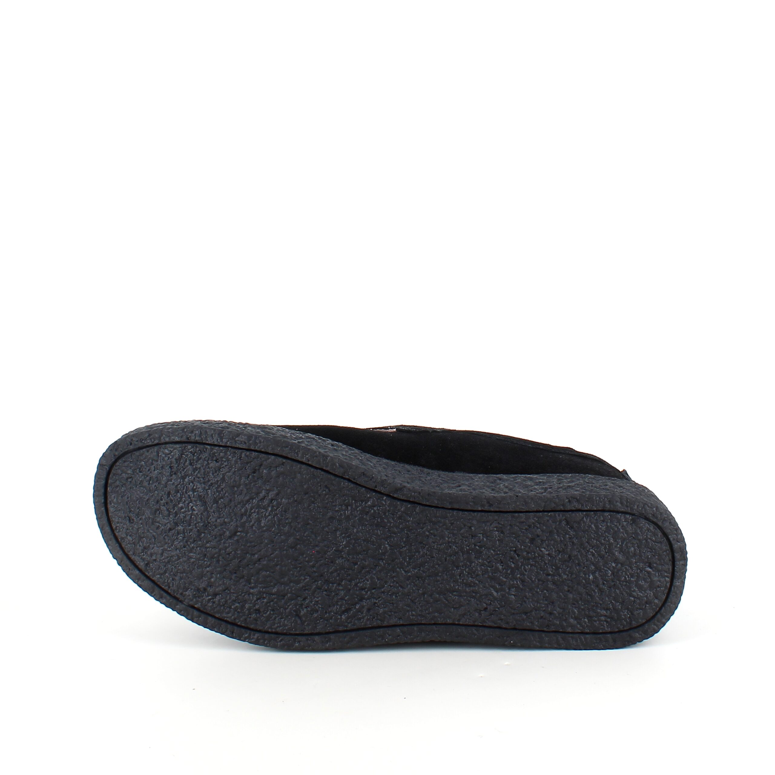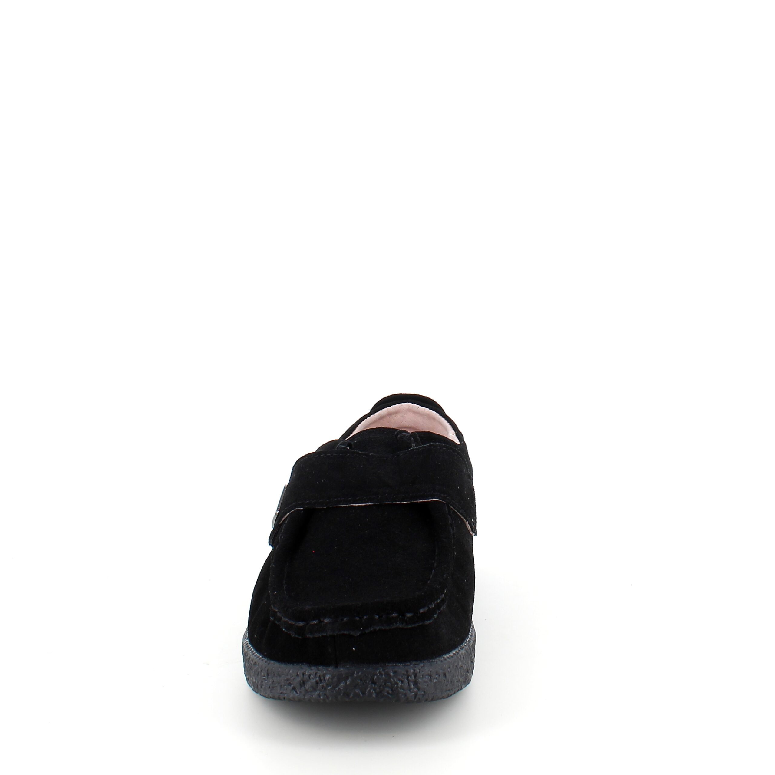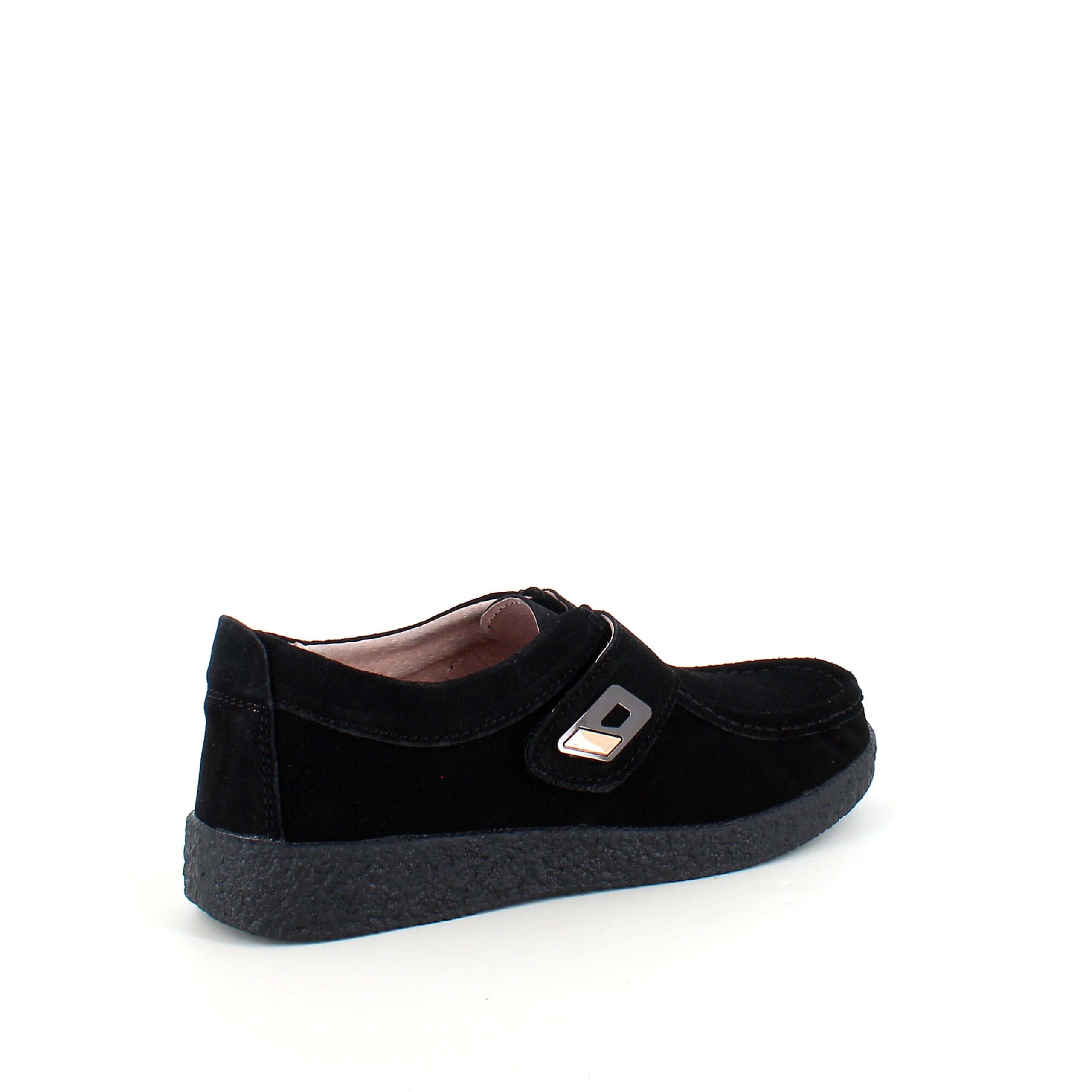 Sort ruskinnsko med gummisåle har en elegant design med et blankt spenne på borrelåsremmen.