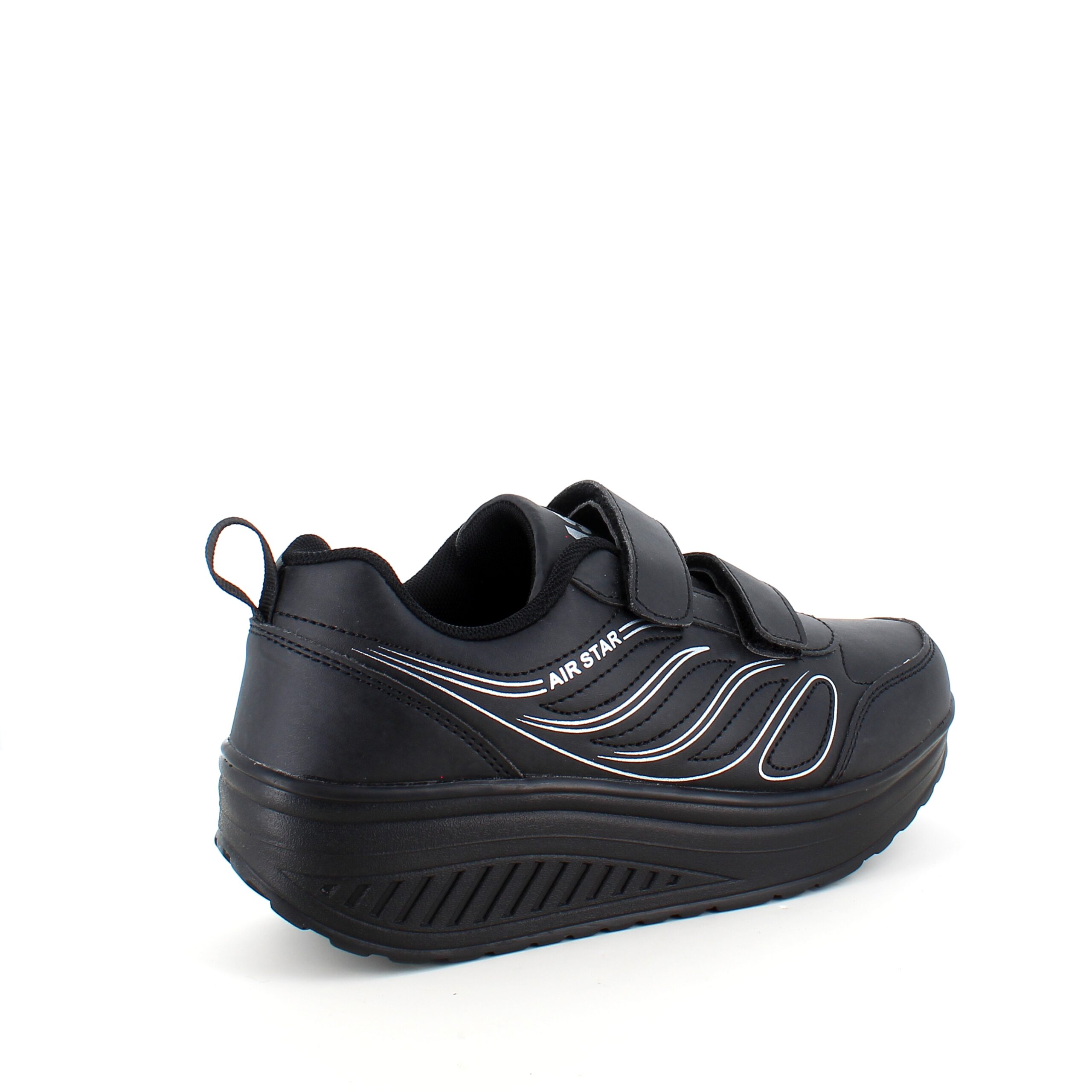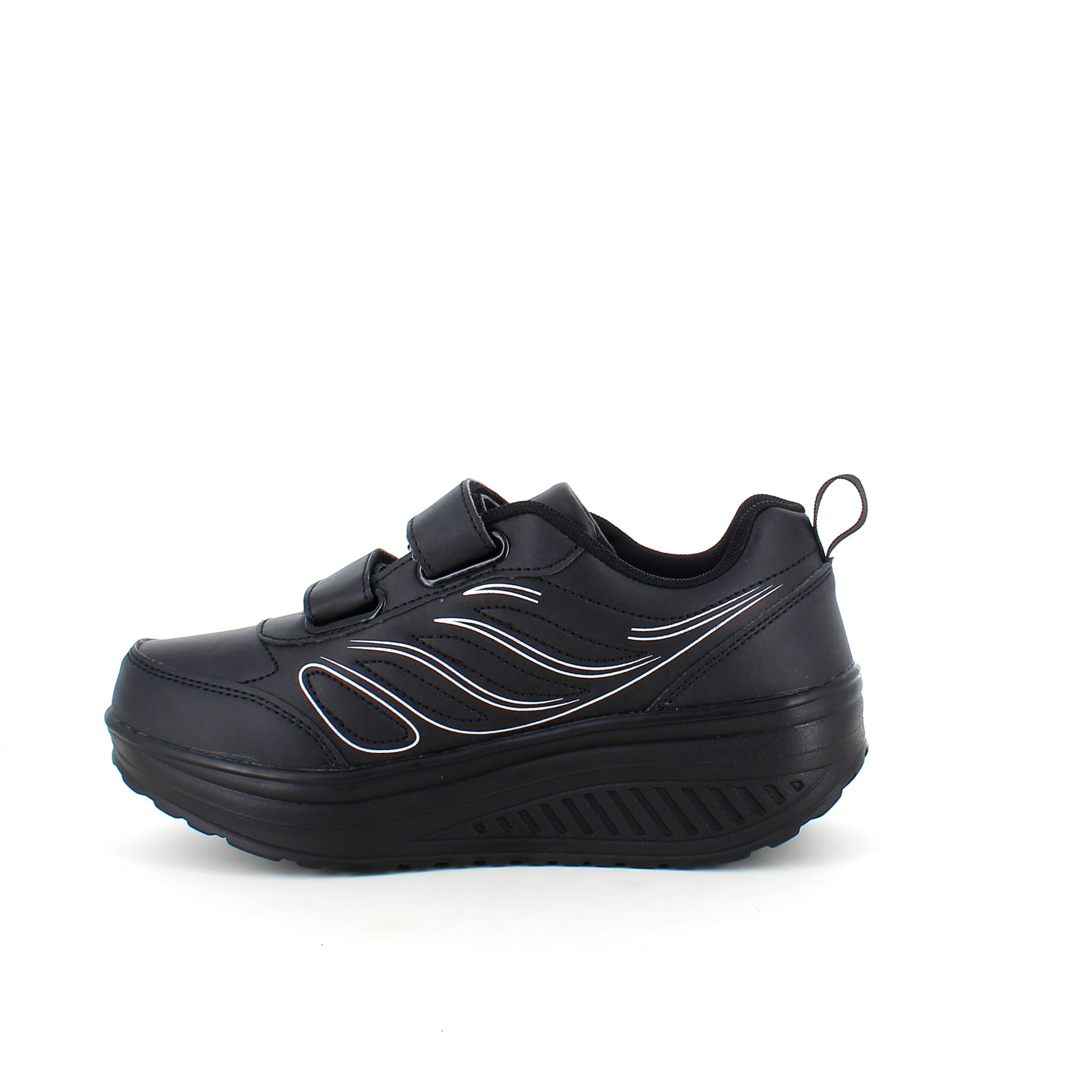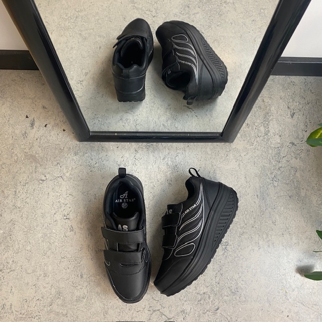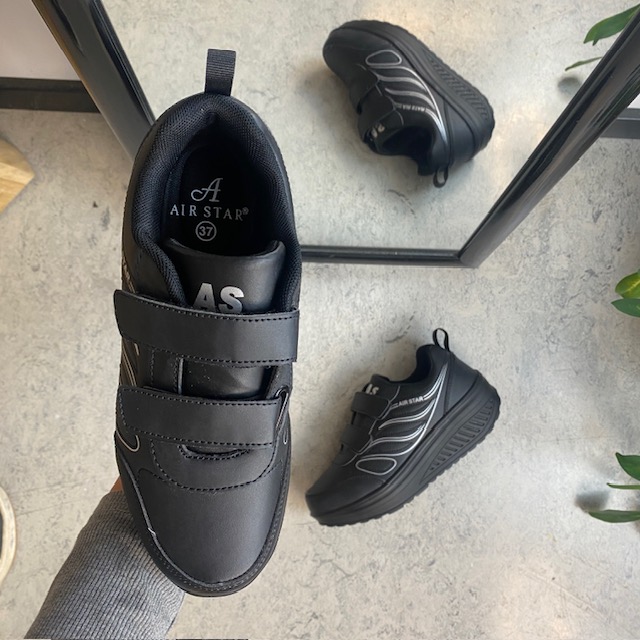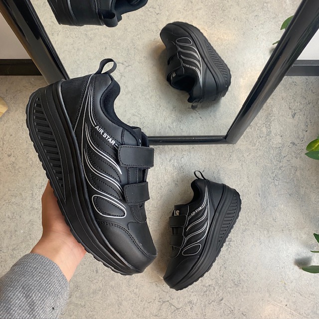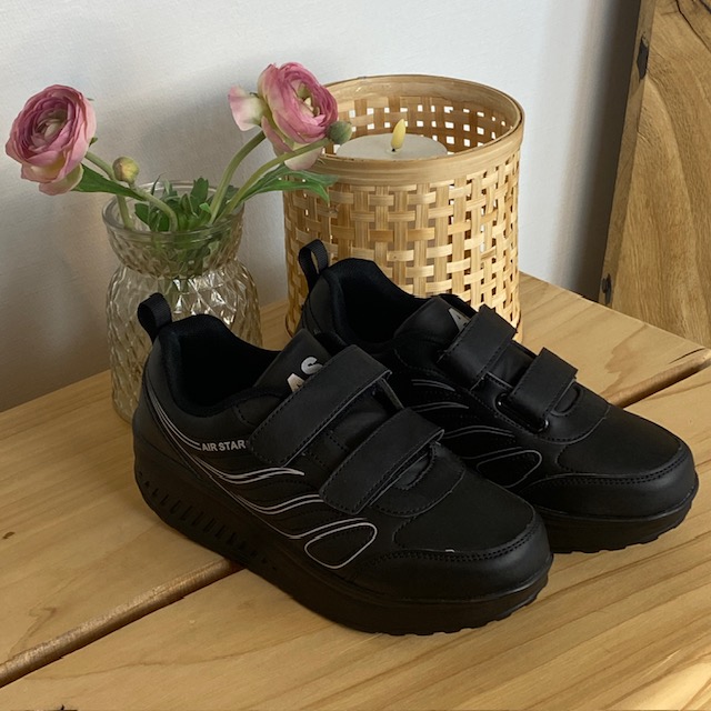 Sort sportssko med borrelåslukning og svingbar såle.