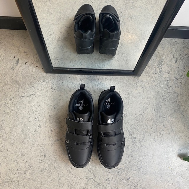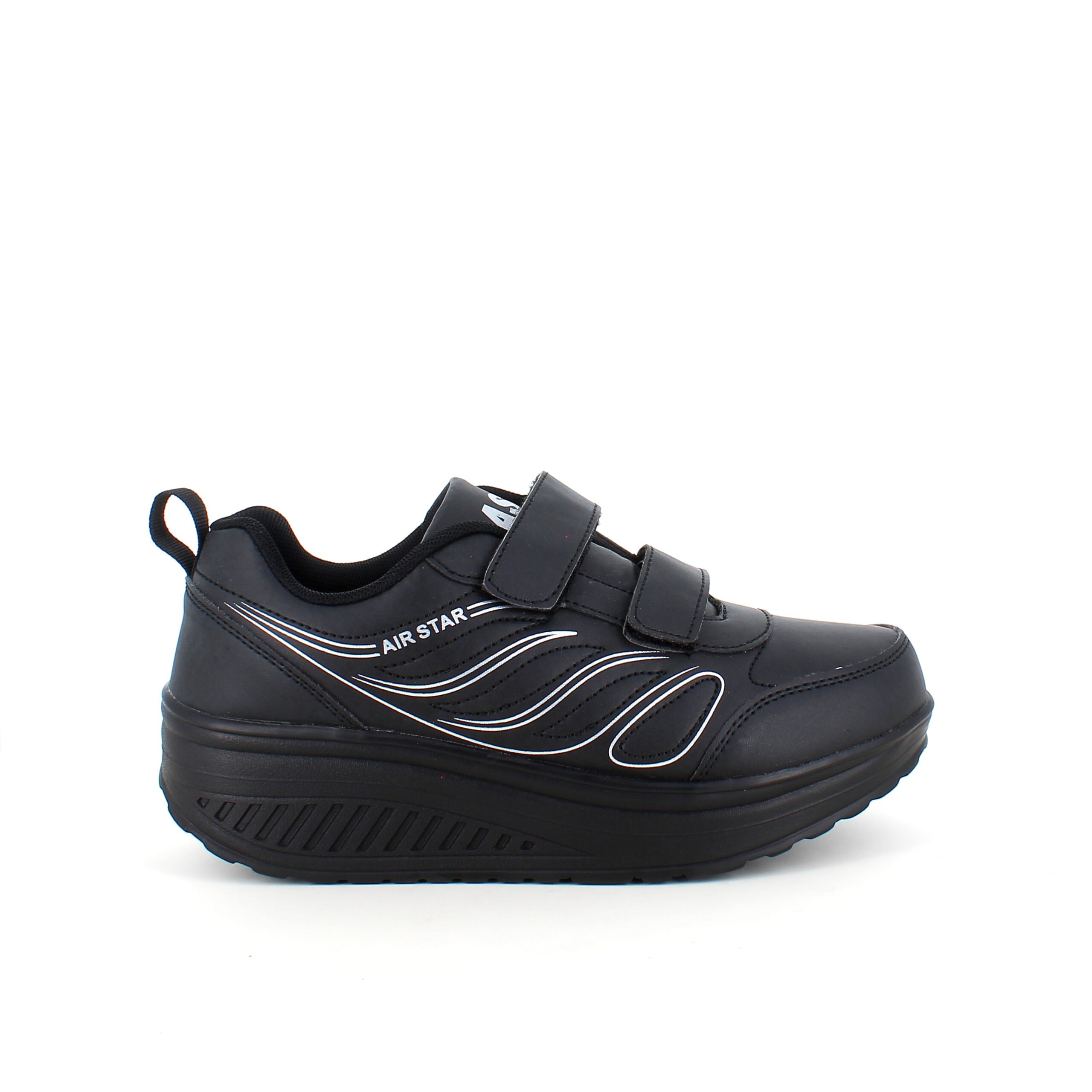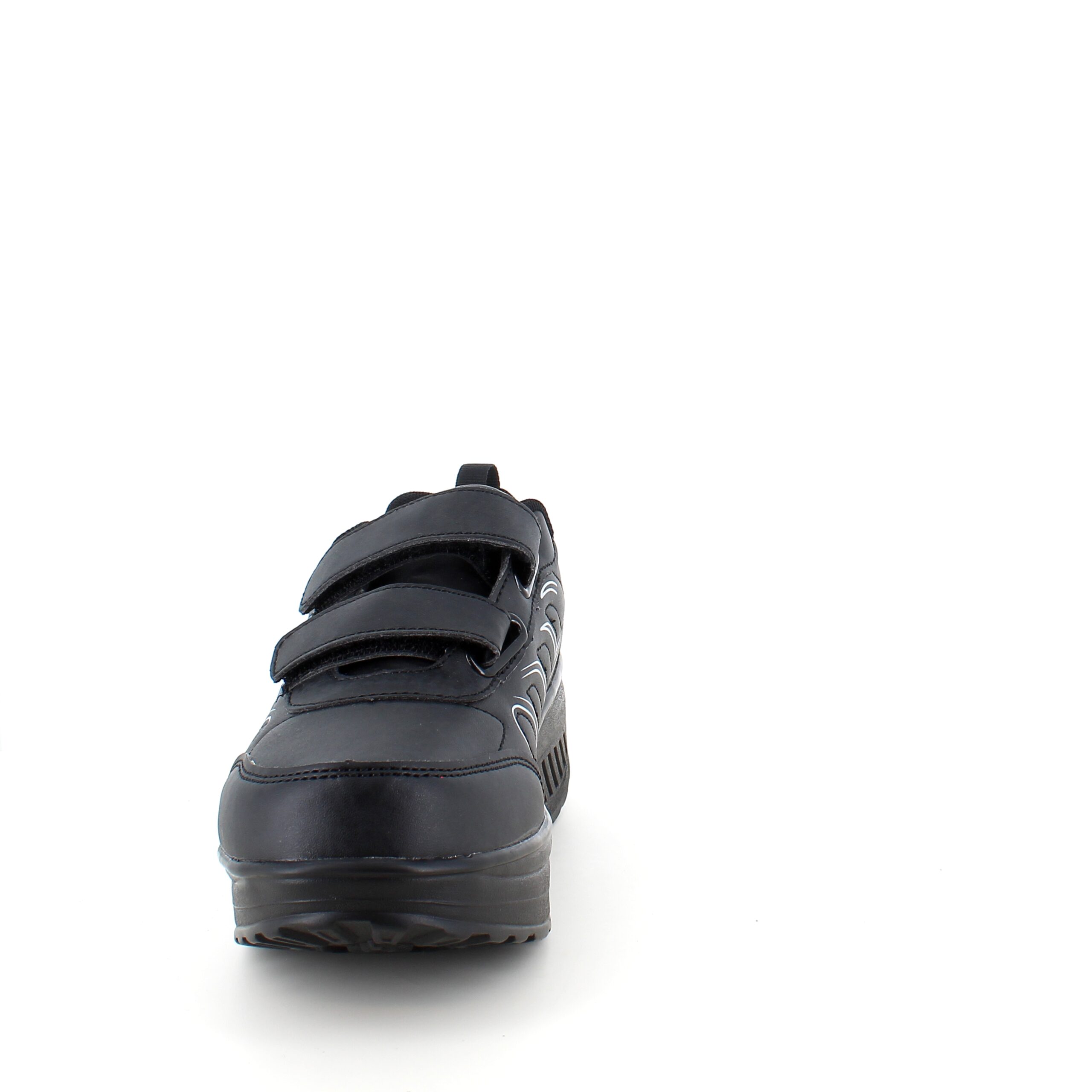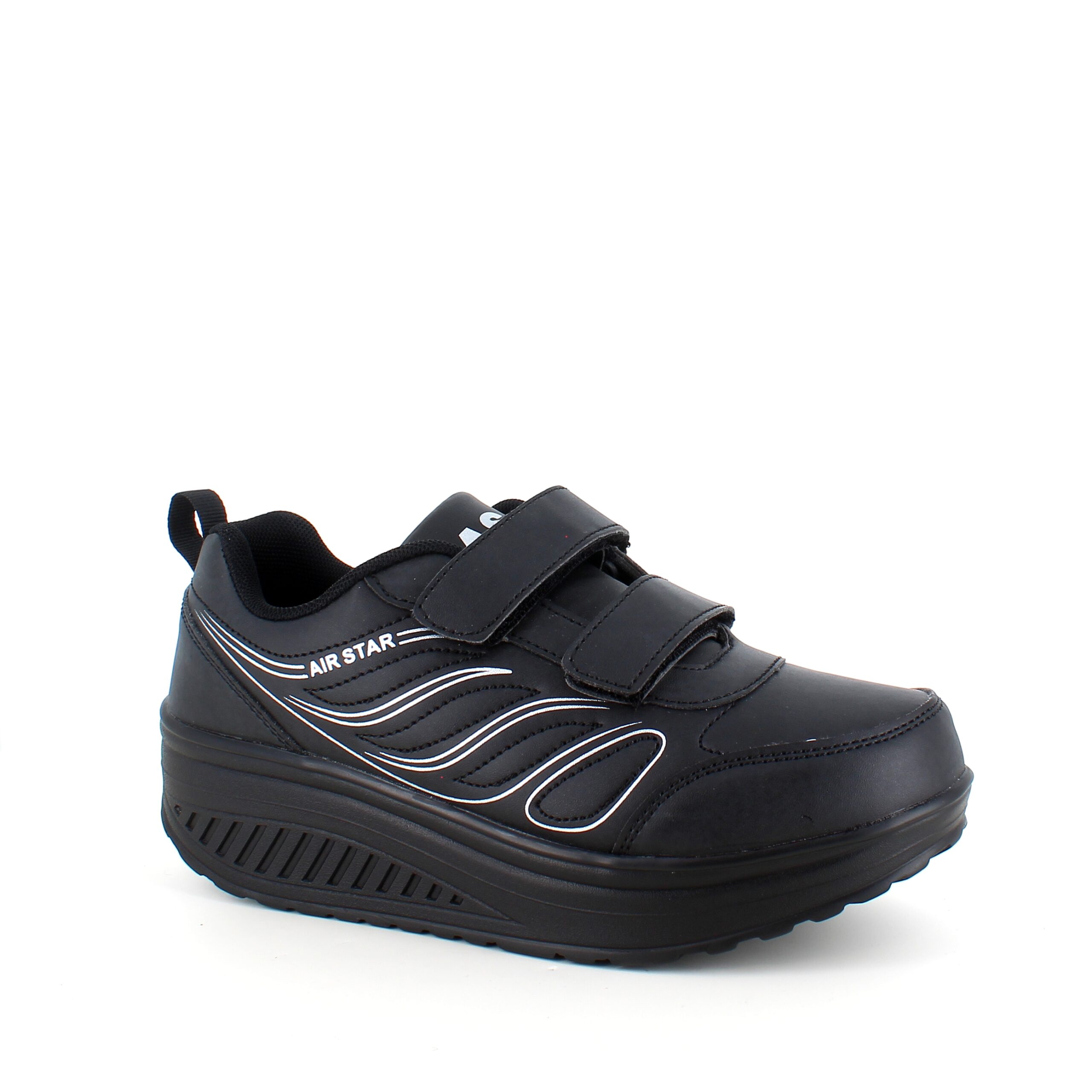 Sort sportssko med borrelåslukning og svingbar såle.