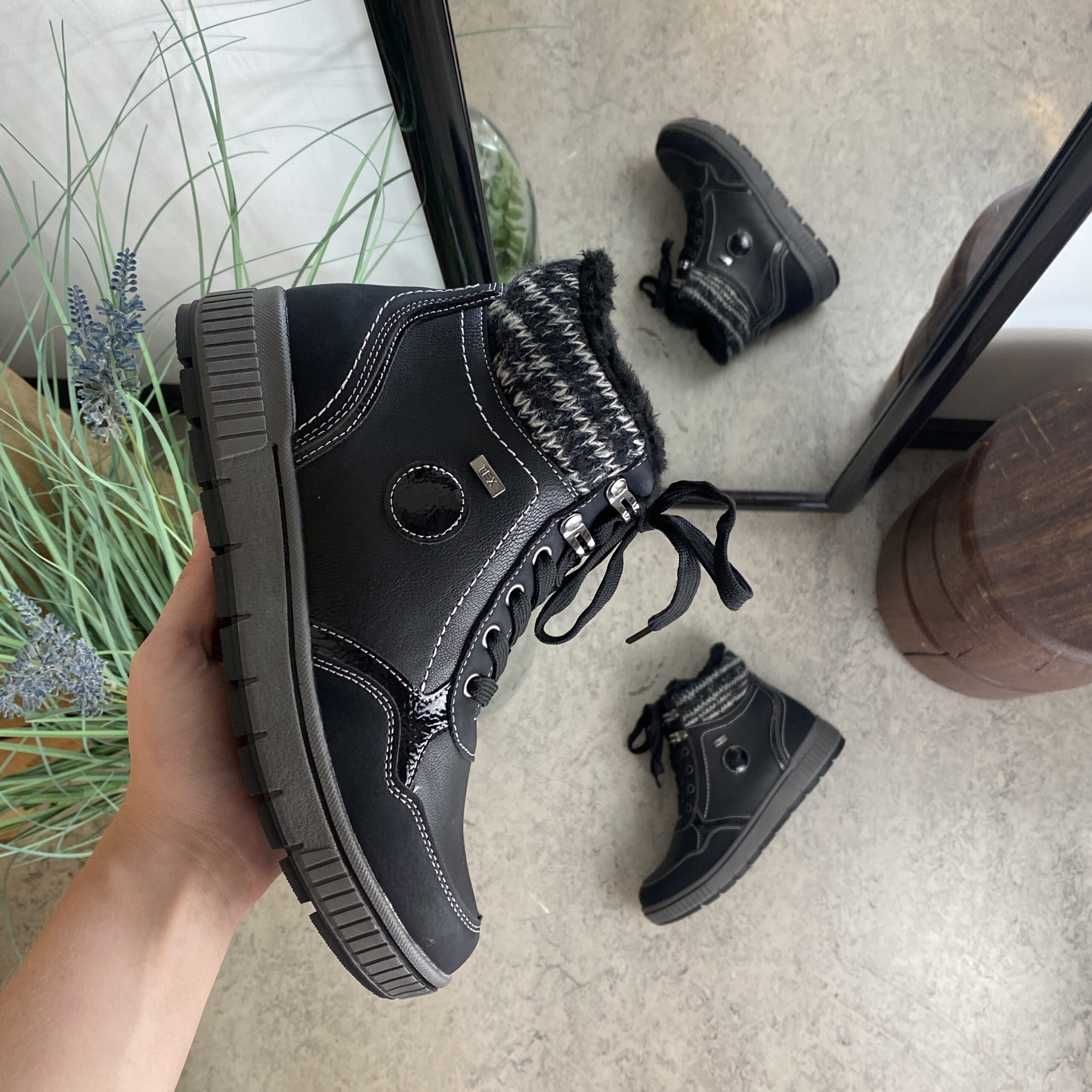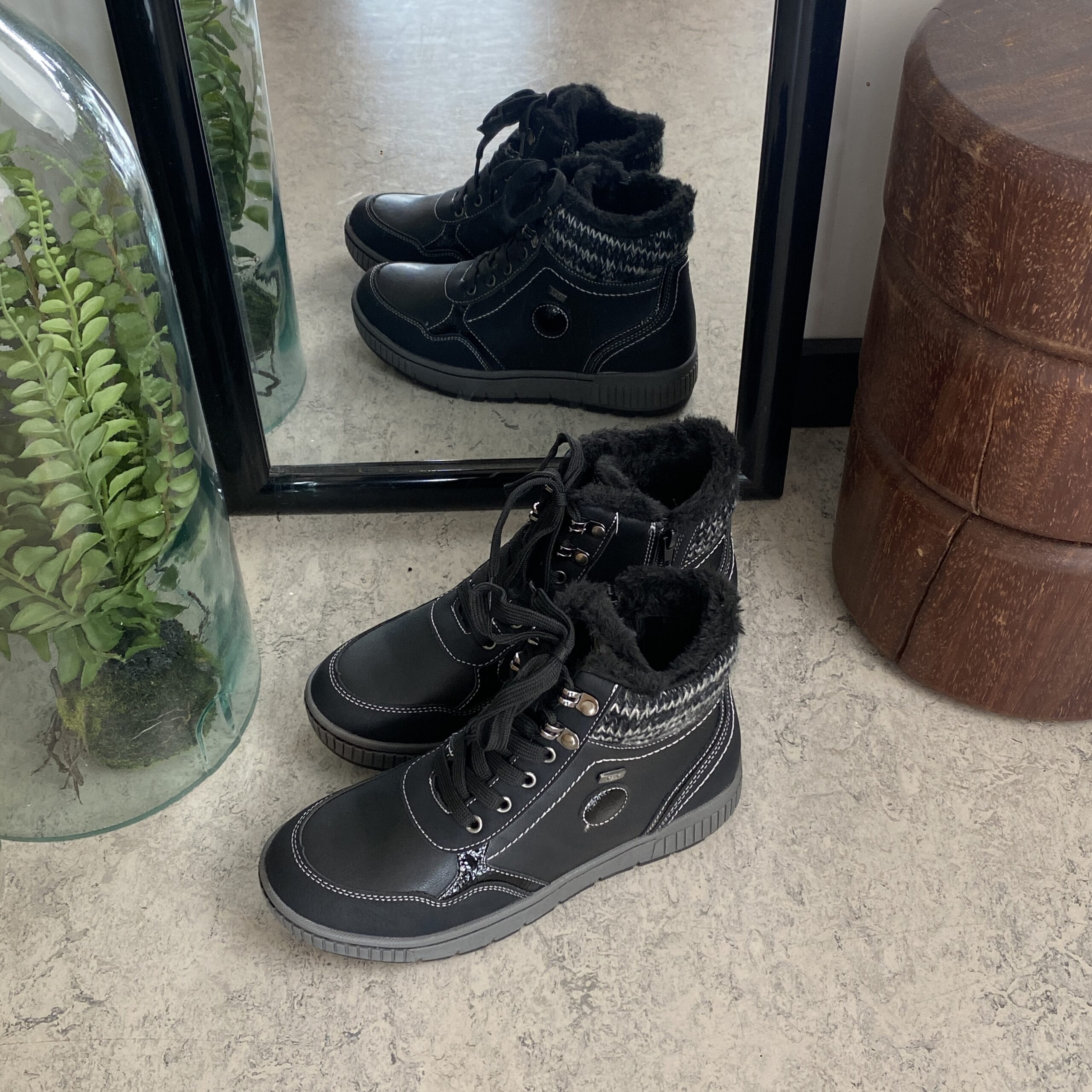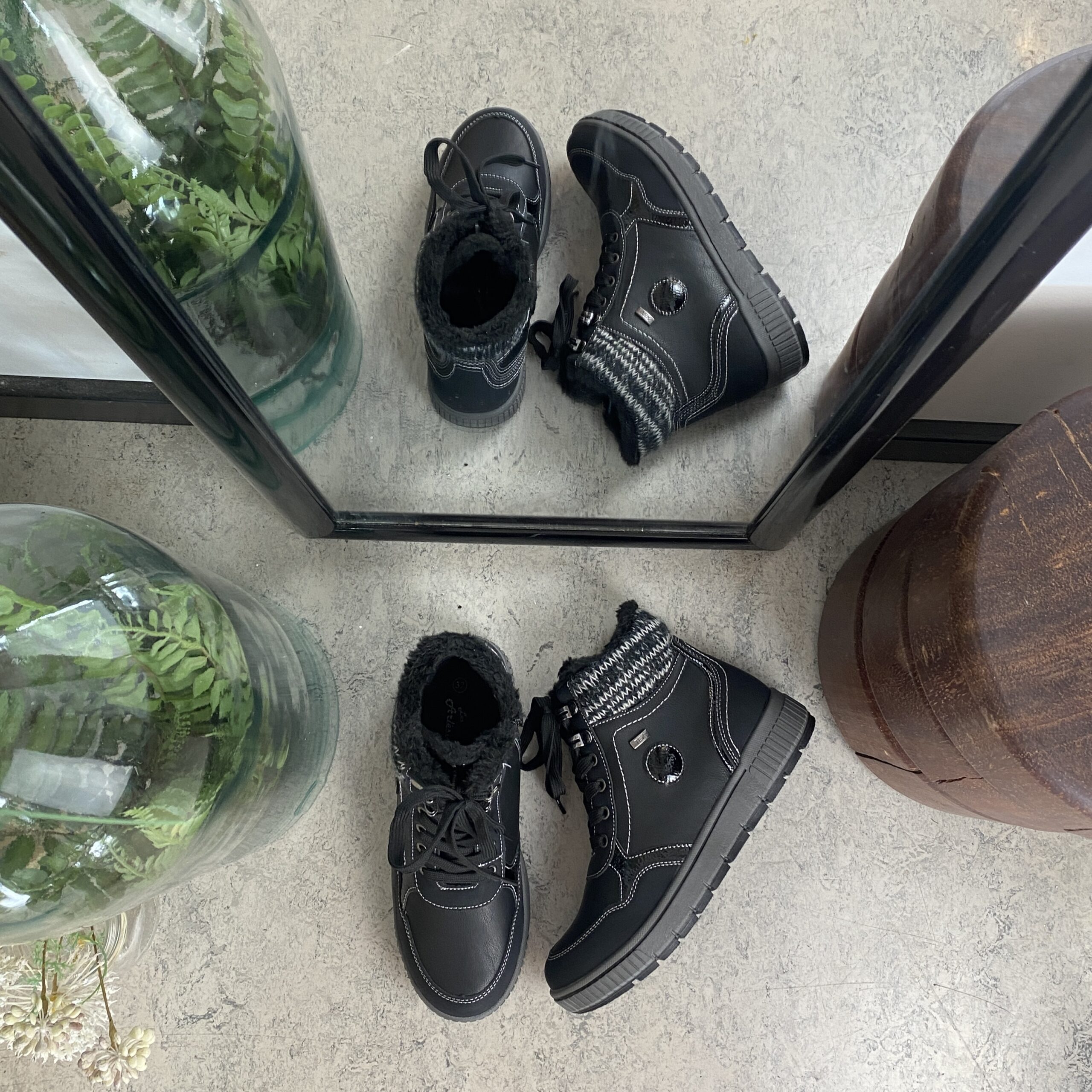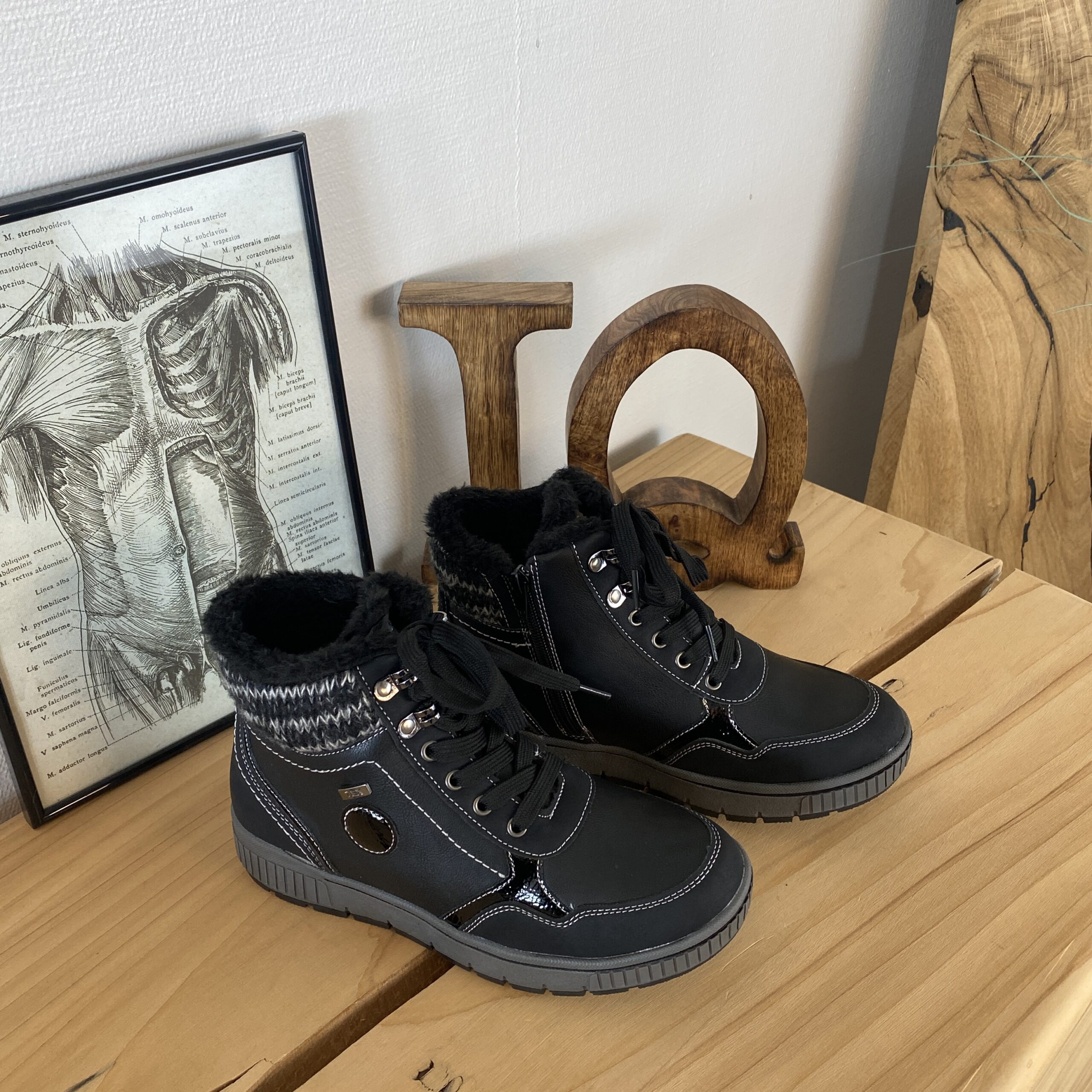 Vinterstøvel i svart, med strikket detalj på skaftet.