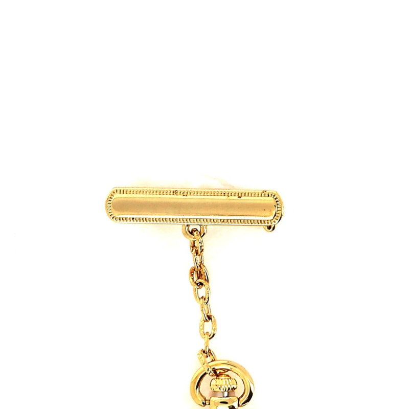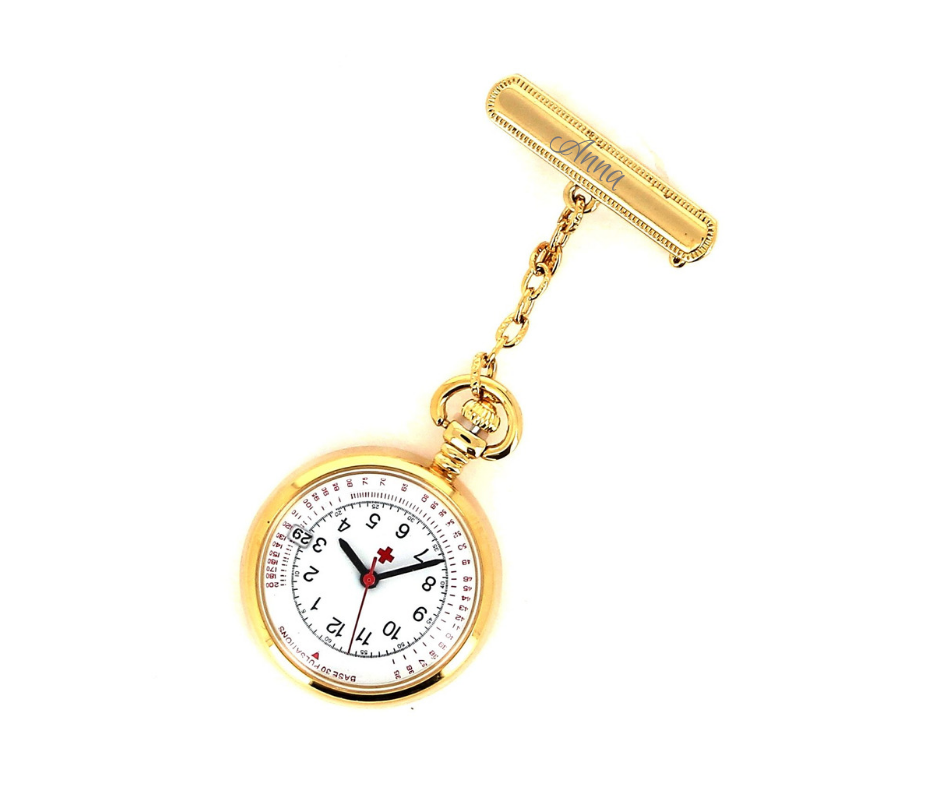 Flott sykepleieklokke i guldtone med gravering. Denne sykepleieklokken har datofelt i urskiven, hvilket gjør det enkelt å se datoen når det skal skrives journal.