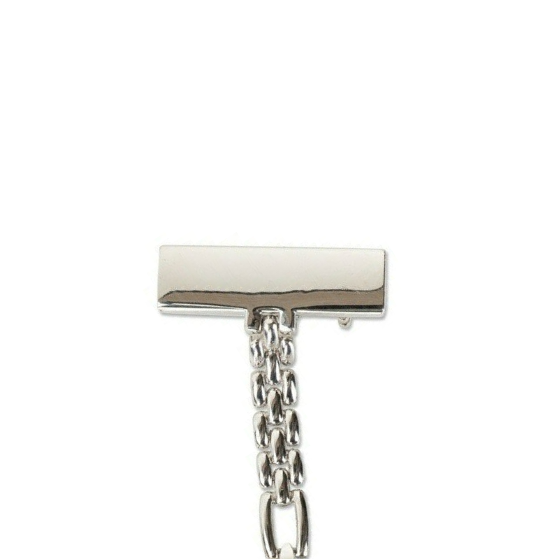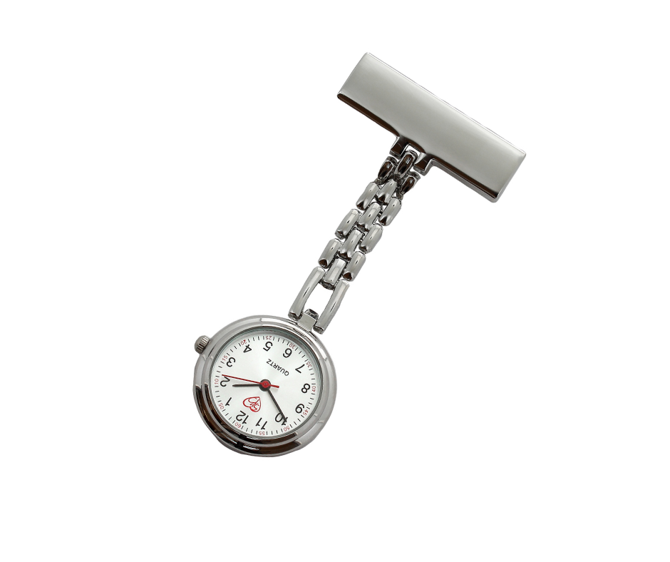 Nøytralt sykepleierklokke med en medium lenke og med rund urskive. Klokken er en av Sykepleiebutik.no sine mest solgte sykepleierklokker. Den er 8 cm lang og 3 cm bred, og den sitter godt fast på kittelen din.