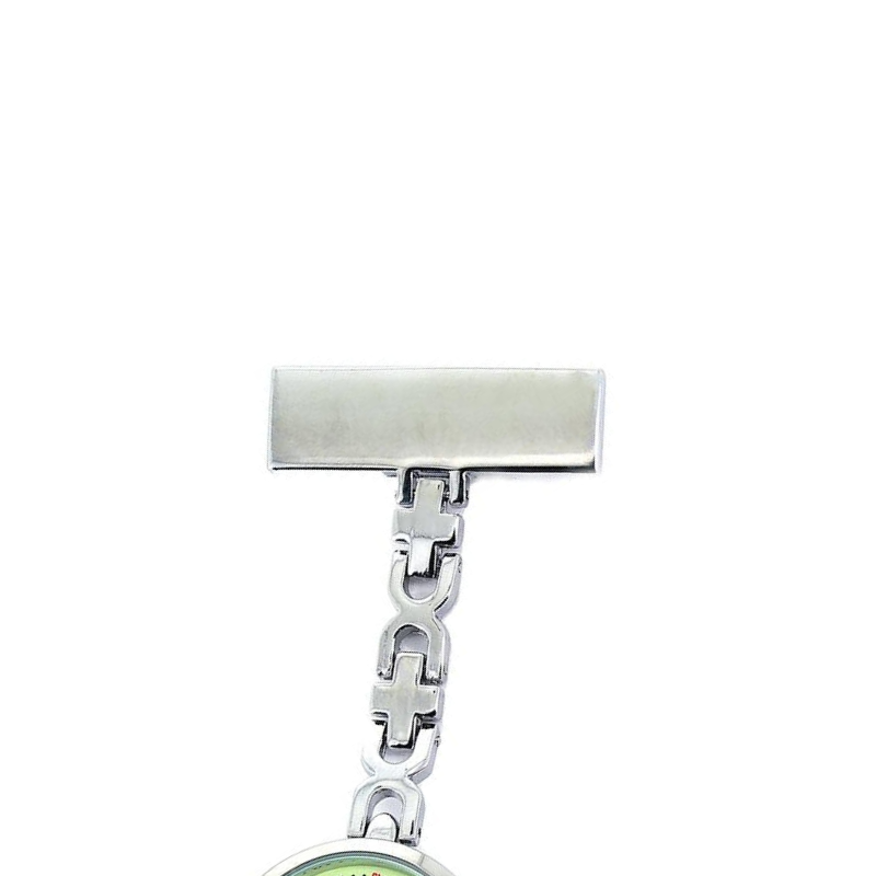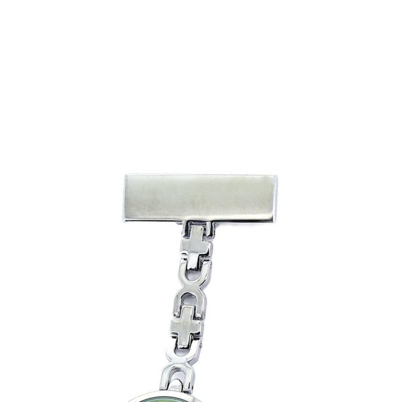 Sykepleieur med kjede med gravering. Sykepleieuret er i stål med valgfri gravering. Sykepleiebutik.no anbefaler gravering av maks. 14 bokstaver.