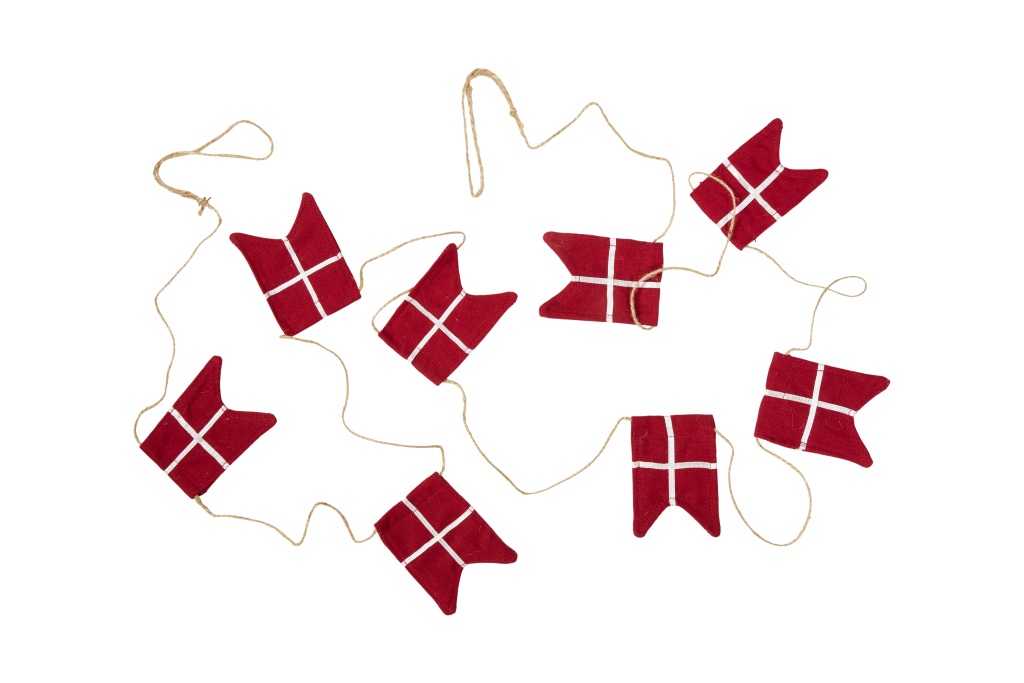 Flaggirlander i stoff med 8 flate flagg og bastbånd imellom.