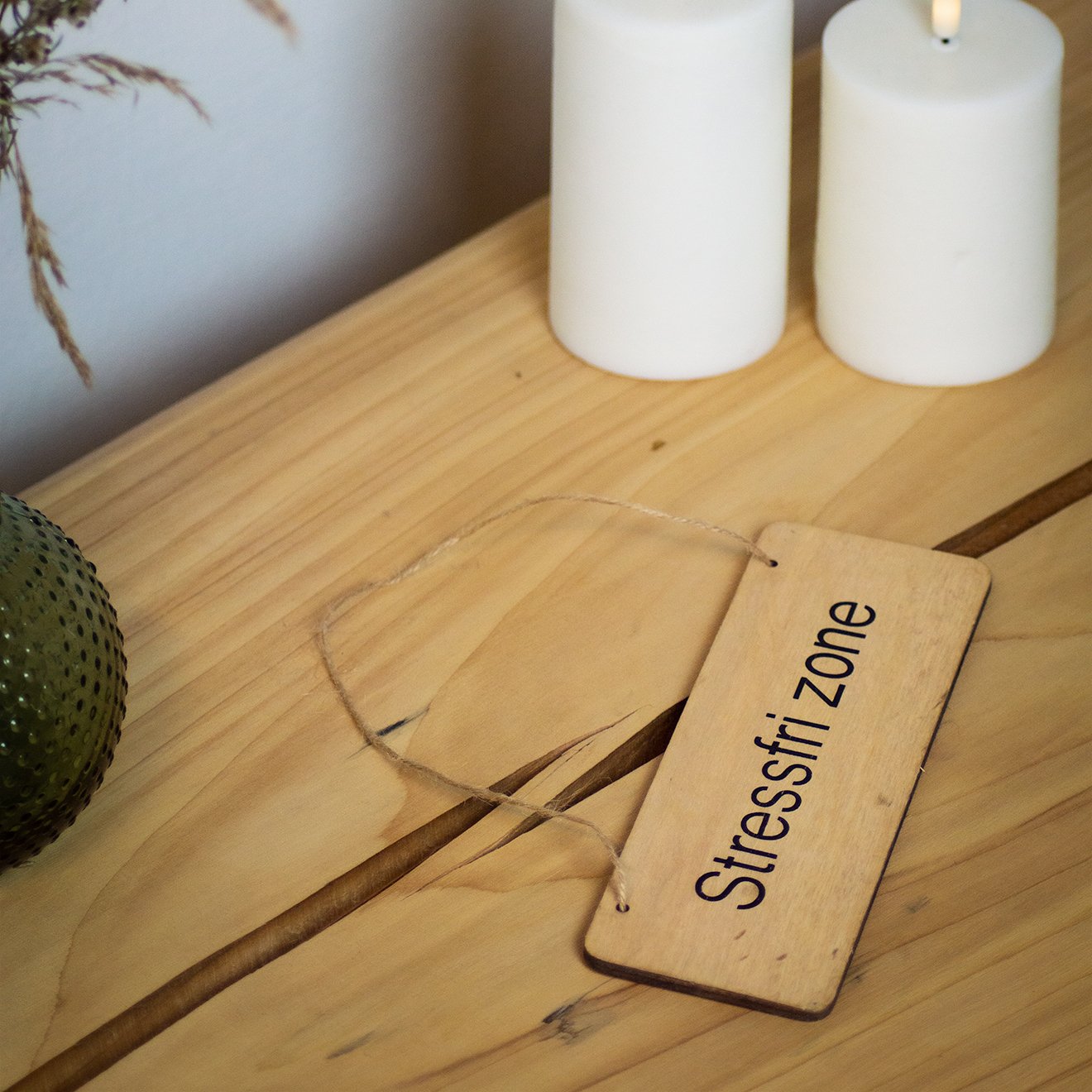 Gi deg selv eller en venn dette vakre treskiltet som en påminnelse om å verdsette øyeblikkene av indre fred og velvære. “Stressfri Sone” skiltet er en enkel, men kraftfull påminnelse om å sette deg selv først, og skape et rom fylt med ro og harmoni.